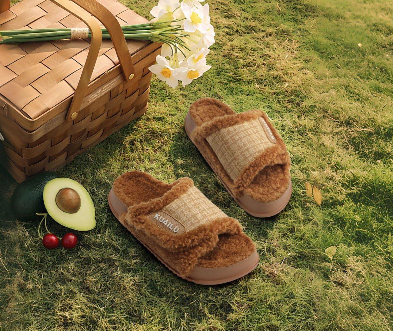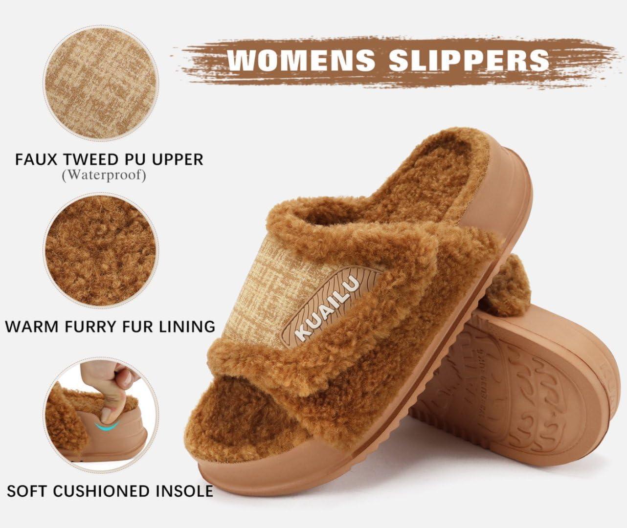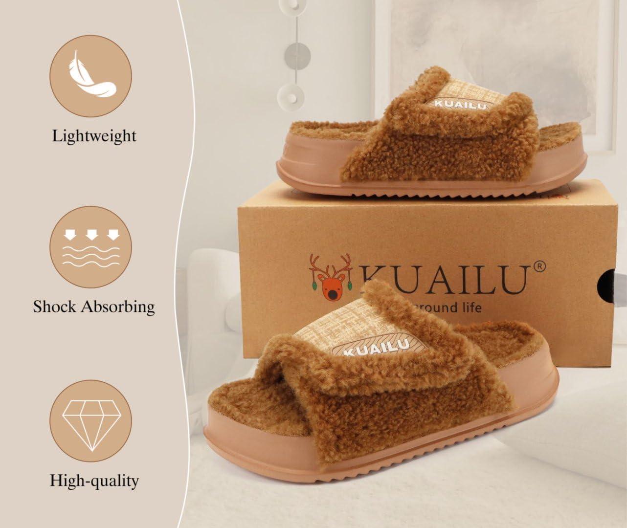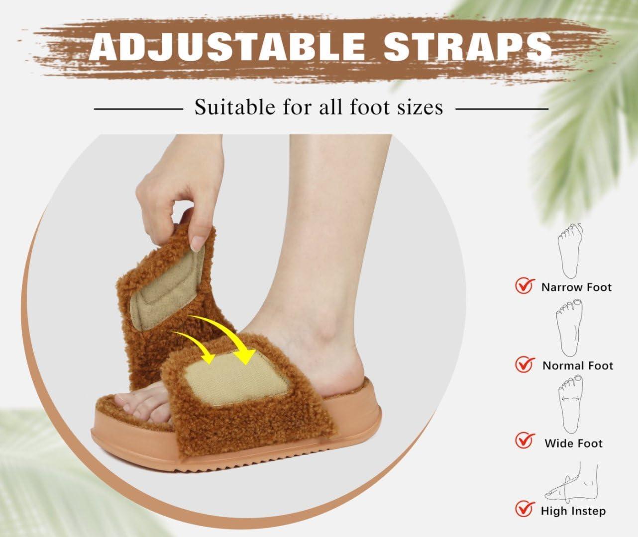 KuaiLu Cushion Slippers For Women with Orthotic Arch Support Wide Adjustable Open Toe Furry Fur Sandals Warm Teddy Fleece Recovery Slides Slip On House Shoes Indoor Outdoor Outfits(Camel Brown)