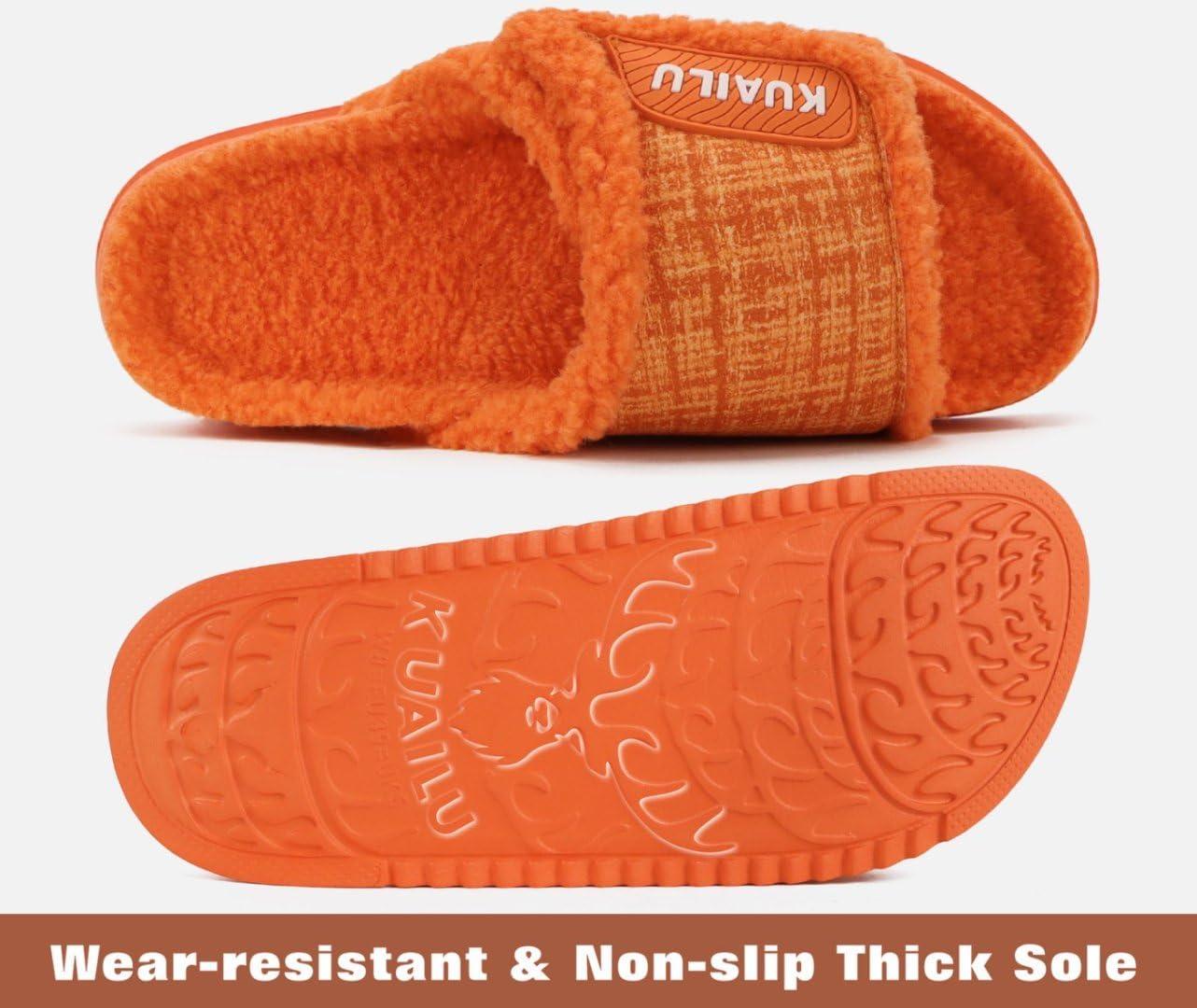 KuaiLu Cushion Slippers For Women with Orthotic Arch Support Wide Adjustable Open Toe Flatform Furry Fur Sandals Warm Teddy Fleece Recovery Slides Slip On House Shoes Indoor Outdoor, Orange US8
