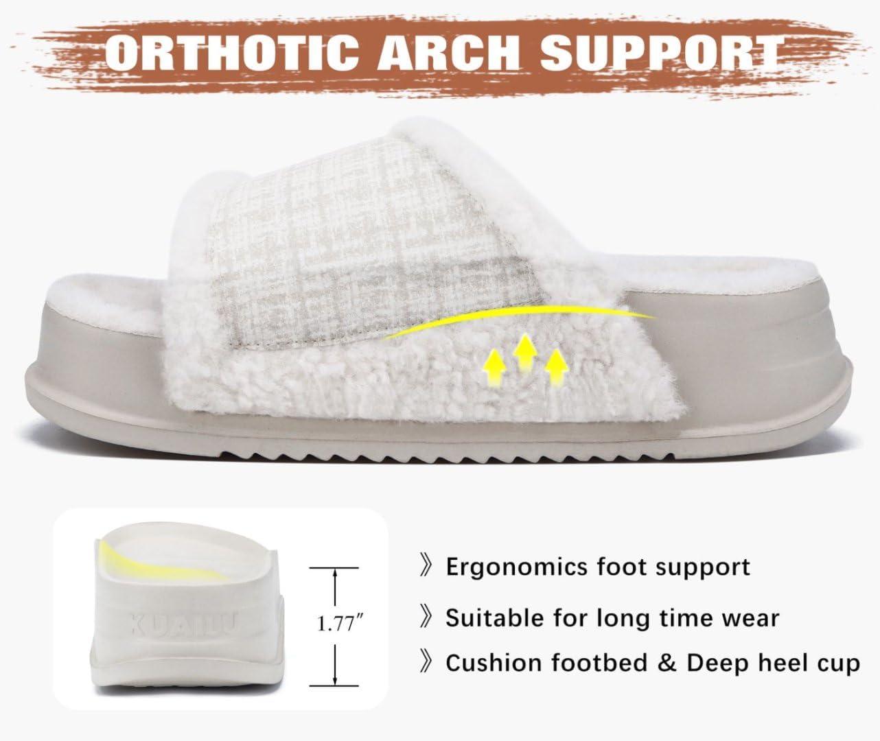 KuaiLu Cushion Slippers For Women with Orthotic Arch Support Wide Adjustable Open Toe Furry Fur Sandals Warm Teddy Fleece Recovery Slides Slip On House Shoes Indoor Outdoor Outfits(White)