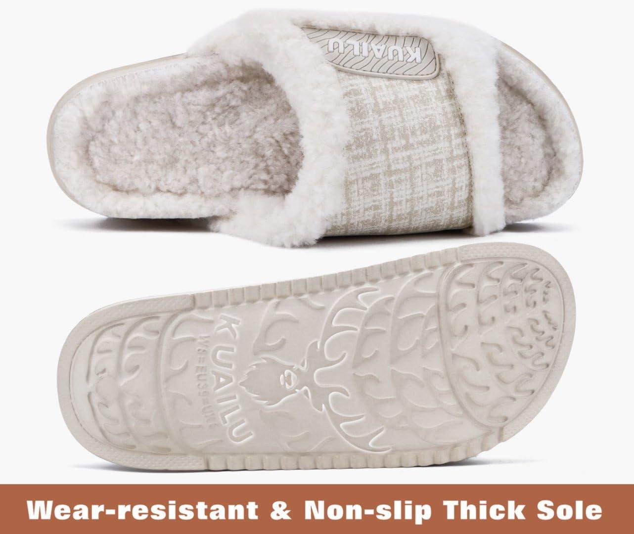 KuaiLu Cushion Slippers For Women with Orthotic Arch Support Wide Adjustable Open Toe Furry Fur Sandals Warm Teddy Fleece Recovery Slides Slip On House Shoes Indoor Outdoor Outfits(Khaki)