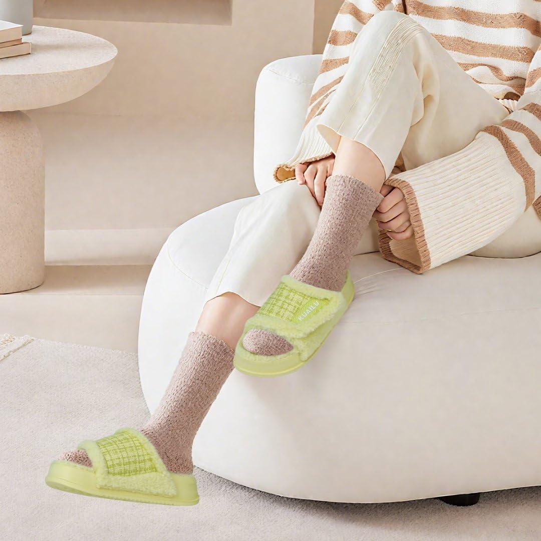 KuaiLu Cushion Slippers For Women with Orthotic Arch Support Wide Adjustable Open Toe Furry Fur Sandals Warm Teddy Fleece Recovery Slides Slip On House Shoes Indoor Outdoor Outfits(Yellow-green)