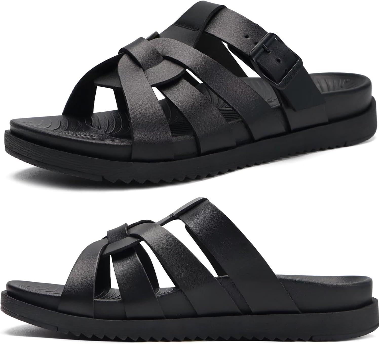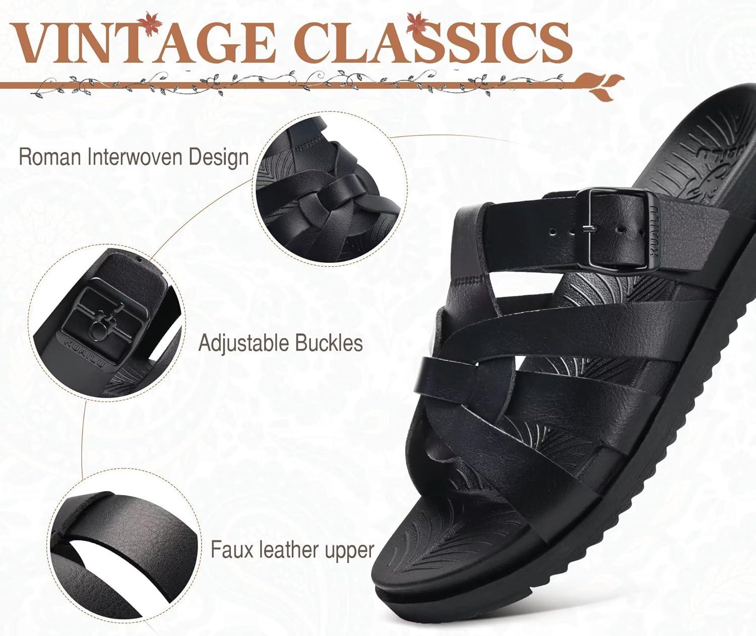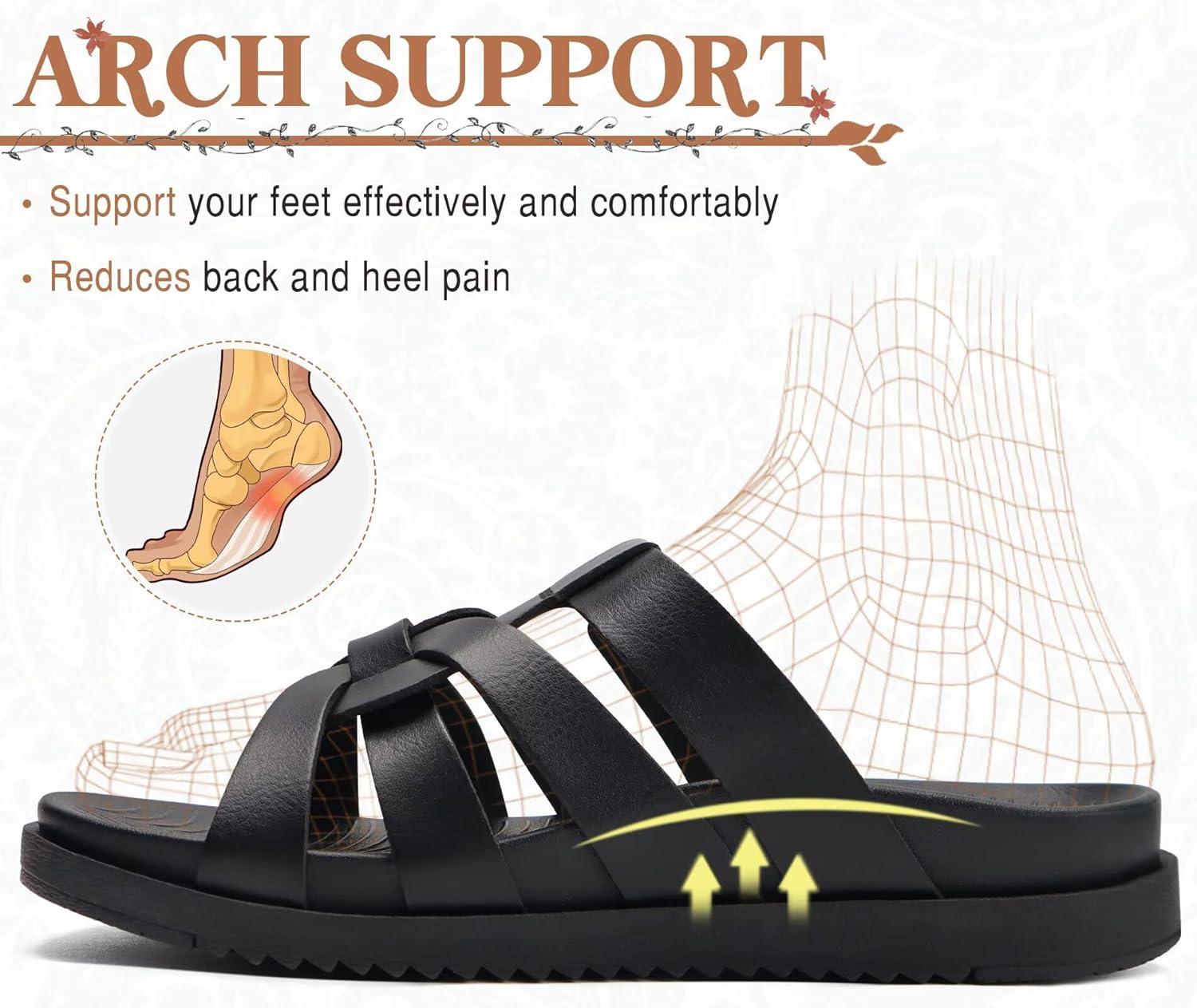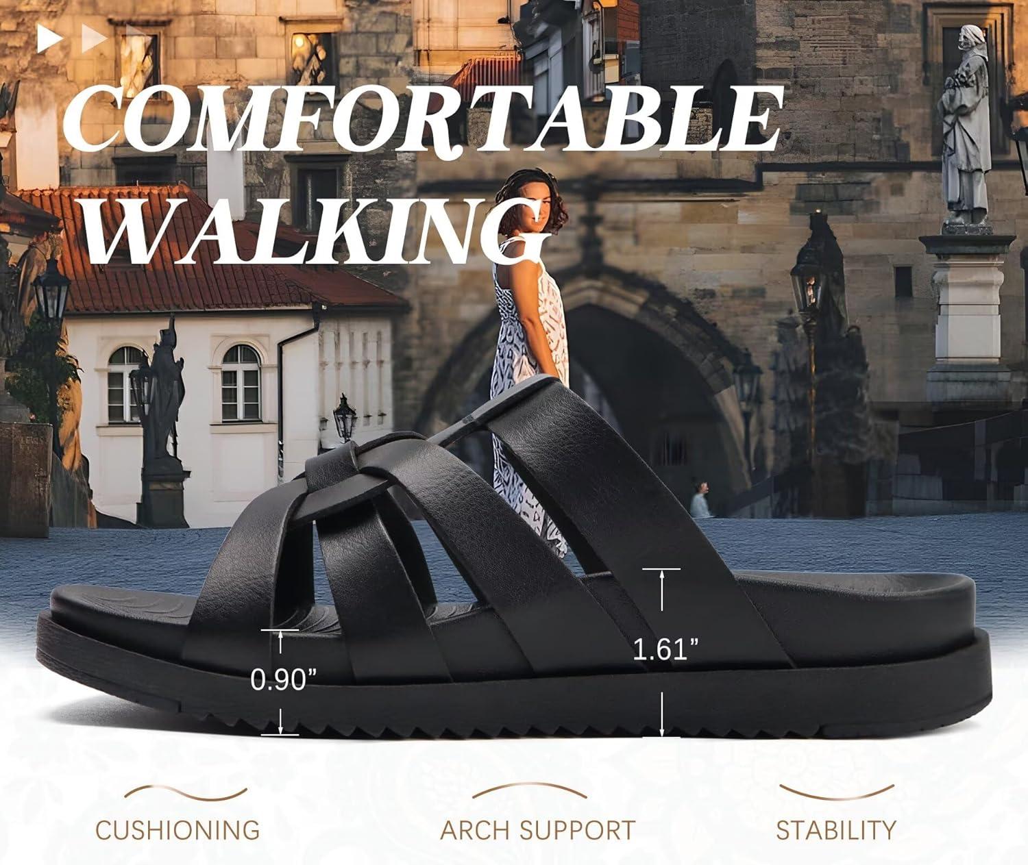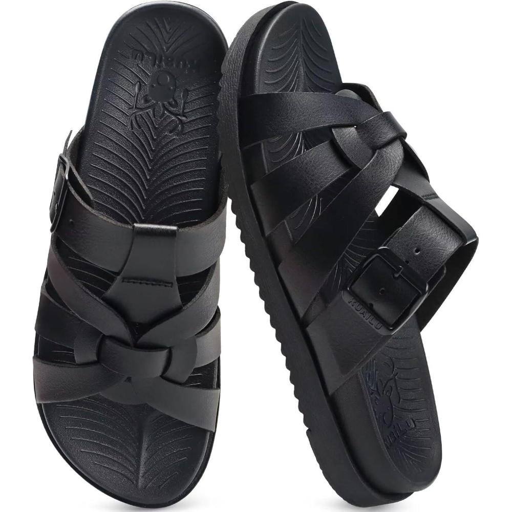 KuaiLu Gladiator Sandals for Women with Comfortable Arch Support Summer Beach Walking Fisherman Slides Boho Outfits Slip on Cushion Shoes Indoor Outdoor(Black)