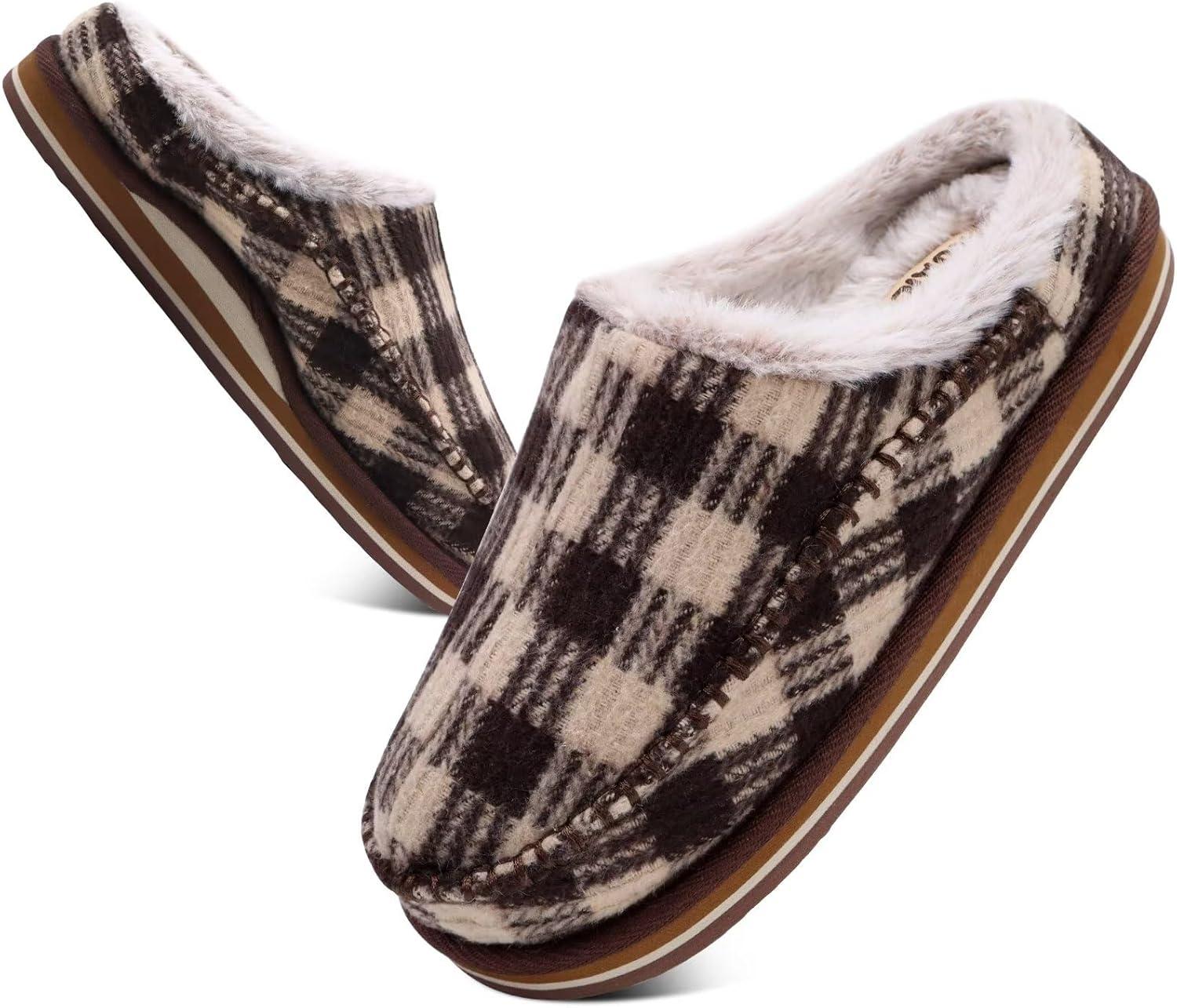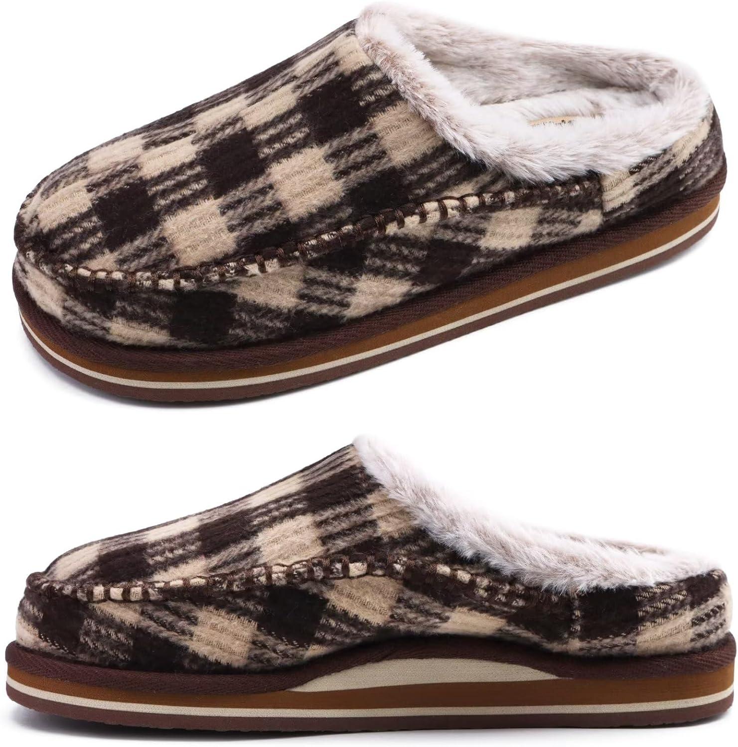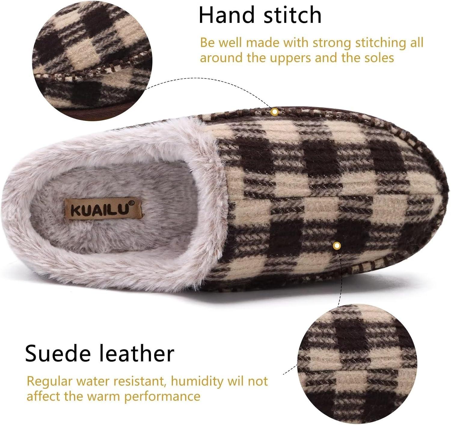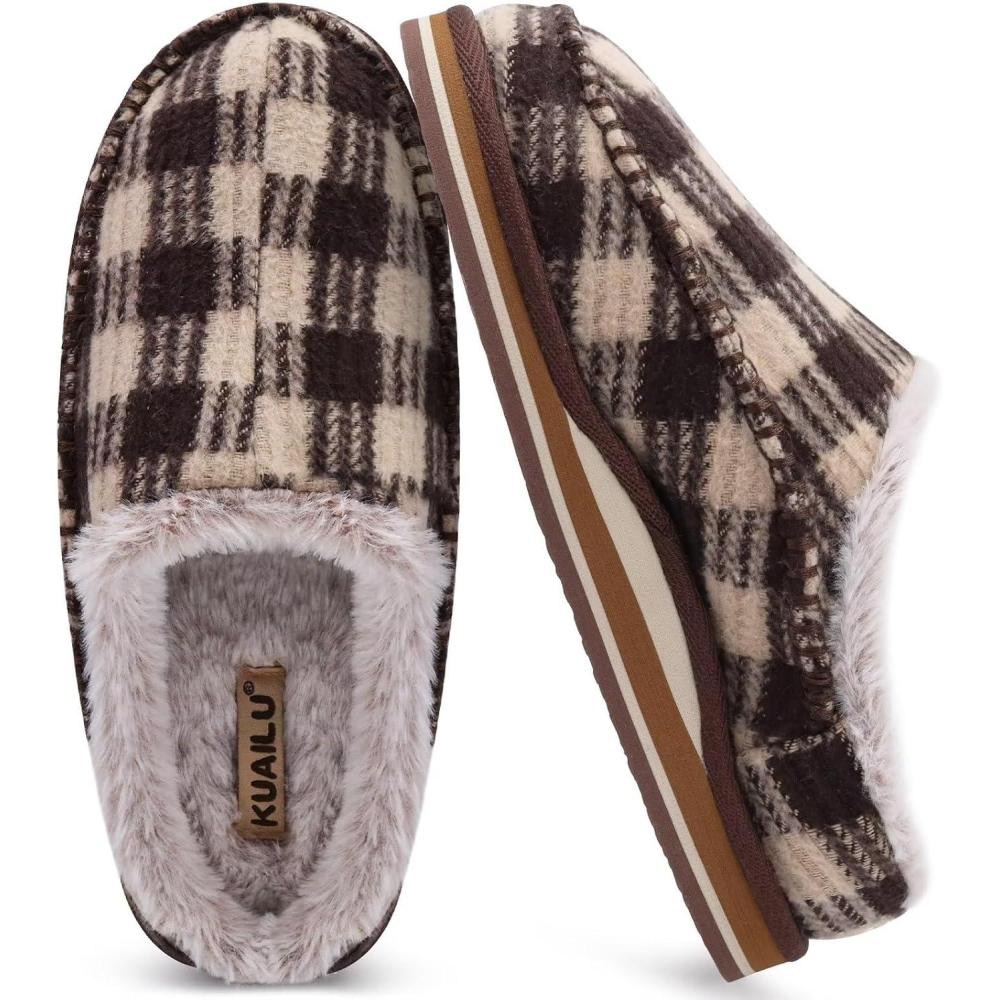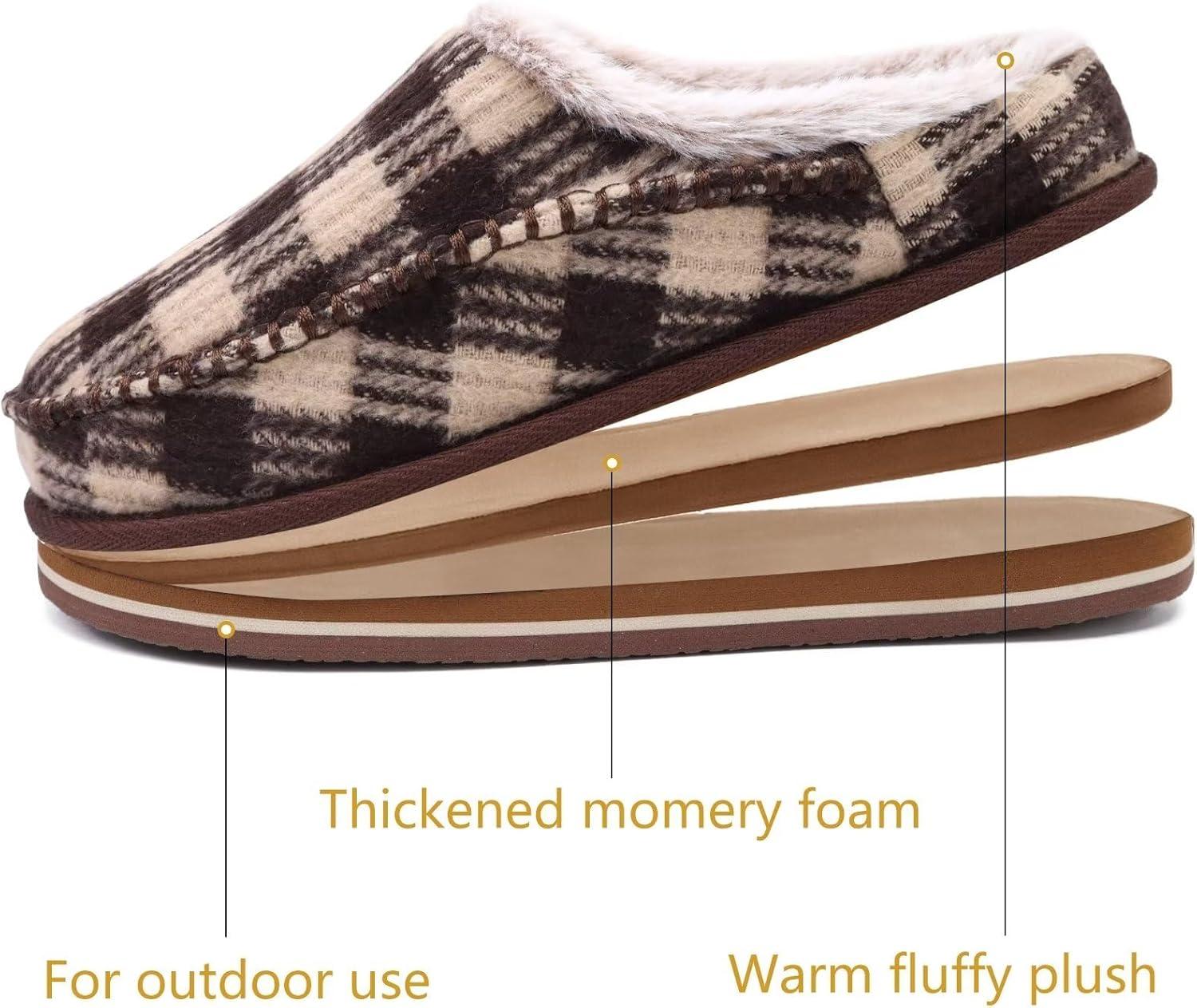 KuaiLu Mens Clog Slippers with Arch Support Suede Faux Fur Memory Foam Warm House Shoes Comfortable Slip-on Mans Bedroom Indoor Outdoor Slippers Rubber Sole(Borwnkhaki Plaid)