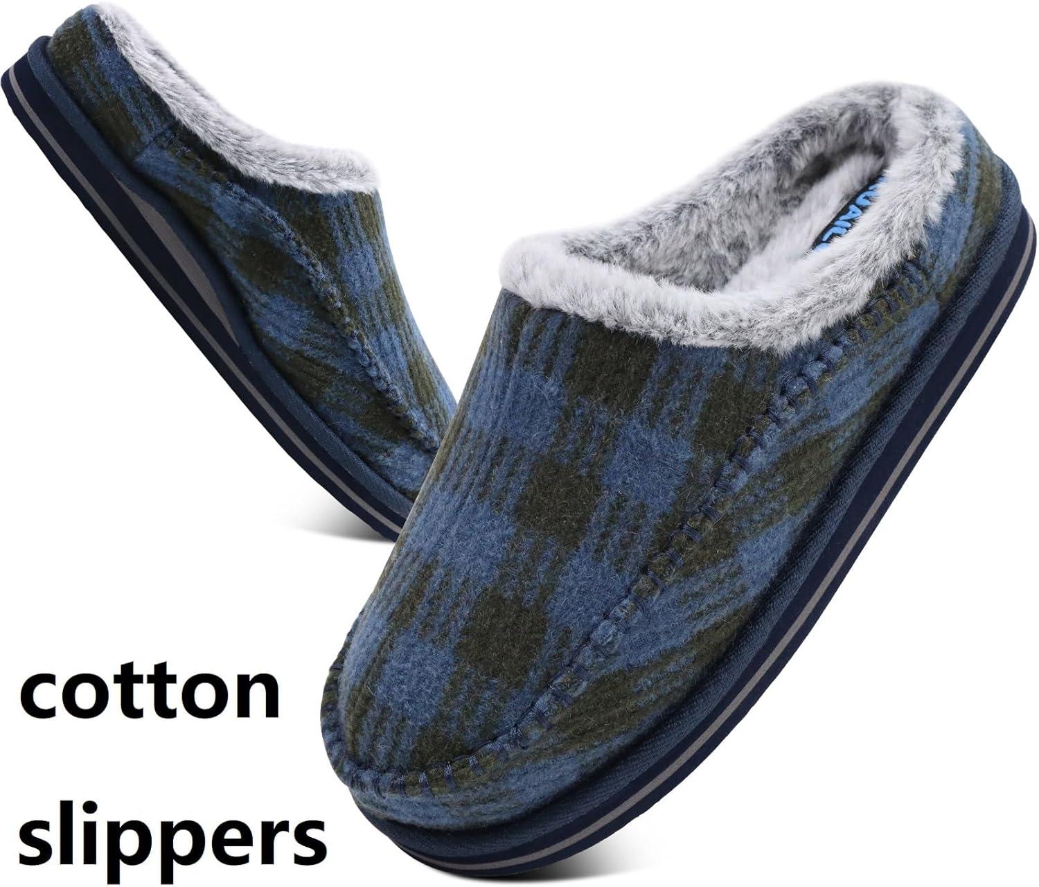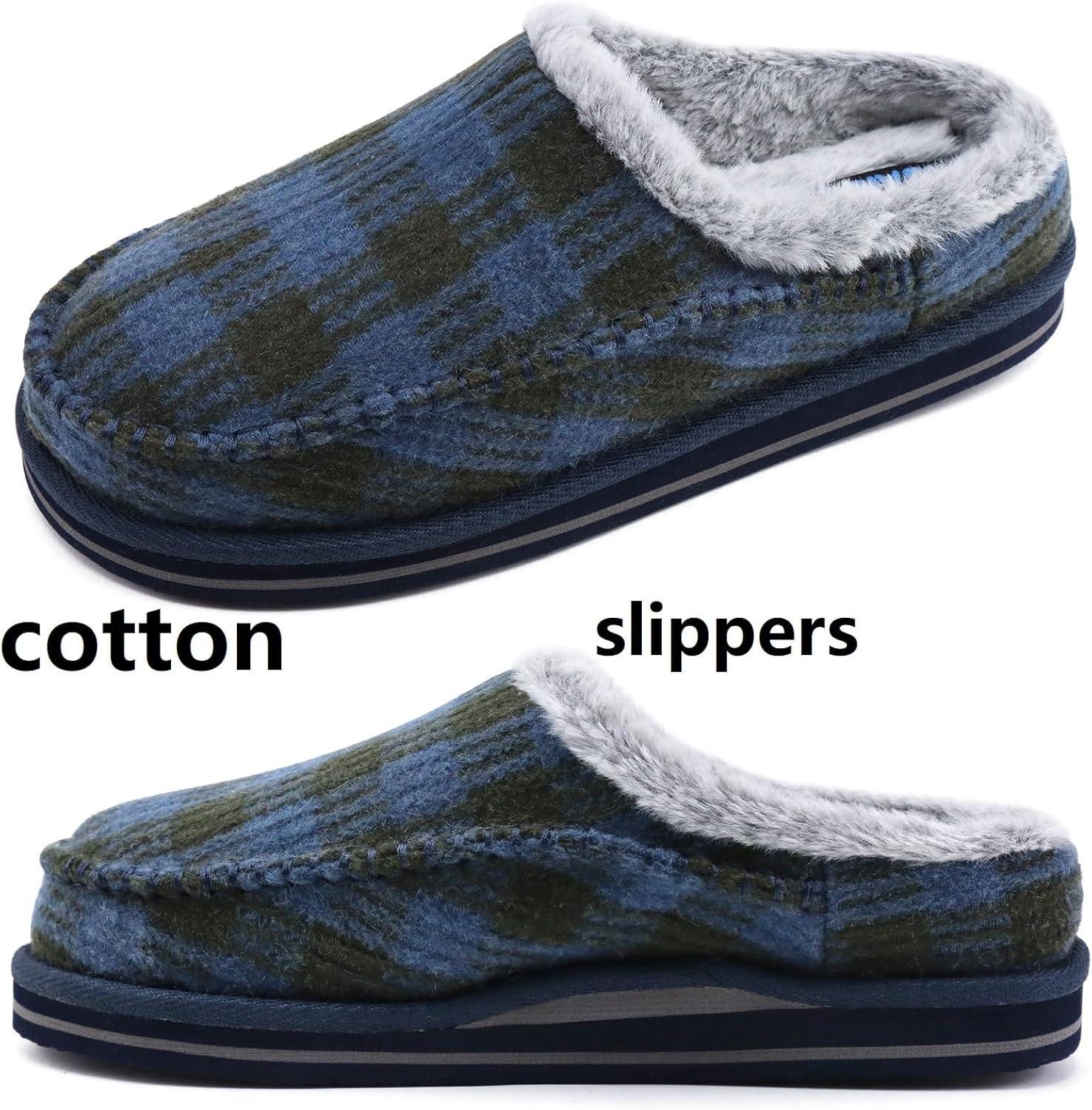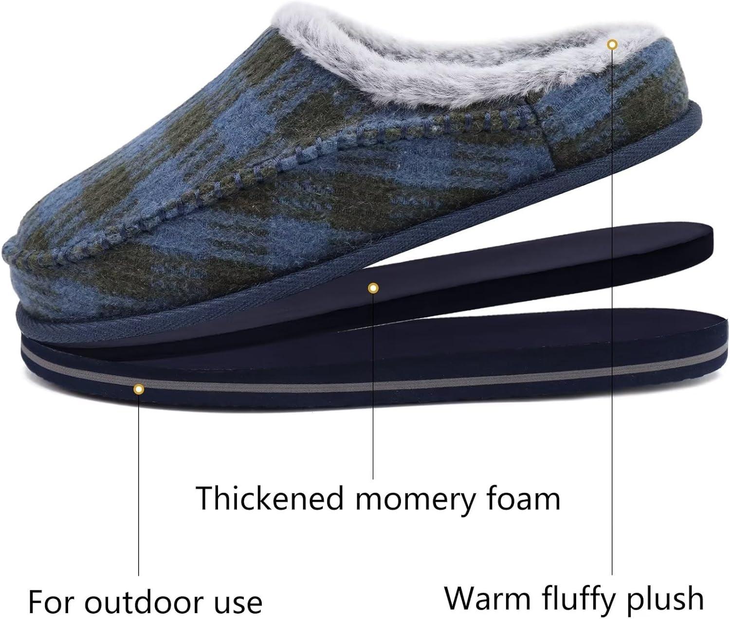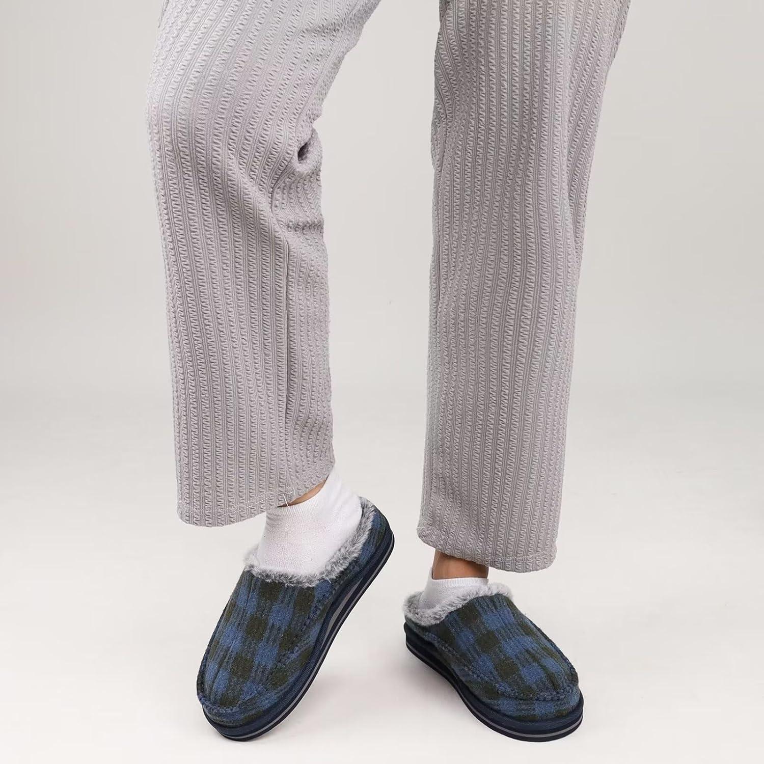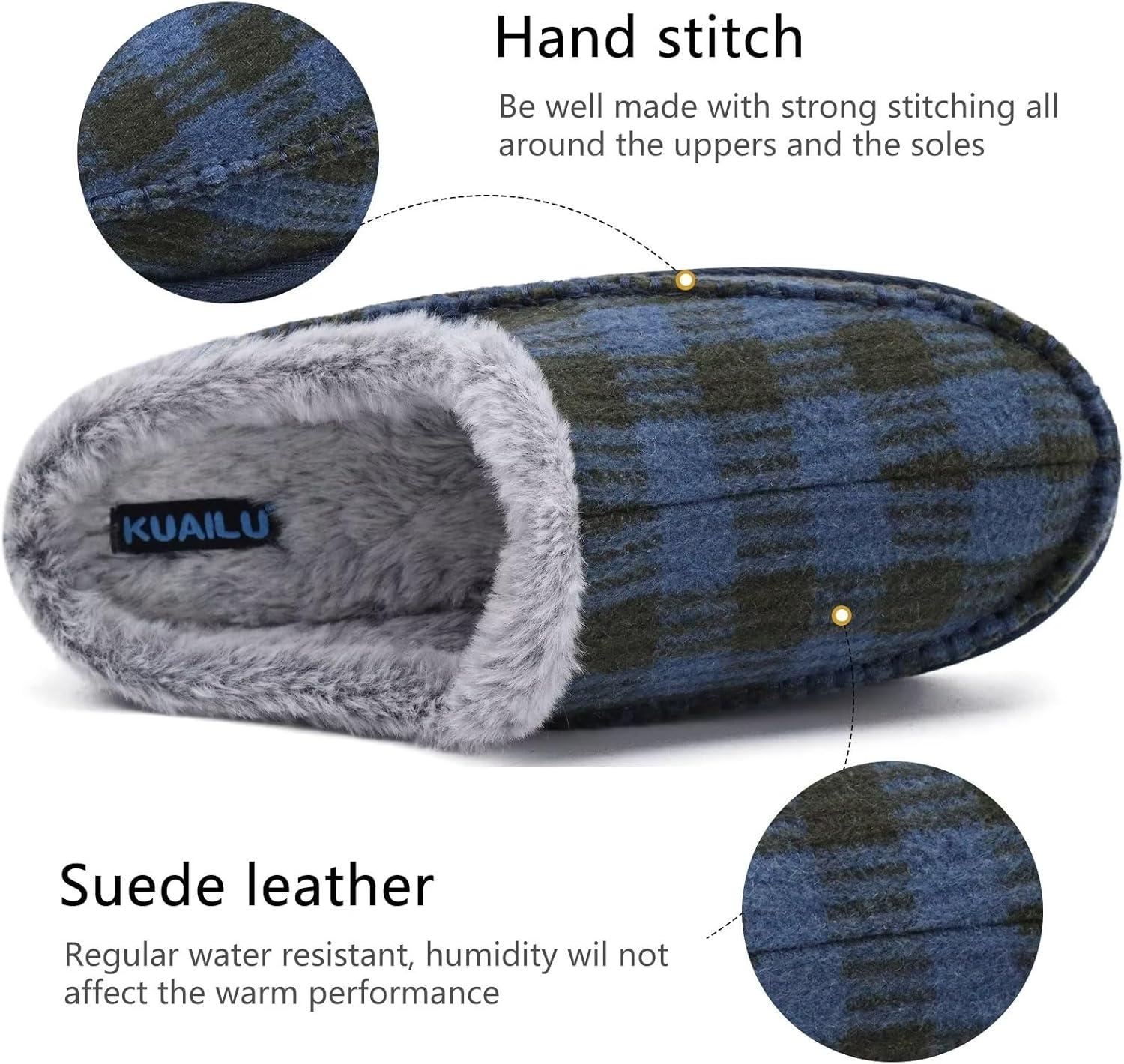 KuaiLu Mens Clog Slippers with Arch Support Suede Faux Fur Memory Foam Warm House Shoes Comfortable Slip-on Mans Bedroom Indoor Outdoor Slippers Rubber Sole(Darkbule Plaid)