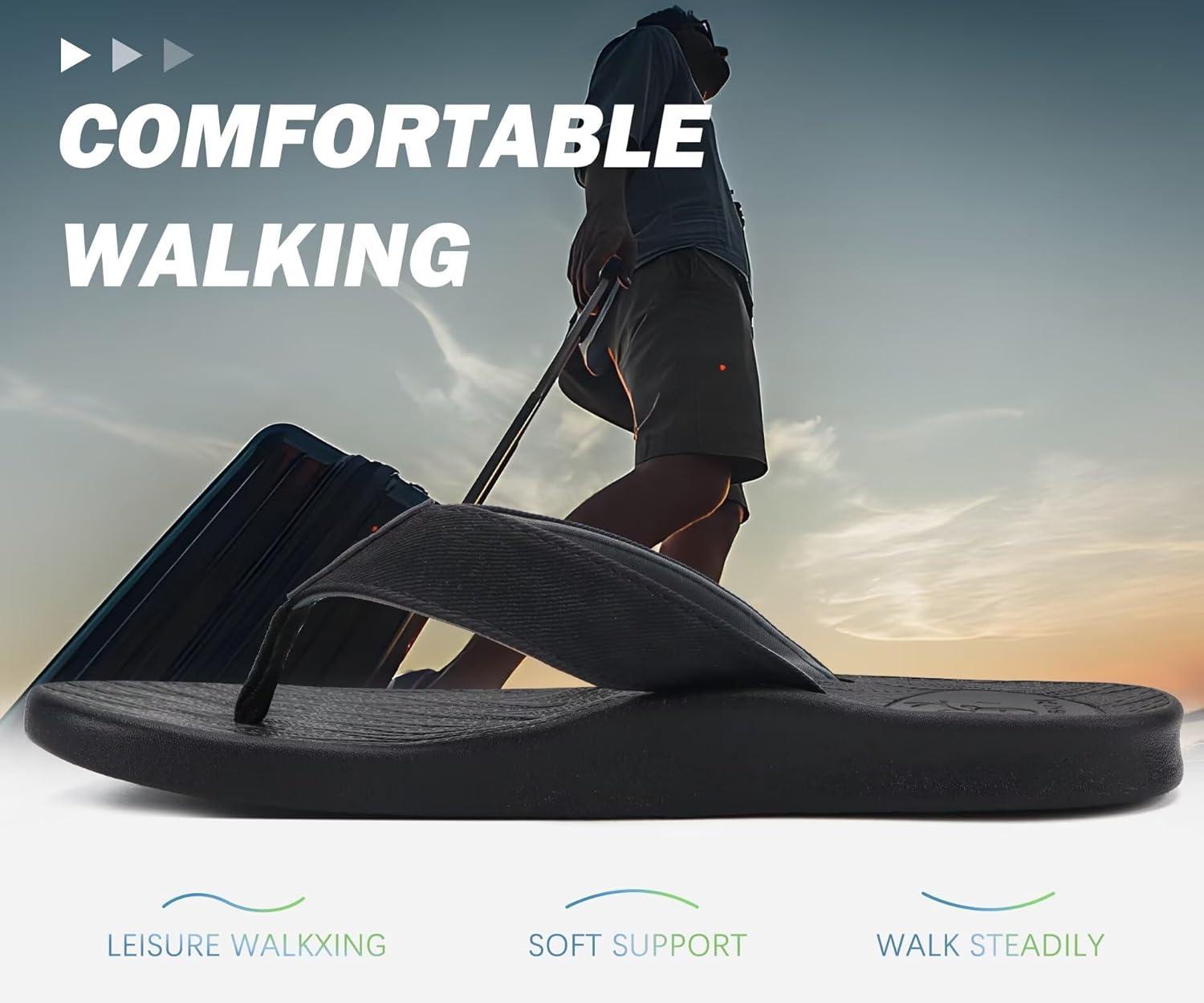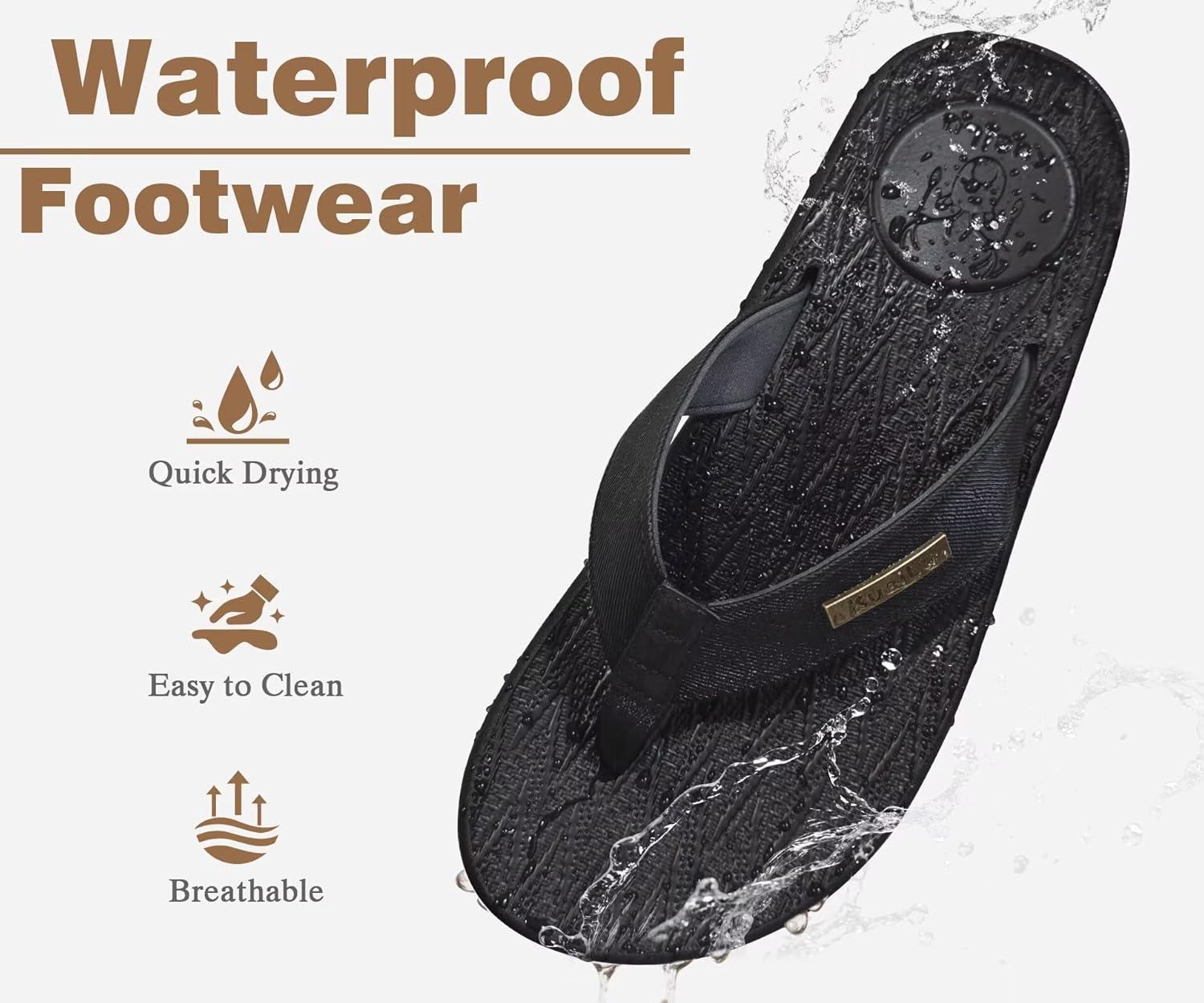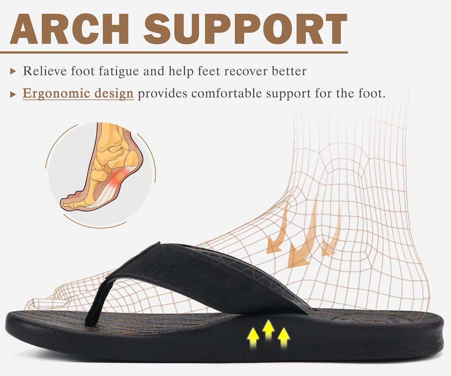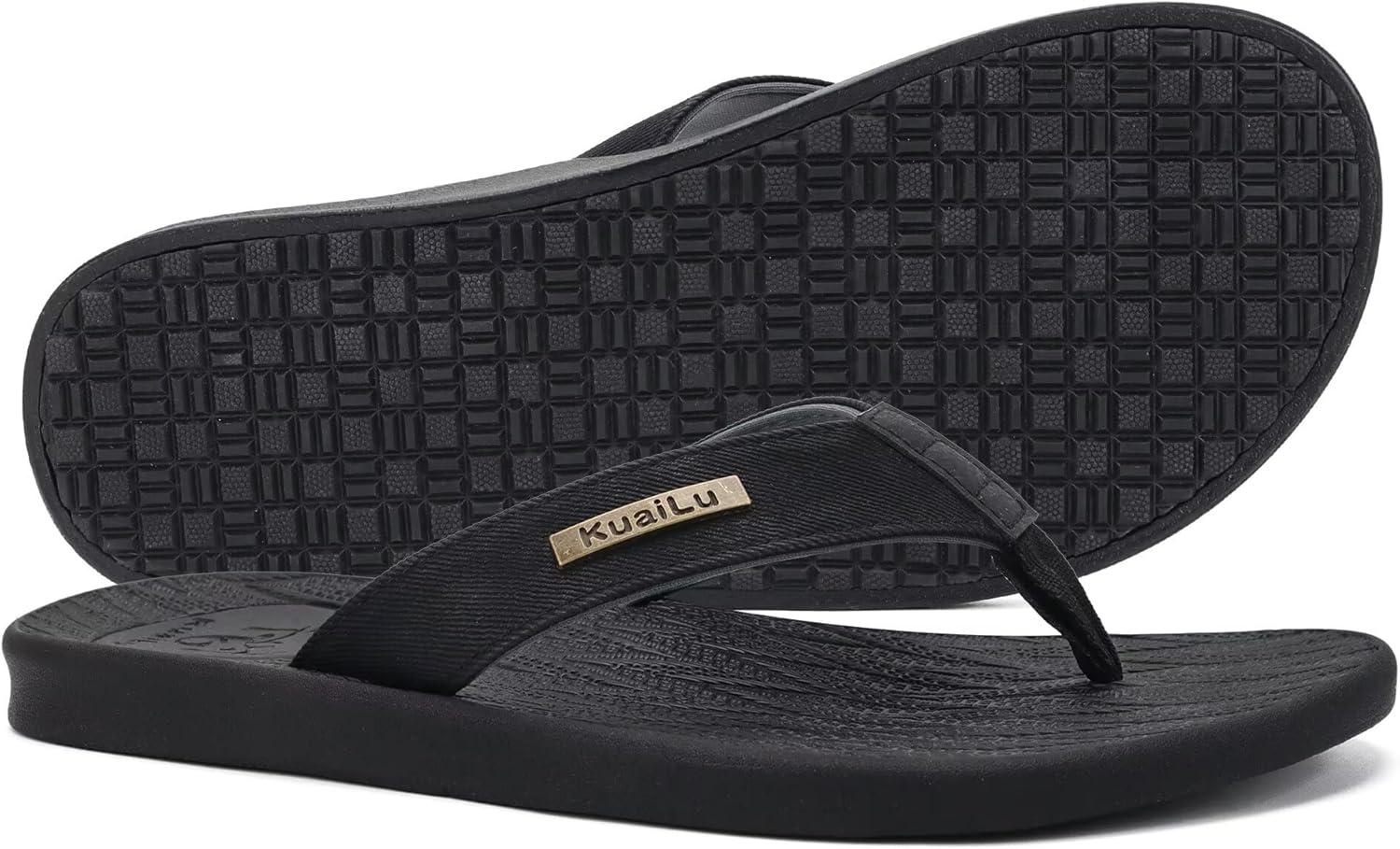 KuaiLu Mens Flip Flops Arch Support Comfortable Summer Beach Thong Sandals Yoga Foam Cushion Slip on Slippers(Pu-black)