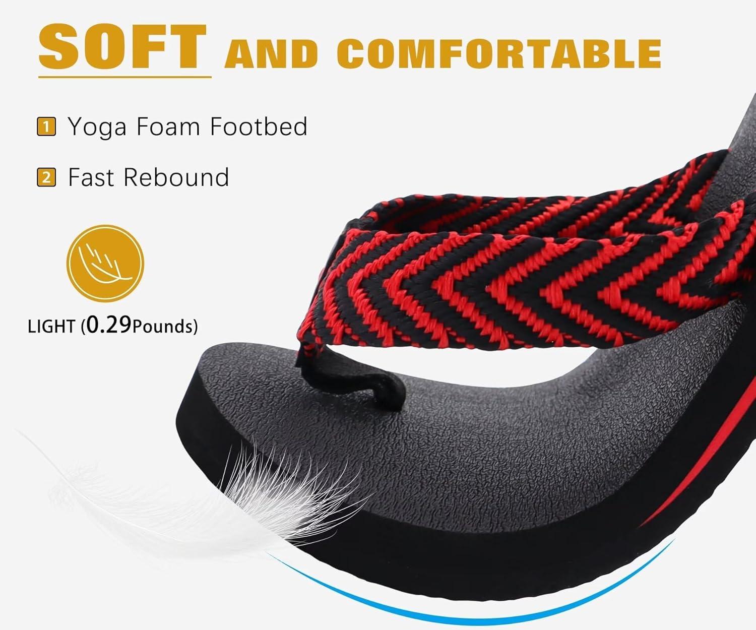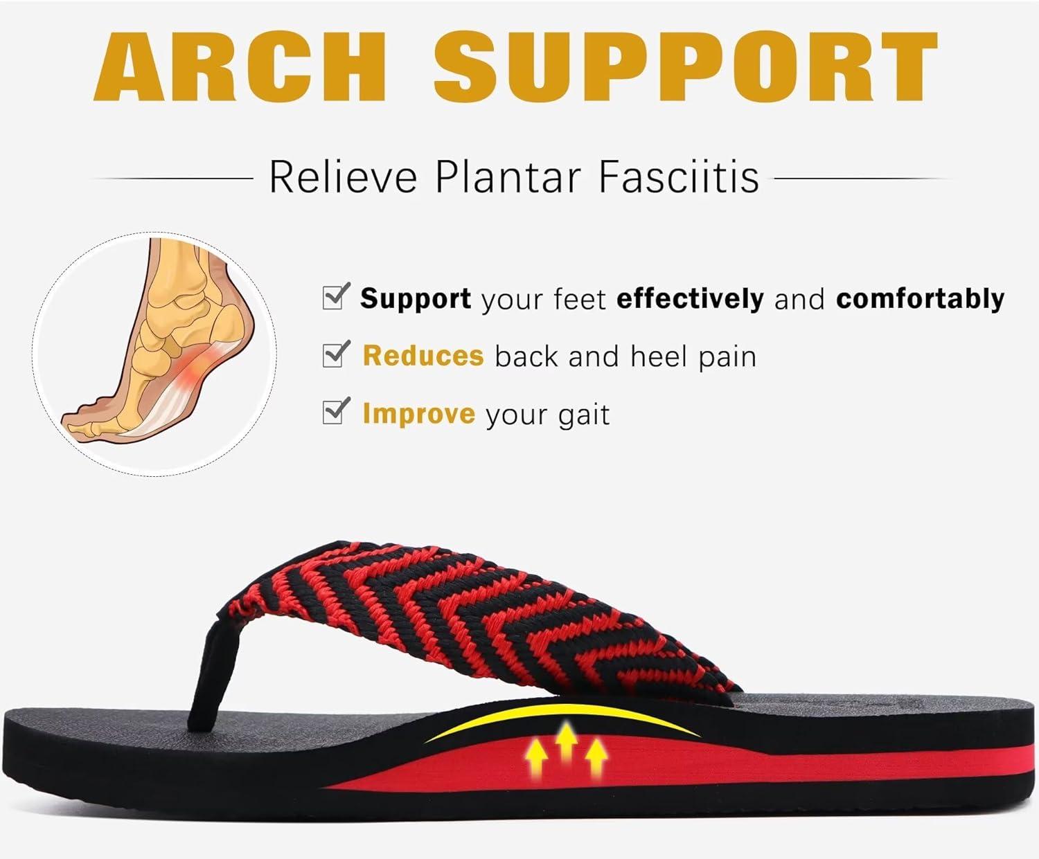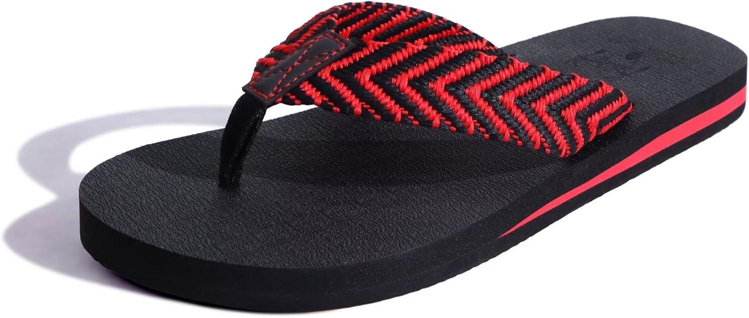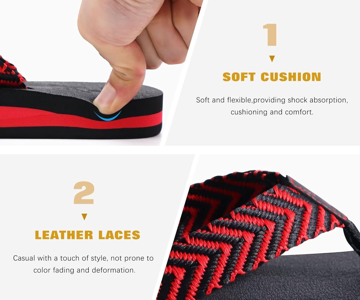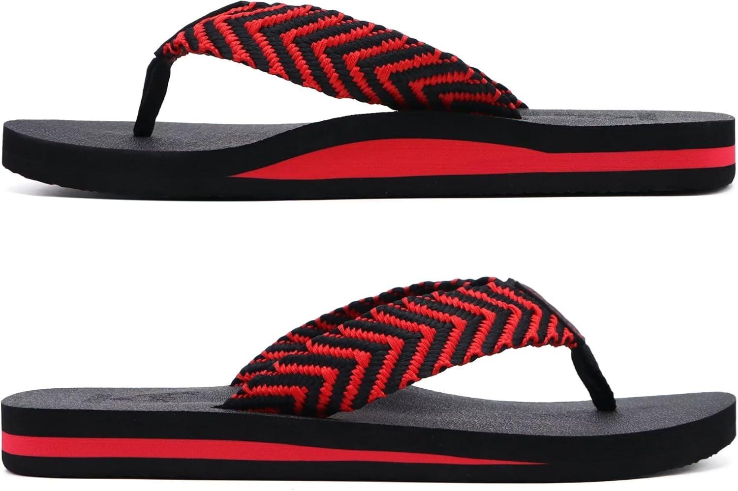 KuaiLu Men's Leather Flip Flops Arch Support Summer Beach Pool Water Thong Sandals Waterproof Rubber Walking Shoes(Black/Red)