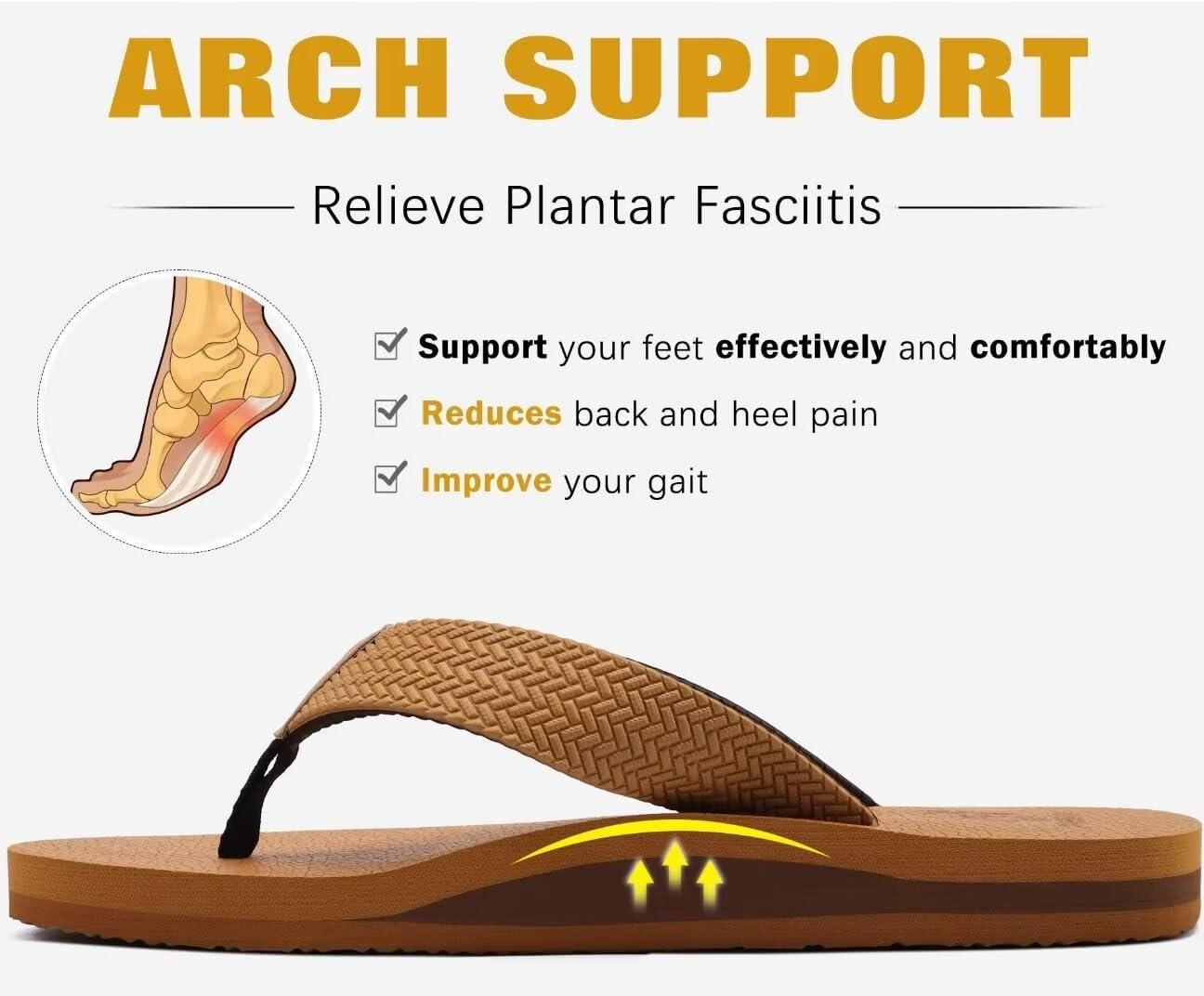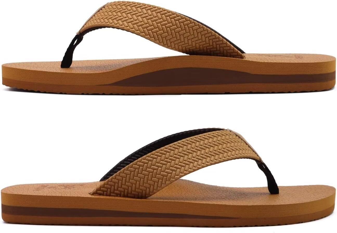 KuaiLu Men's Leather Flip Flops Arch Support Summer Beach Pool Water Thong Sandals Waterproof Rubber Walking Shoes(Light Khaki)
