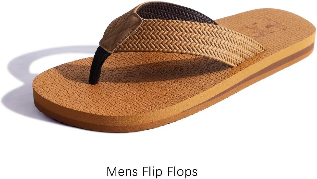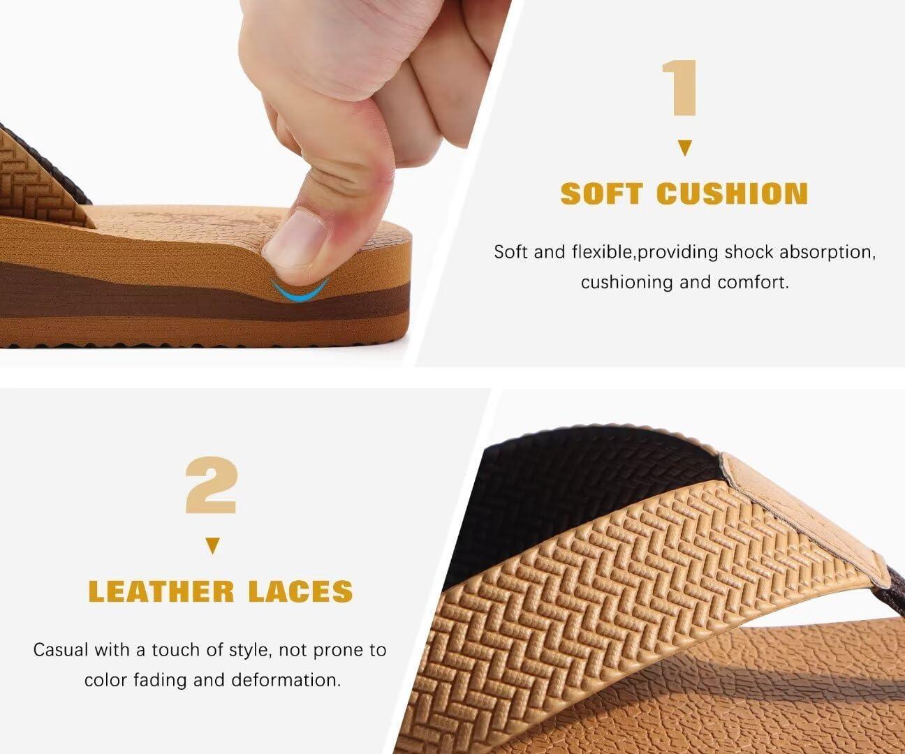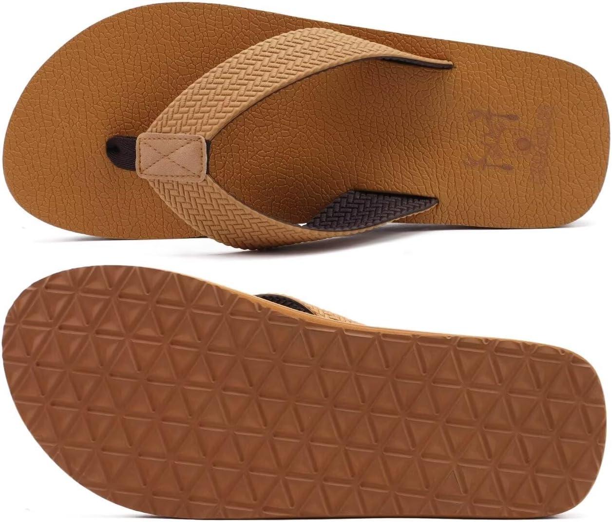 KuaiLu Men’s Leather Flip Flops Arch Support Summer Beach Pool Water Thong Sandals Waterproof Rubber Walking Shoes(Light Khaki)