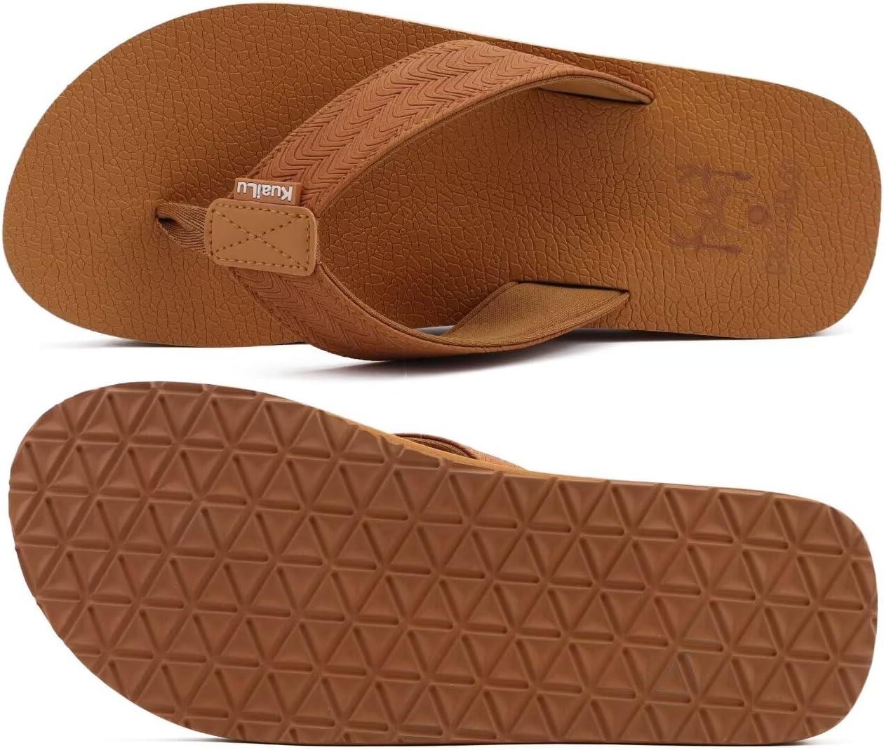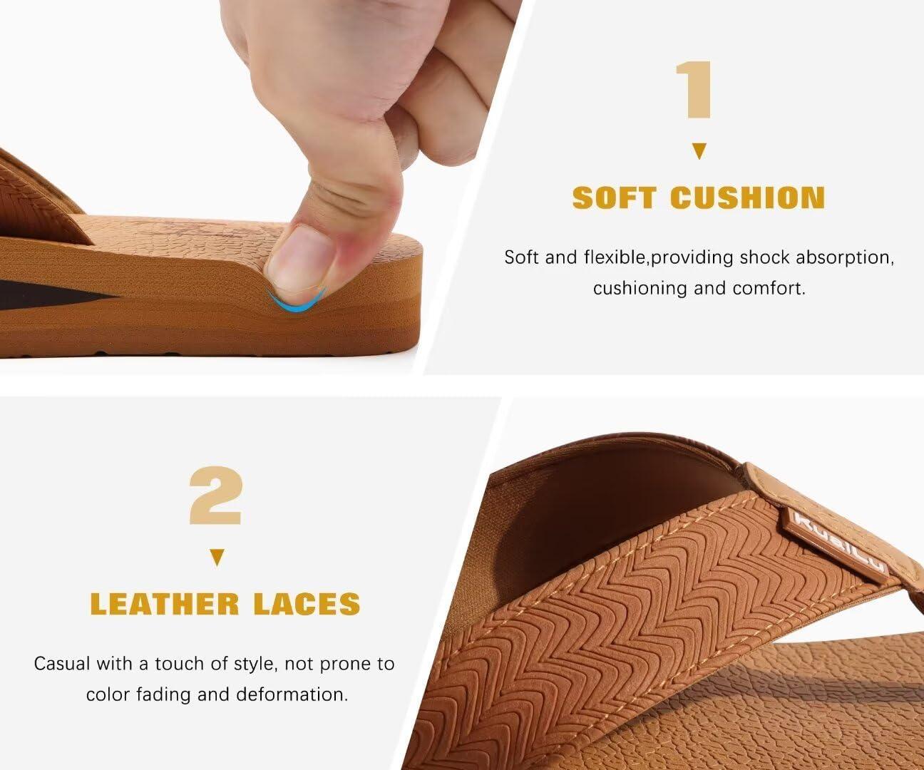 imageKuaiLu Mens Leather Flip Flops Arch Support Summer Beach Pool Water Thong Sandals Waterproof Rubber Walking ShoesTan