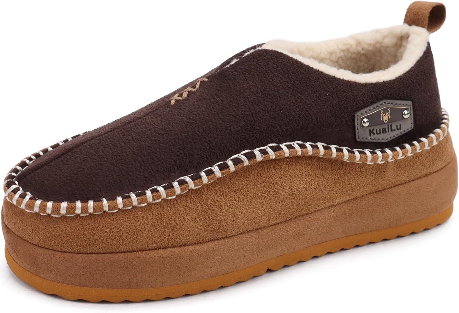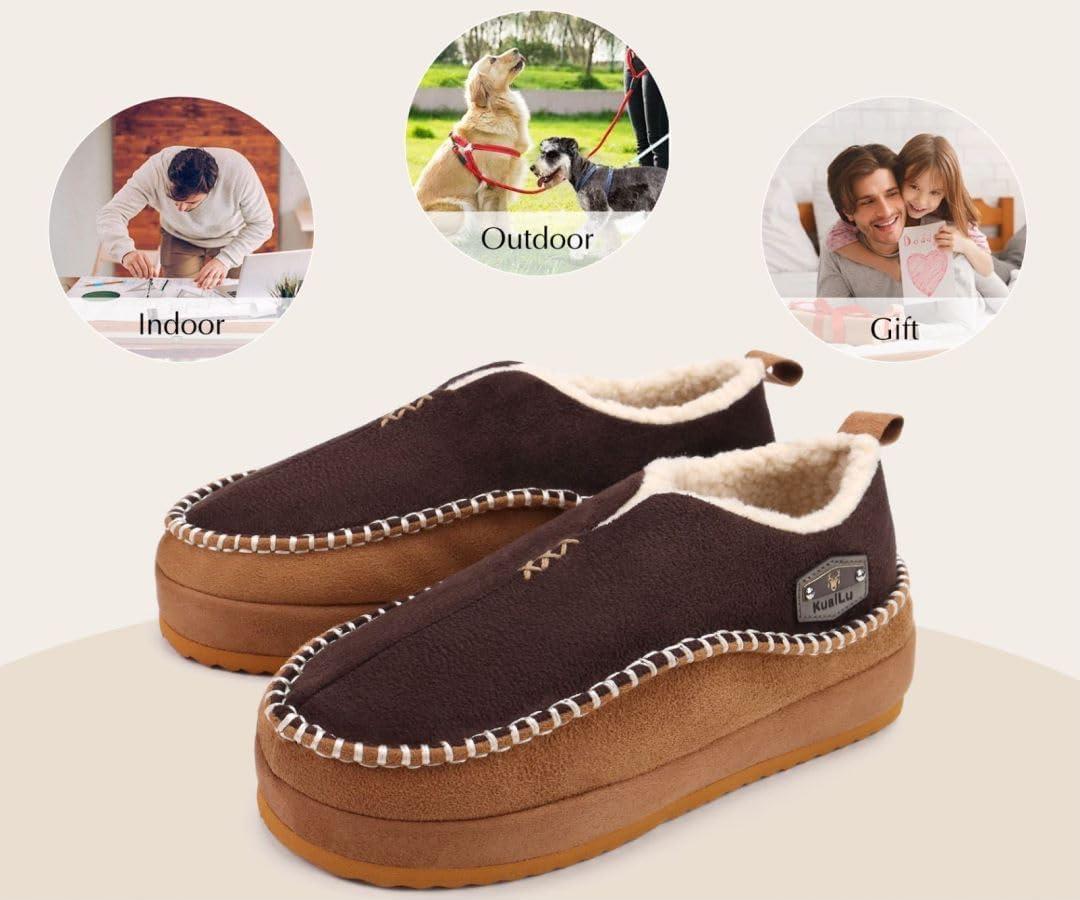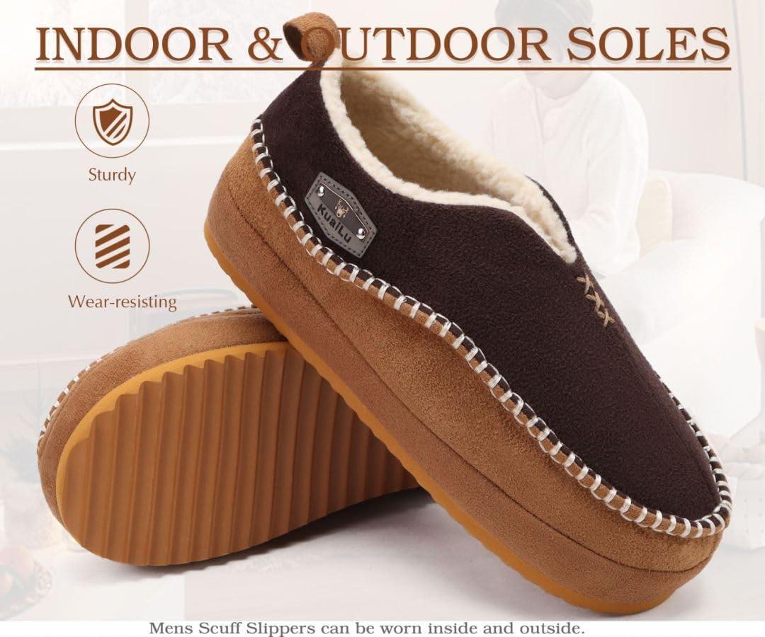 KuaiLu Men’s Slippers Cozy Memory Foam House Slipper Shoes Warm Suede Winter Moccasins Slip-on Boots Slippers For Man with Fuzzy Sherpa Lining & Indoor/Outdoor Hard Rubber Sole(Khaki Brown)