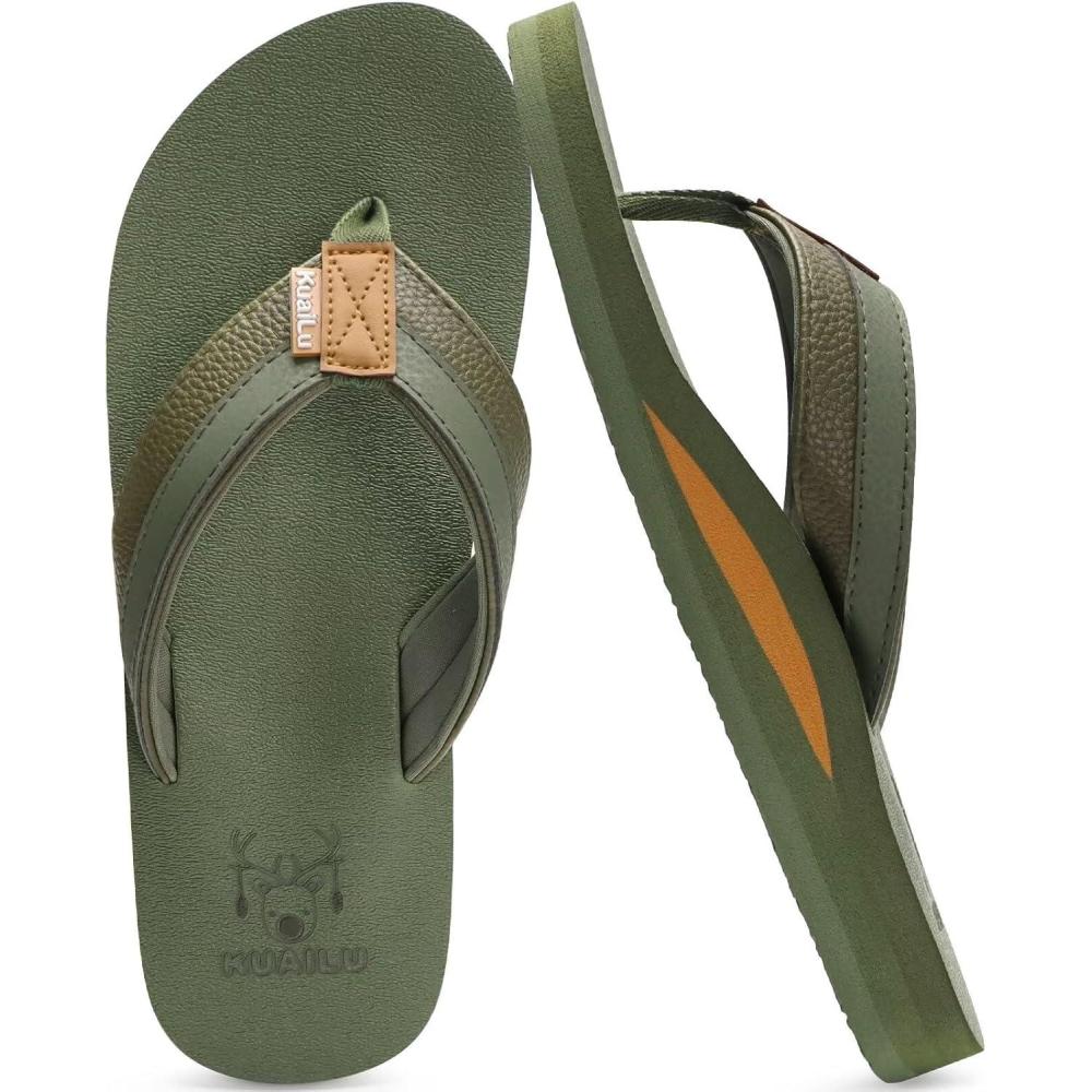 KuaiLu Men’s Yoga Mat Leather Flip Flops with Arch Support Comfortable Cushion Walking Thong Sandals Slip On Indoor Outdoor(Green)