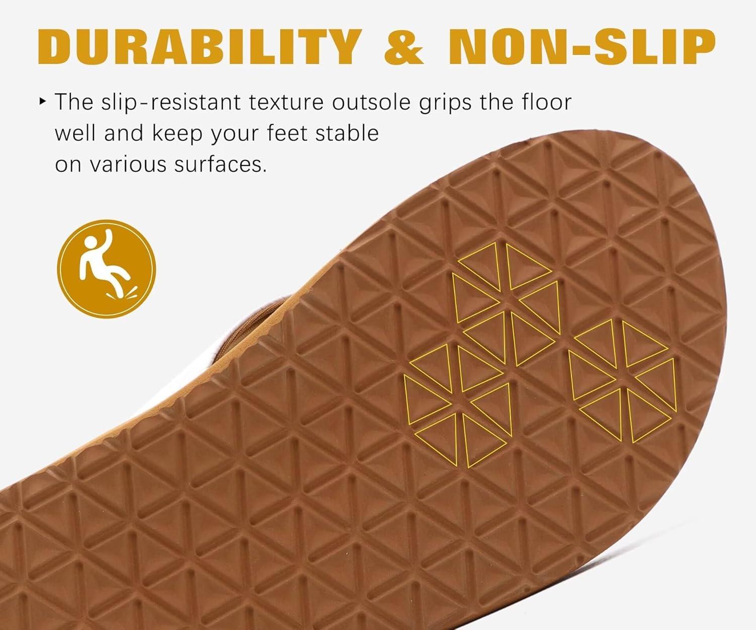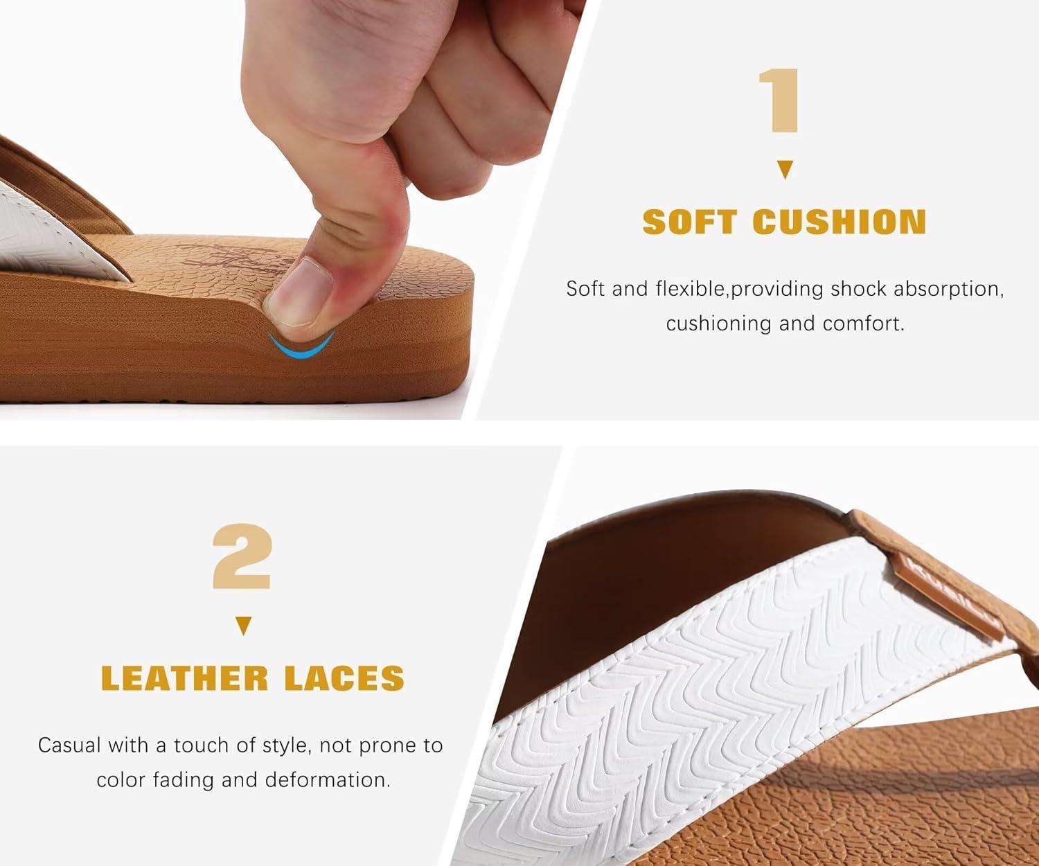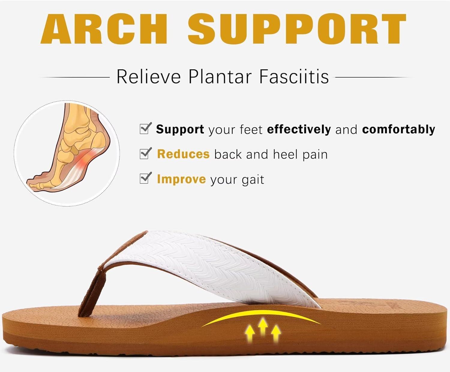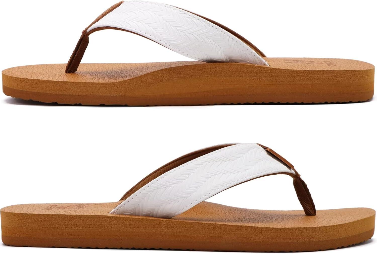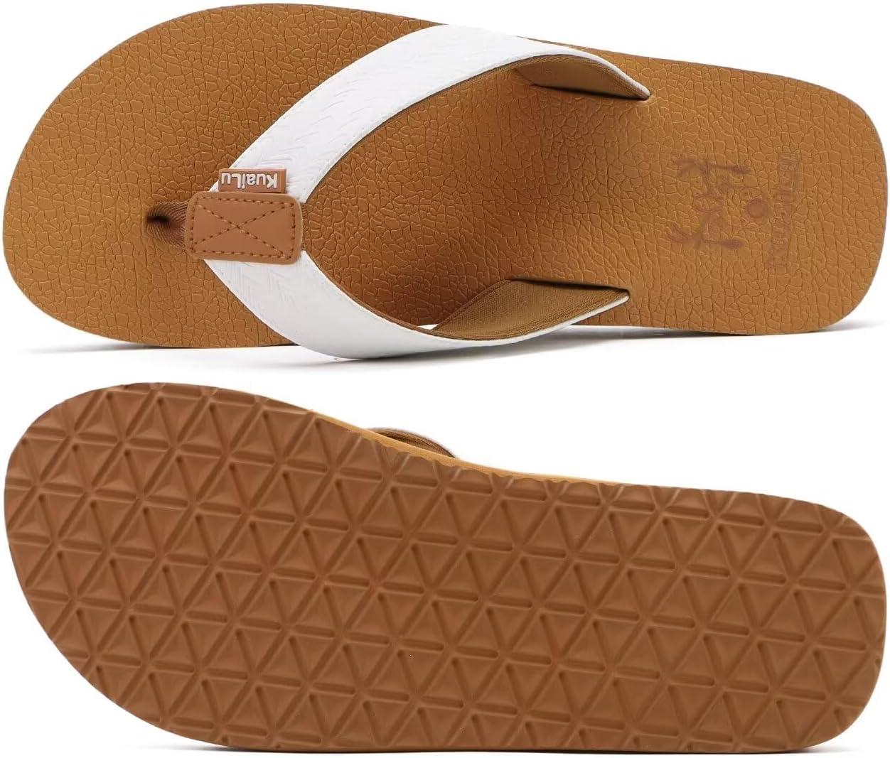 KuaiLu Men’s Yoga Mat Leather Flip Flops with Arch Support Comfortable Cushion Walking Thong Sandals Slip On Indoor Outdoor(Khaki White)
