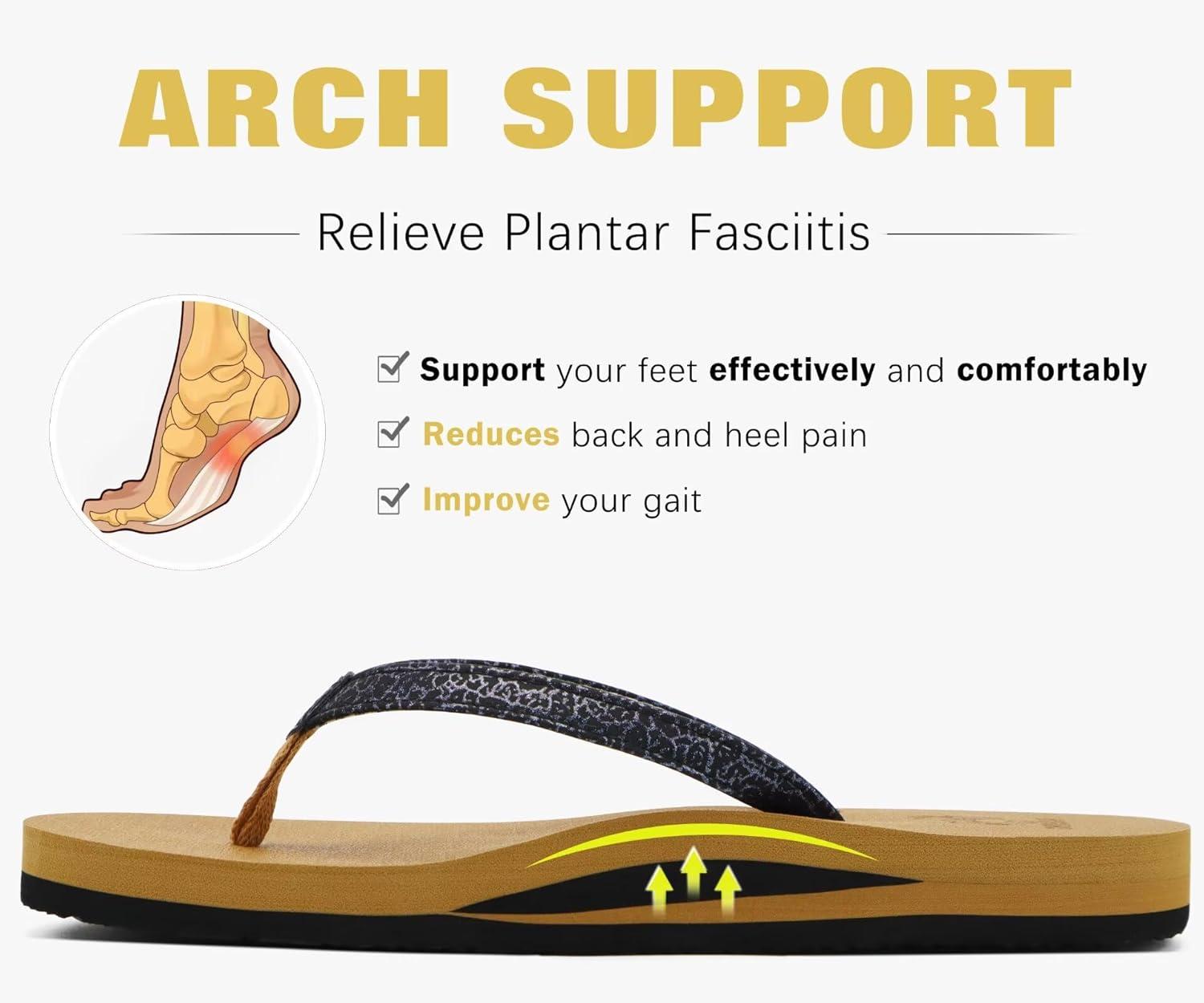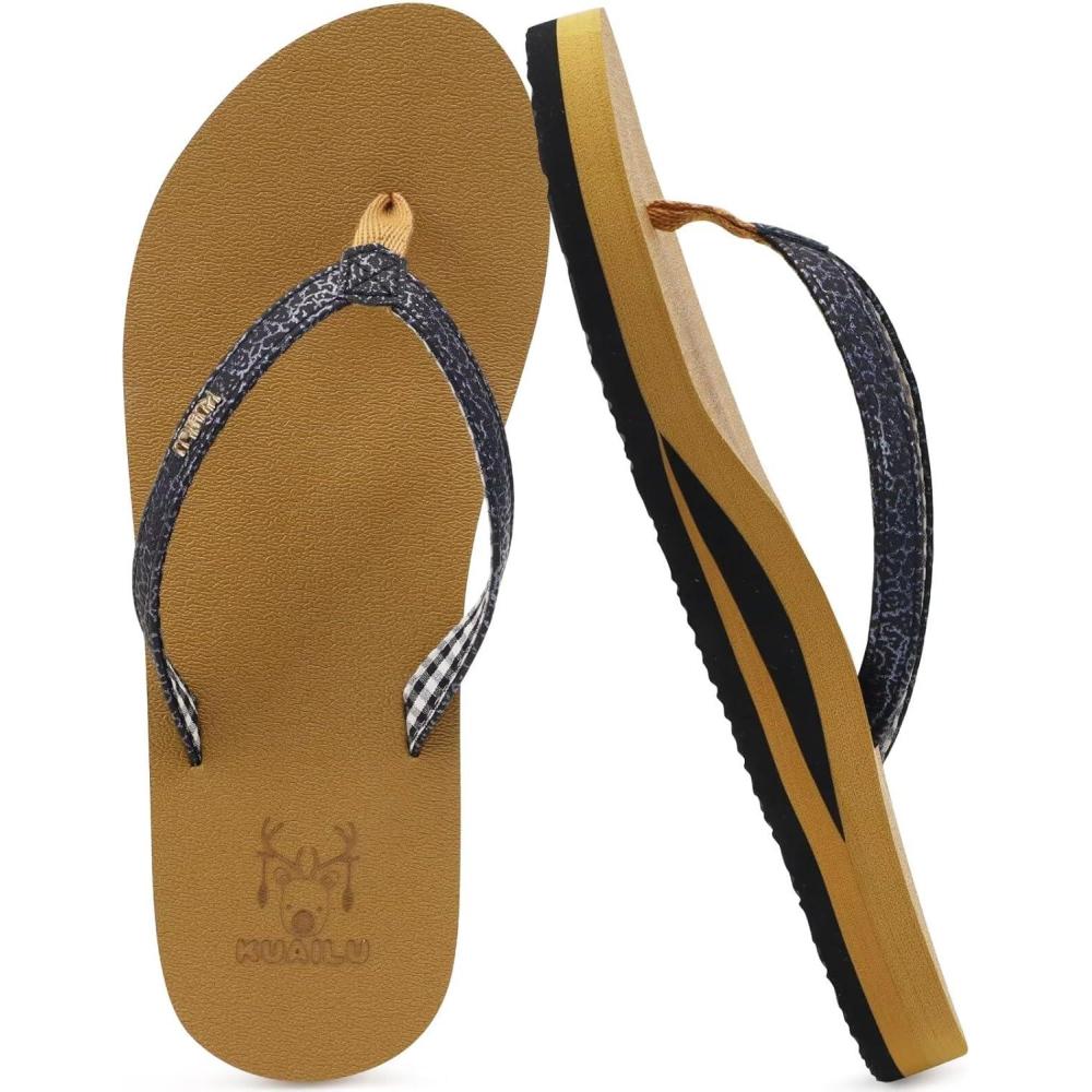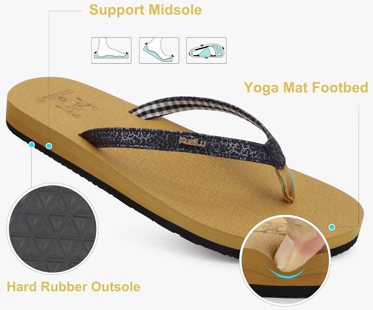 KuaiLu Womens Arch Support Flip Flops Comfortable Yoga Mat Slip on Summer Beach Walking Thong Cushion Sandals(Black Khaki)