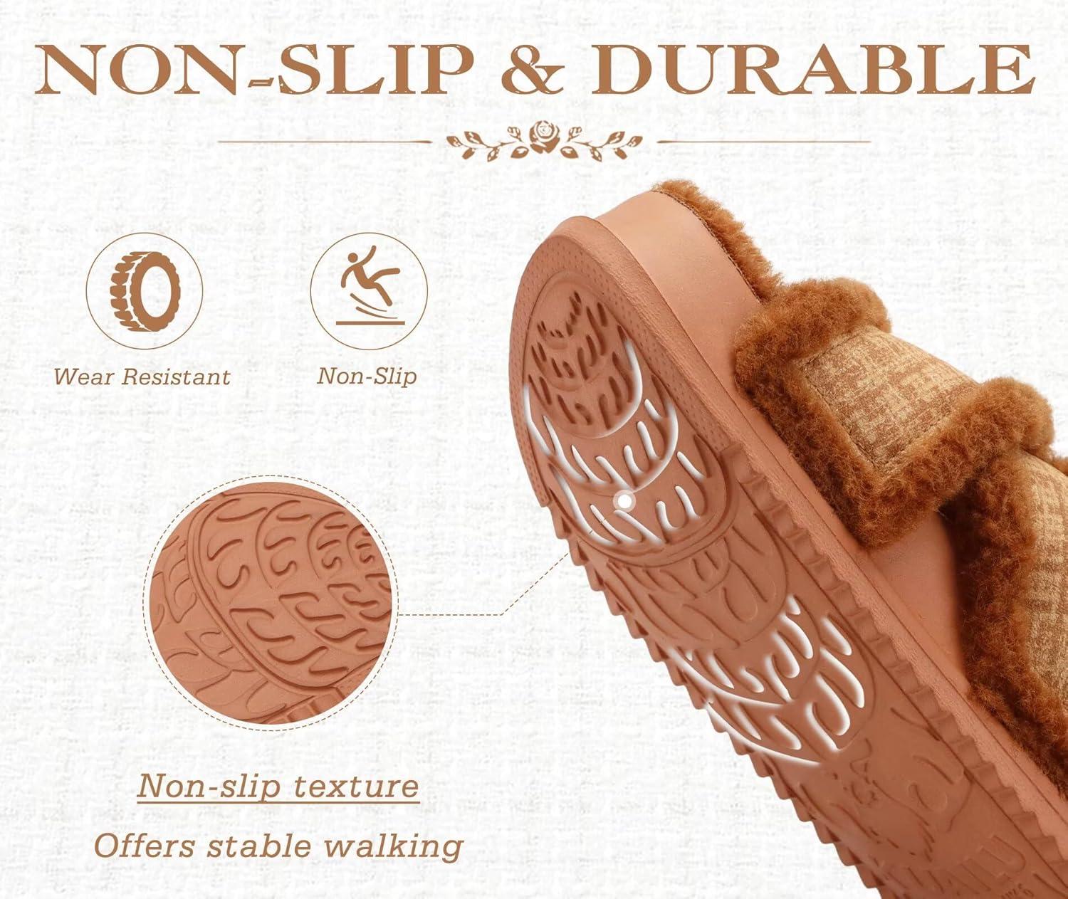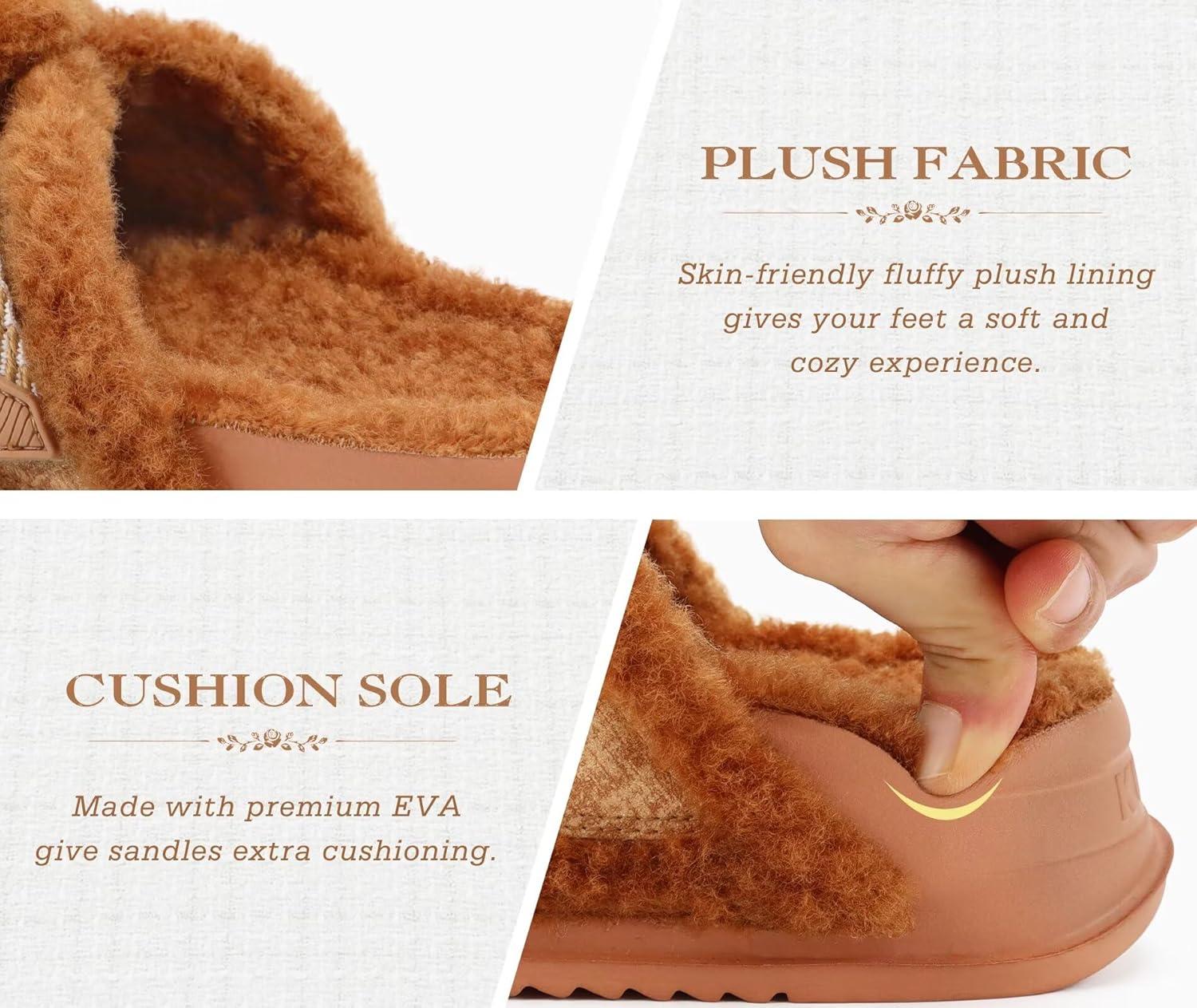 KuaiLu Women’s Chic Furry Platform Slippers Fuzzy Teddy Fleece Cross Band Open Toe Sandals with Comfortable Arch Support Slip on House Shoes Indoor Outdoor(Khaki)