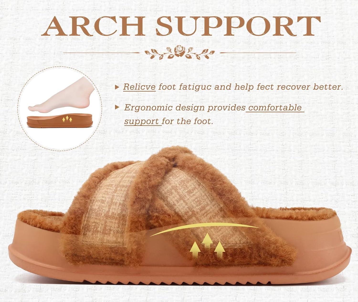 KuaiLu Chic Furry Slippers for Women Cozy Fuzzy Faux Fur Ladies Orthotic Arch Support Slides Cross Band Open Toe Plantar Fasciitis Platform Sandals Slip on House Shoes Indoor Outdoor
