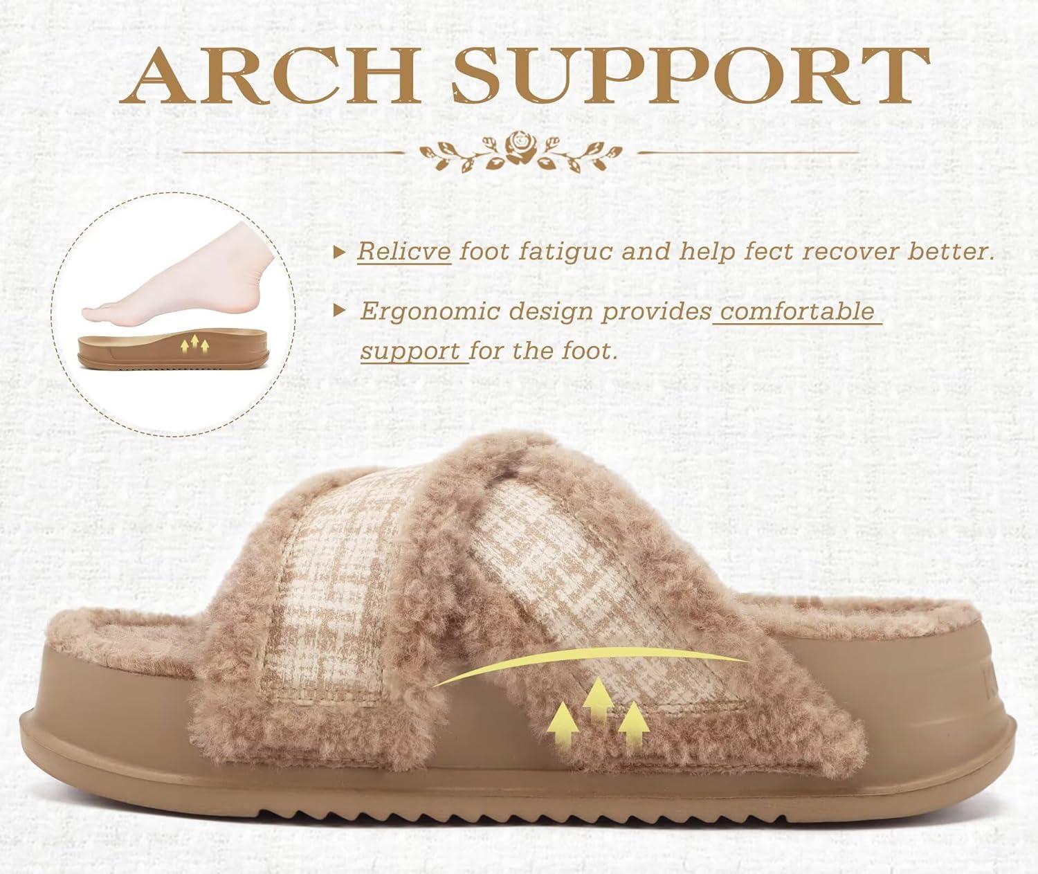 KuaiLu Chic Furry Slippers for Women Cozy Fuzzy Faux Fur Ladies Orthotic Arch Support Slides Cross Band Open Toe Plantar Fasciitis Platform Sandals Slip on House Shoes Indoor Outdoor