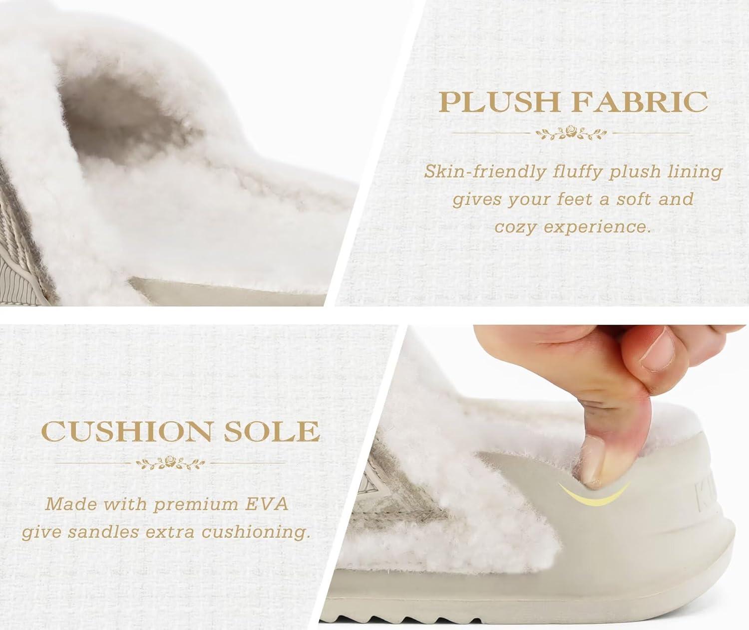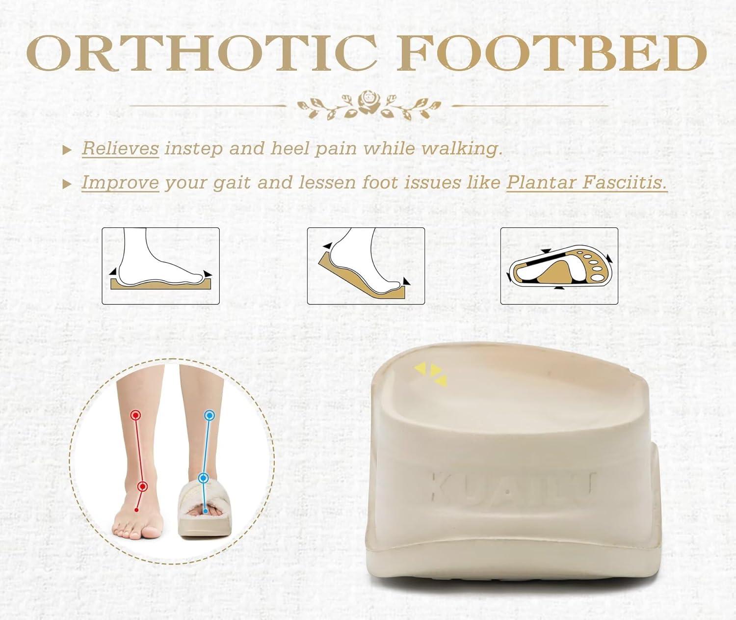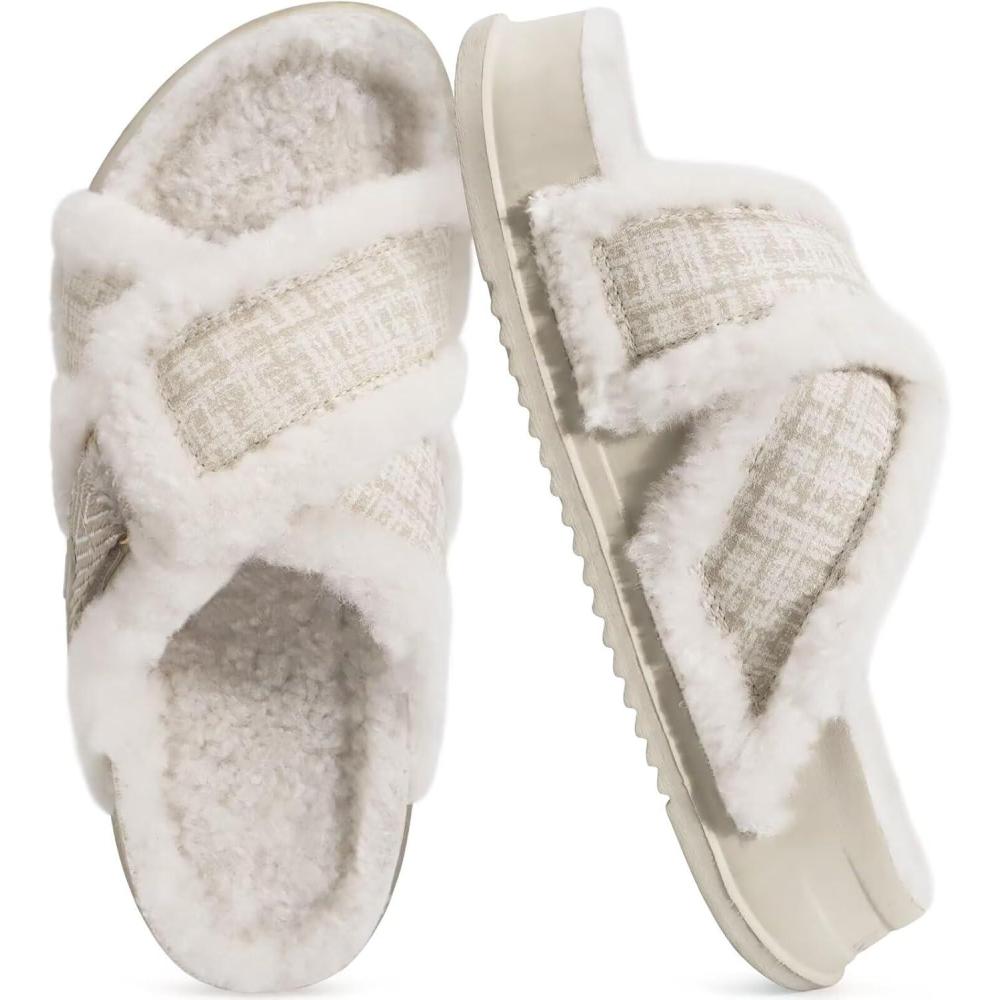 KuaiLu Chic Furry Slippers for Women Cozy Fuzzy Faux Fur Ladies Orthotic Arch Support Slides Cross Band Open Toe Plantar Fasciitis Platform Sandals Slip on House Shoes Indoor Outdoor