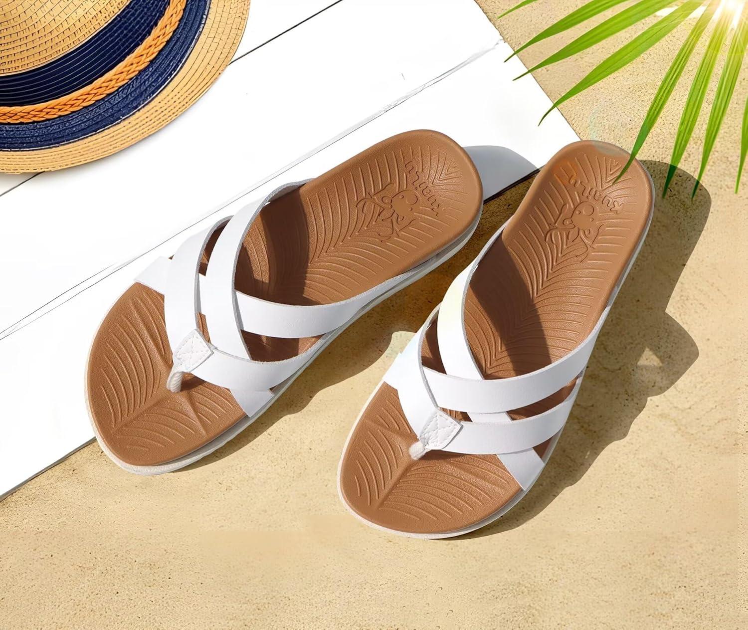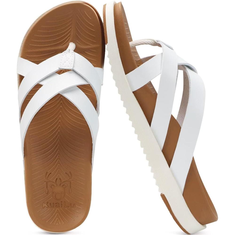 KuaiLu Womens Dressy Orthotic Flip Flops Trendy Comfortable Cushion Recovery Walking Criss Cross Thong Sandals Lightweight Yoga Foam Summer Slides with Plantar Fasciitis Arch Support(White Khaki)