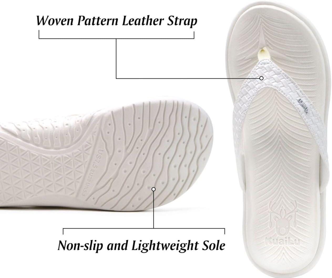 KuaiLu Womens Flip Flops With Arch Support Comfortable Yoga Mat Cushion Thong Leather Sandals for Ladies Fashion Slip On Summer Beach Walking Slides Indoor Outdoor Travel Orthotic Slippers(White)