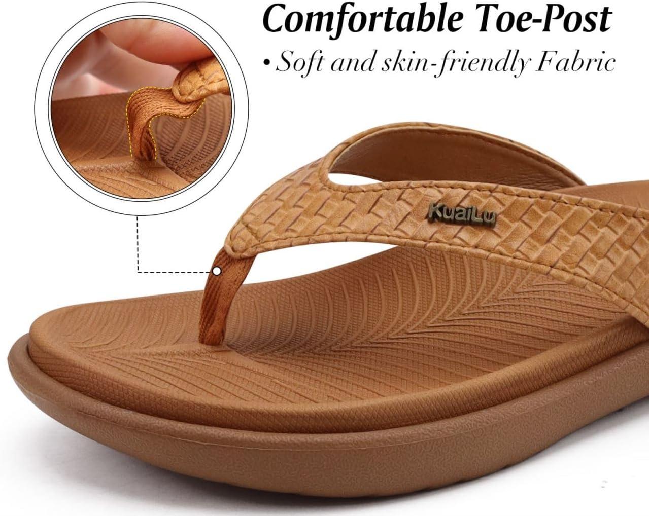 KuaiLu Womens Flip Flops Ladies Yoga Mat Comfortable Walking Thong Sandals With Plantar Fasciitis Arch Support Slip On Indoor Outdoor For Summer(Khaki-duo)