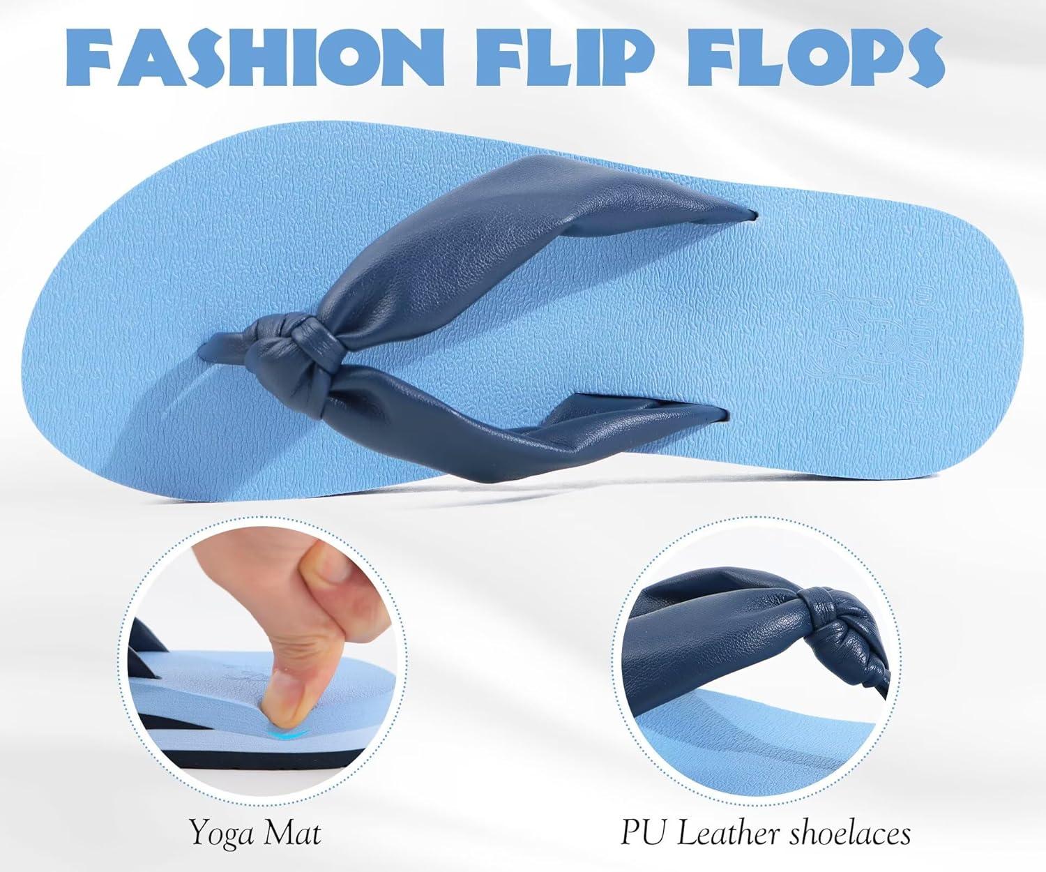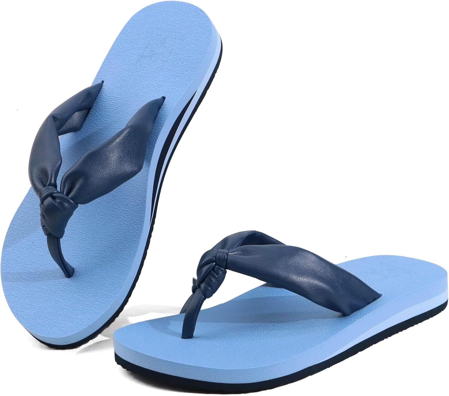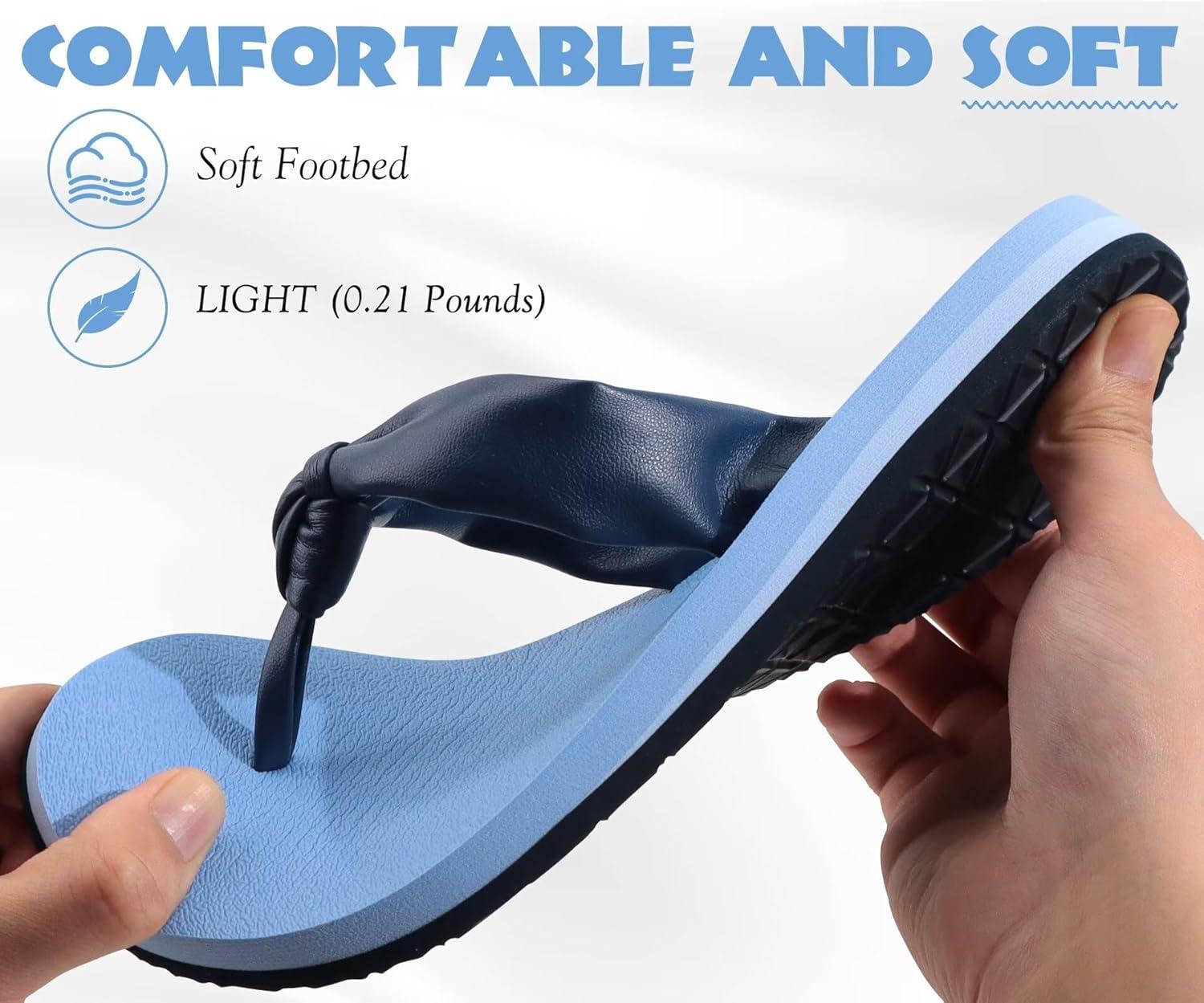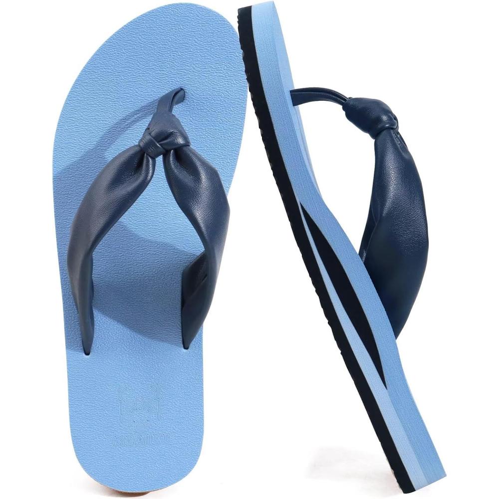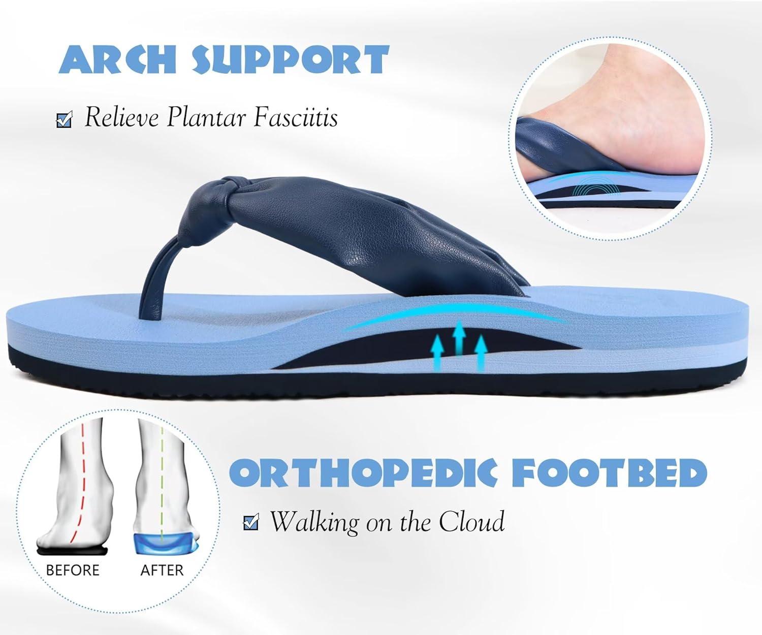 KuaiLu Womens Flip Flops With Arch Support Comfortable Yoga Mat Cushion Thong Leather Sandals for Ladies Fashion Slip On Summer Beach Walking Slides Indoor Outdoor Travel Orthotic Slippers(Blue)