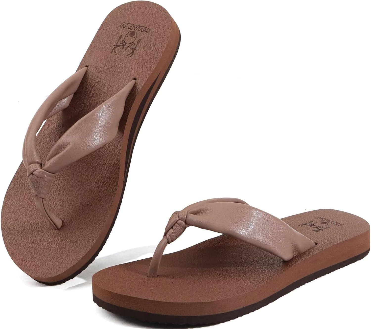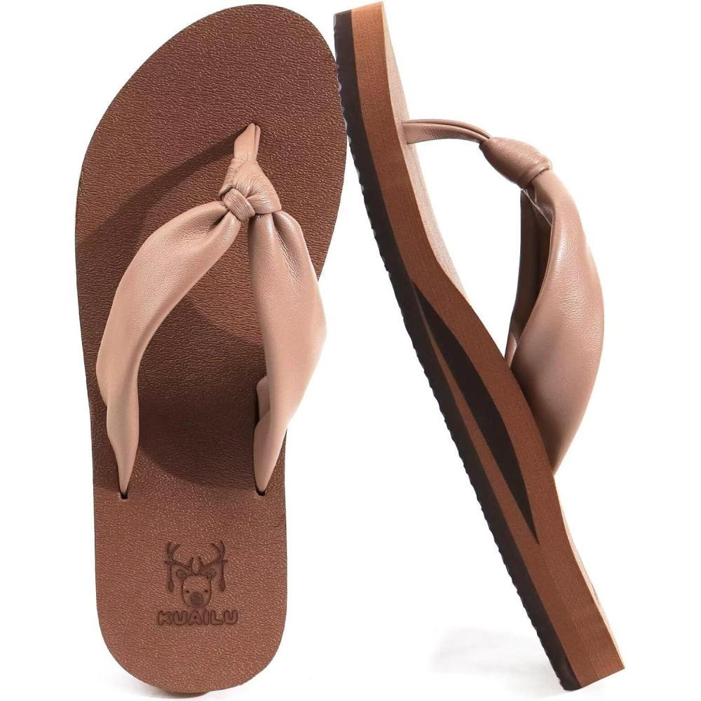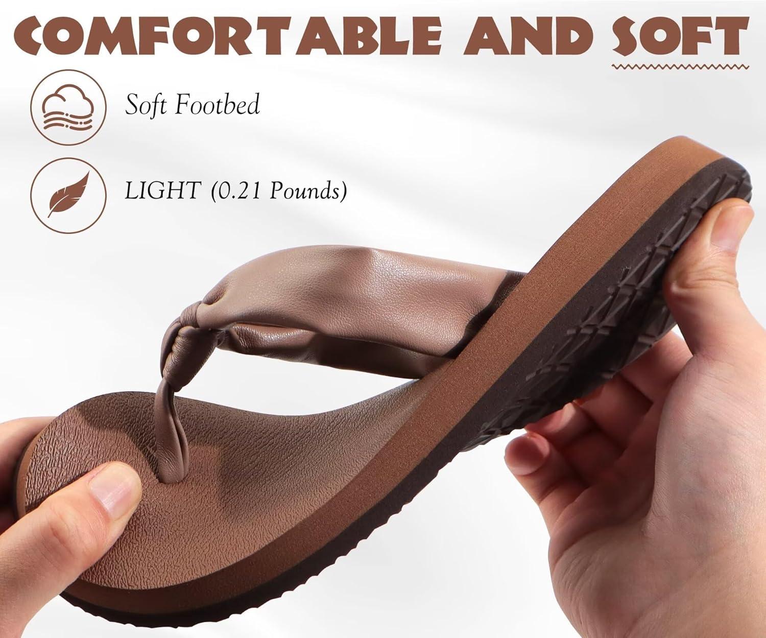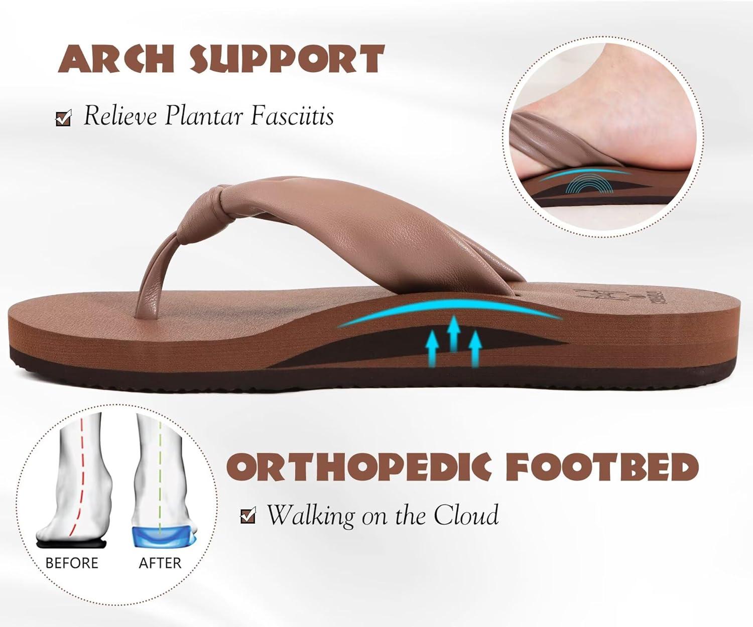 KuaiLu Womens Flip Flops With Arch Support Comfortable Yoga Mat Cushion Thong Leather Sandals for Ladies Fashion Slip On Summer Beach Walking Slides Indoor Outdoor Travel Orthotic Slippers(Brown)
