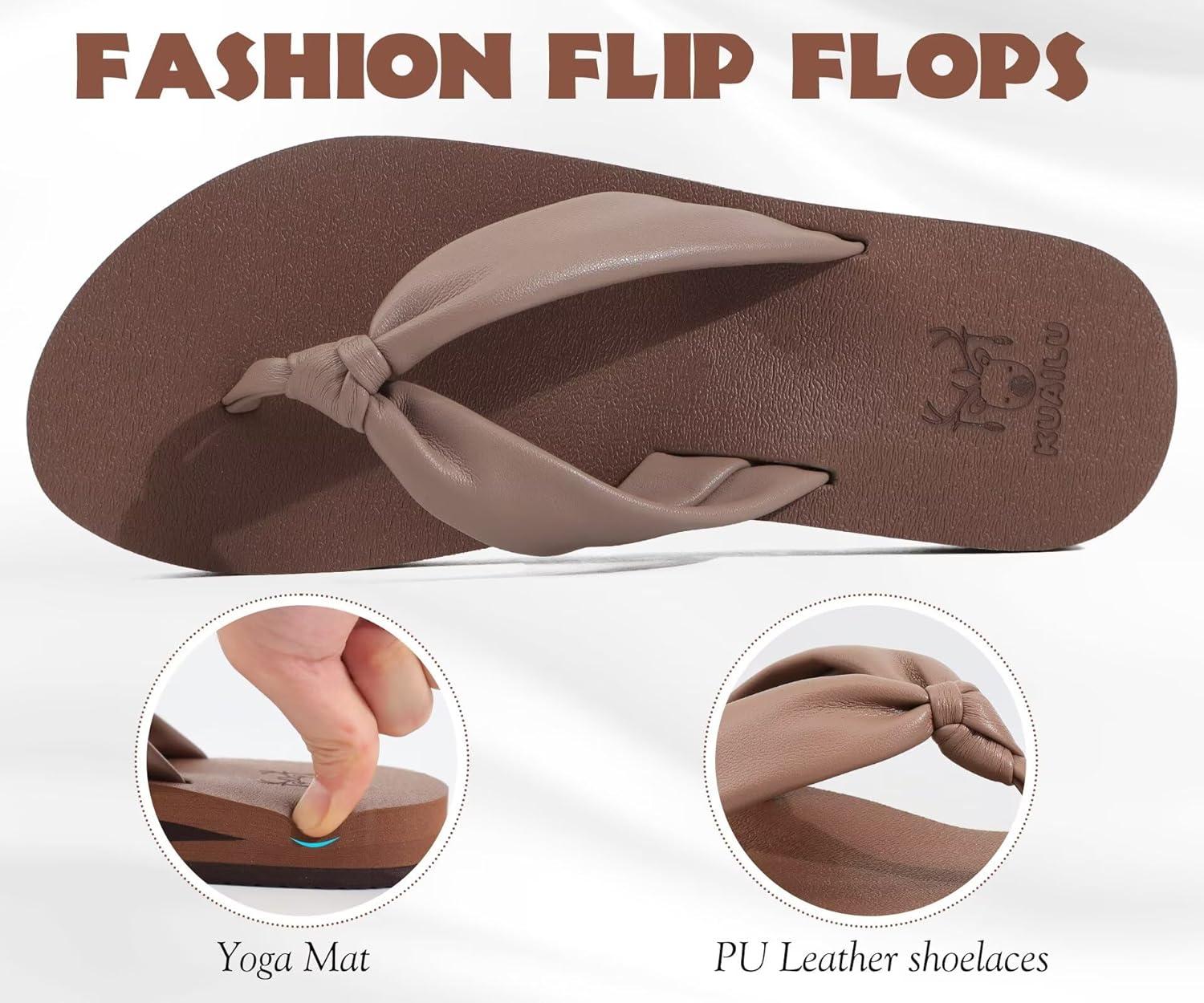 imageKuaiLu Womens Flip Flops With Arch Support Comfortable Yoga Mat Cushion Thong Leather Sandals for Ladies Fashion Slip On Summer Beach Walking Slides Indoor Outdoor Travel Orthotic SlippersBrown