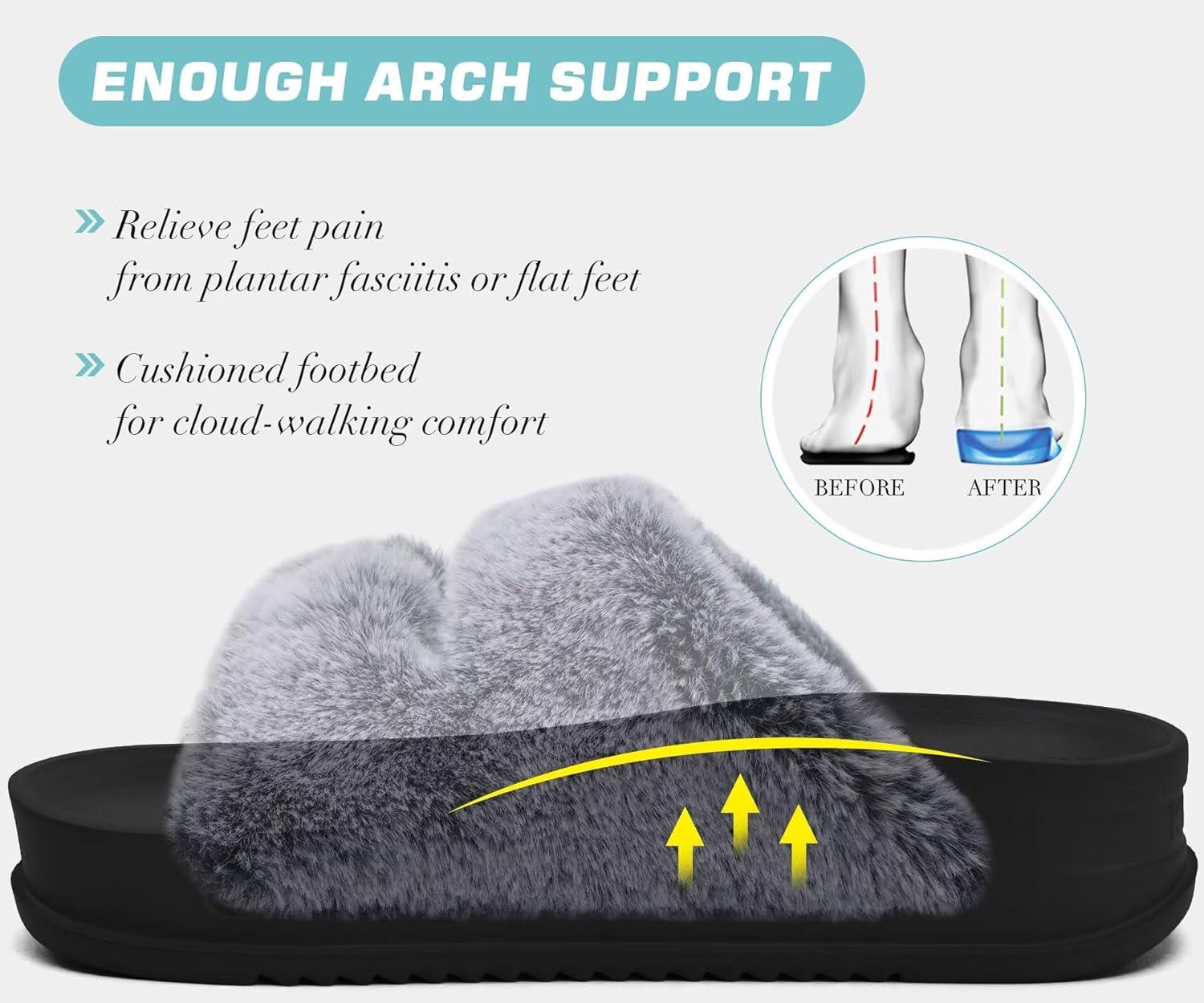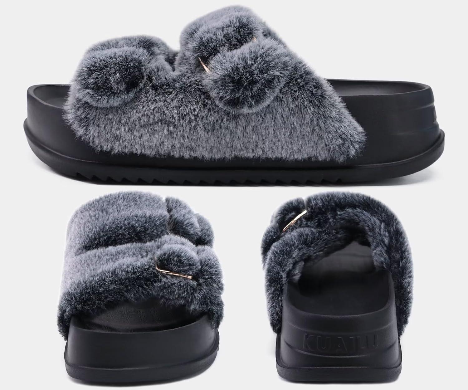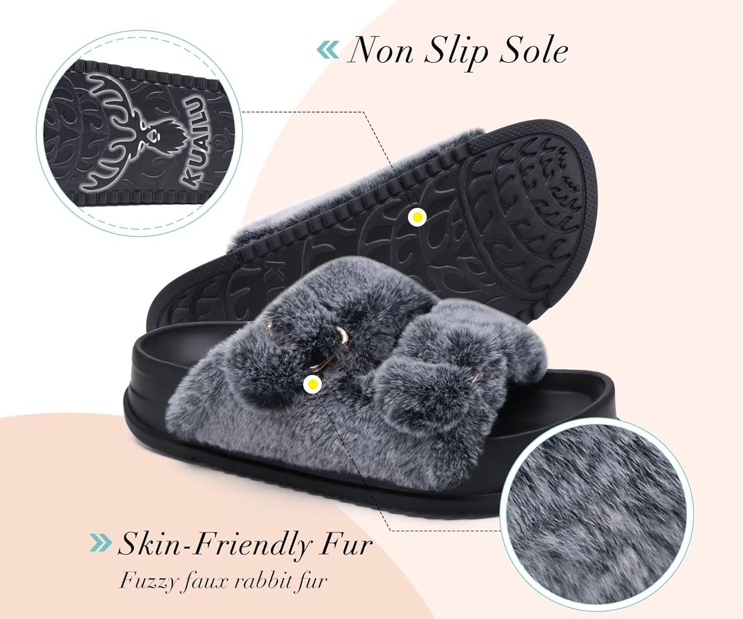 Get up to 70% off on KuaiLu Women’s Fluff Slippers Black Size 9, Plantar Fasciitis Arch Support Platform Slippers Ladies Fashion Open Toe Faux Fur Sliders House Slipper styles during our end-of-season clearance event.