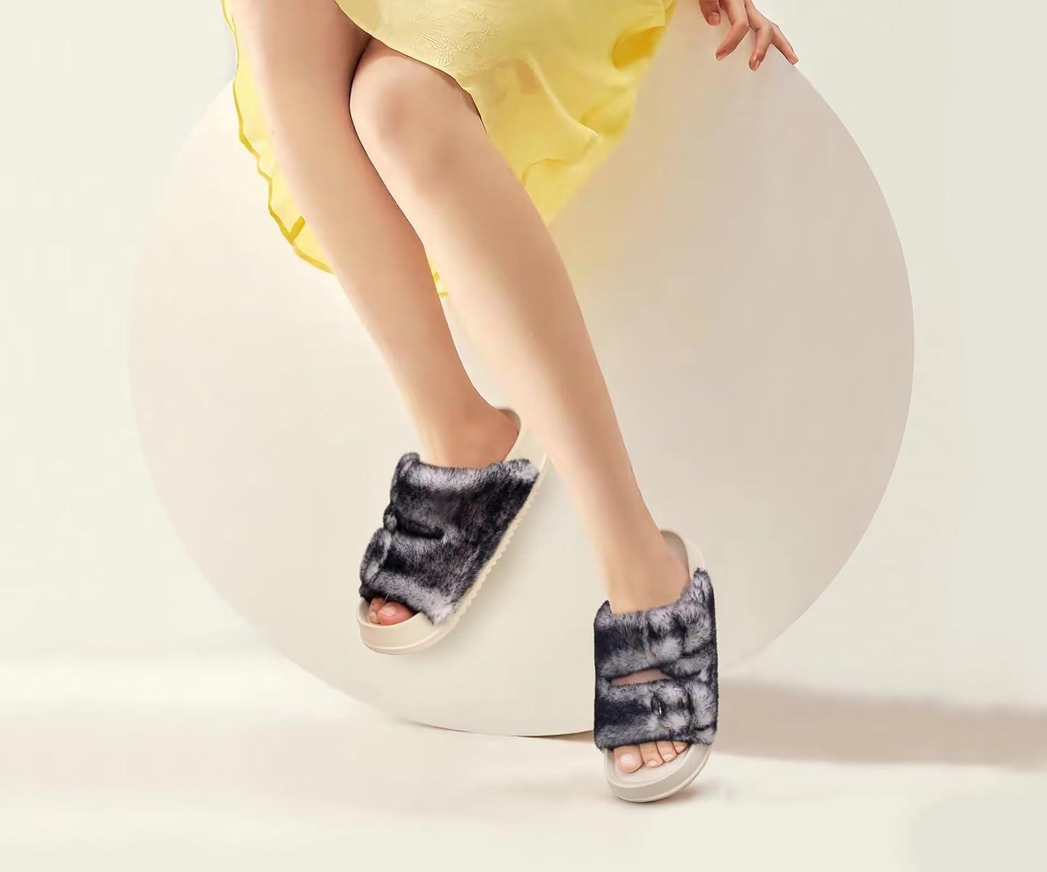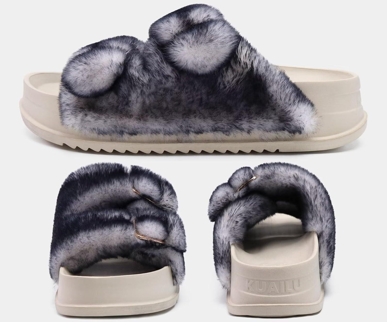 KuaiLu Women's Fluff Slippers Black White Size 8, Plantar Fasciitis Arch Support Platform Slippers Ladies Fashion Open Toe Faux Fur Sliders House Slipper