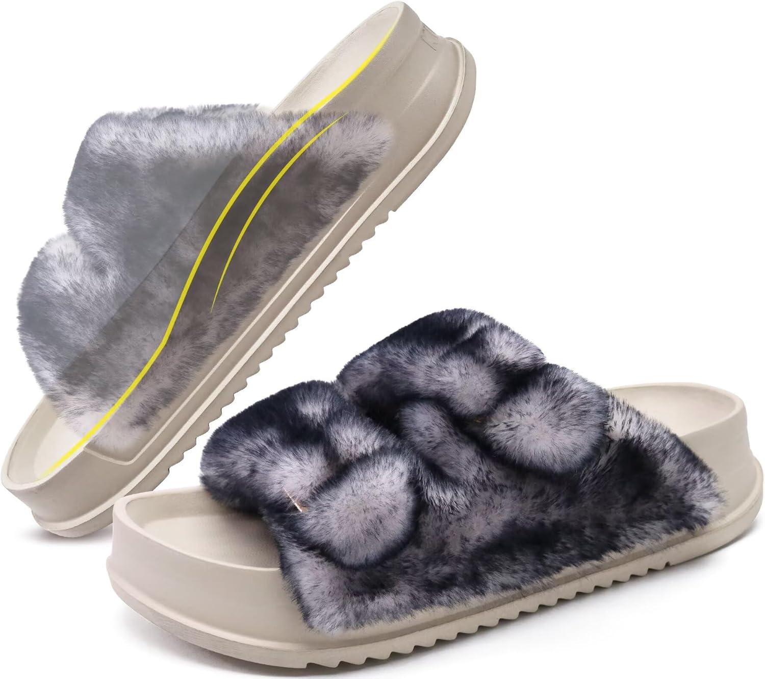 KuaiLu Women’s Fluff Slippers Plantar Fasciitis Arch Support Platform Slippers Ladies Fashion Open Toe Faux Fur Sliders Womens House Slipper Size 6-12(Khaki (Adjustable))