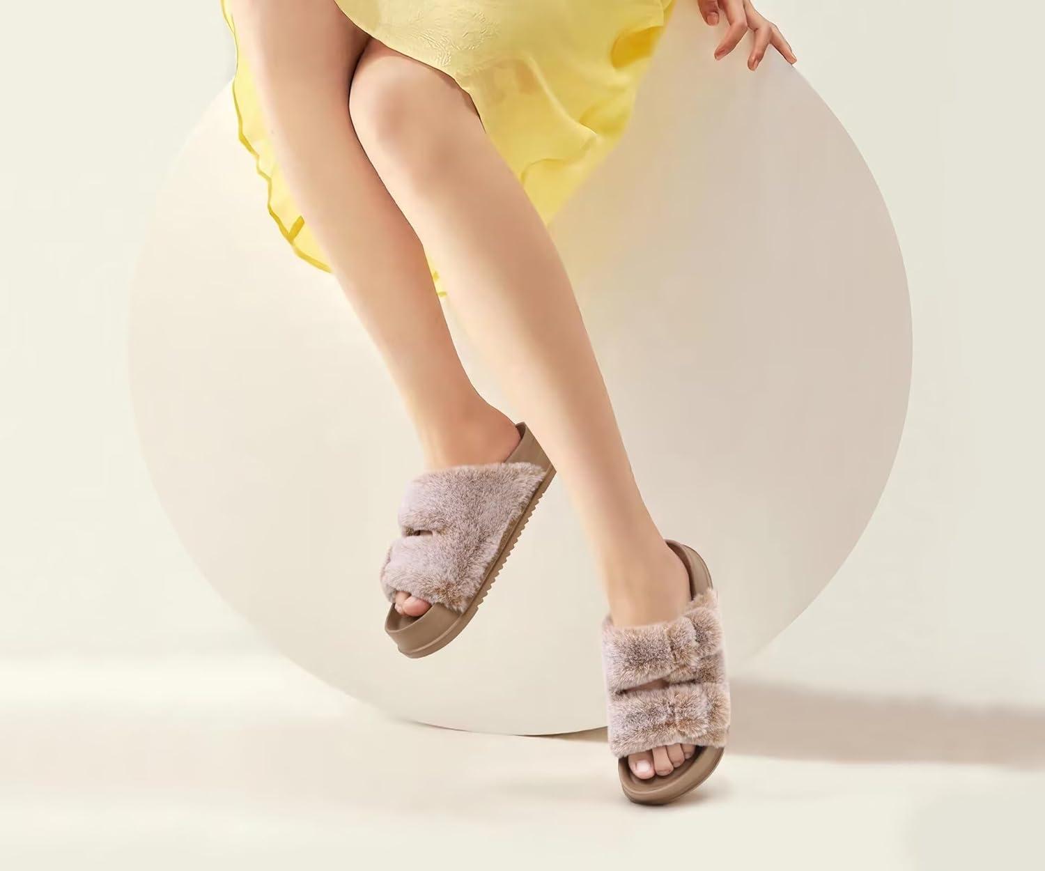 KuaiLu Women's Fluff Slippers Plantar Fasciitis Arch Support Platform Slippers Ladies Fashion Open Toe Faux Fur Sliders House Slipper, Camel Brown Size 11