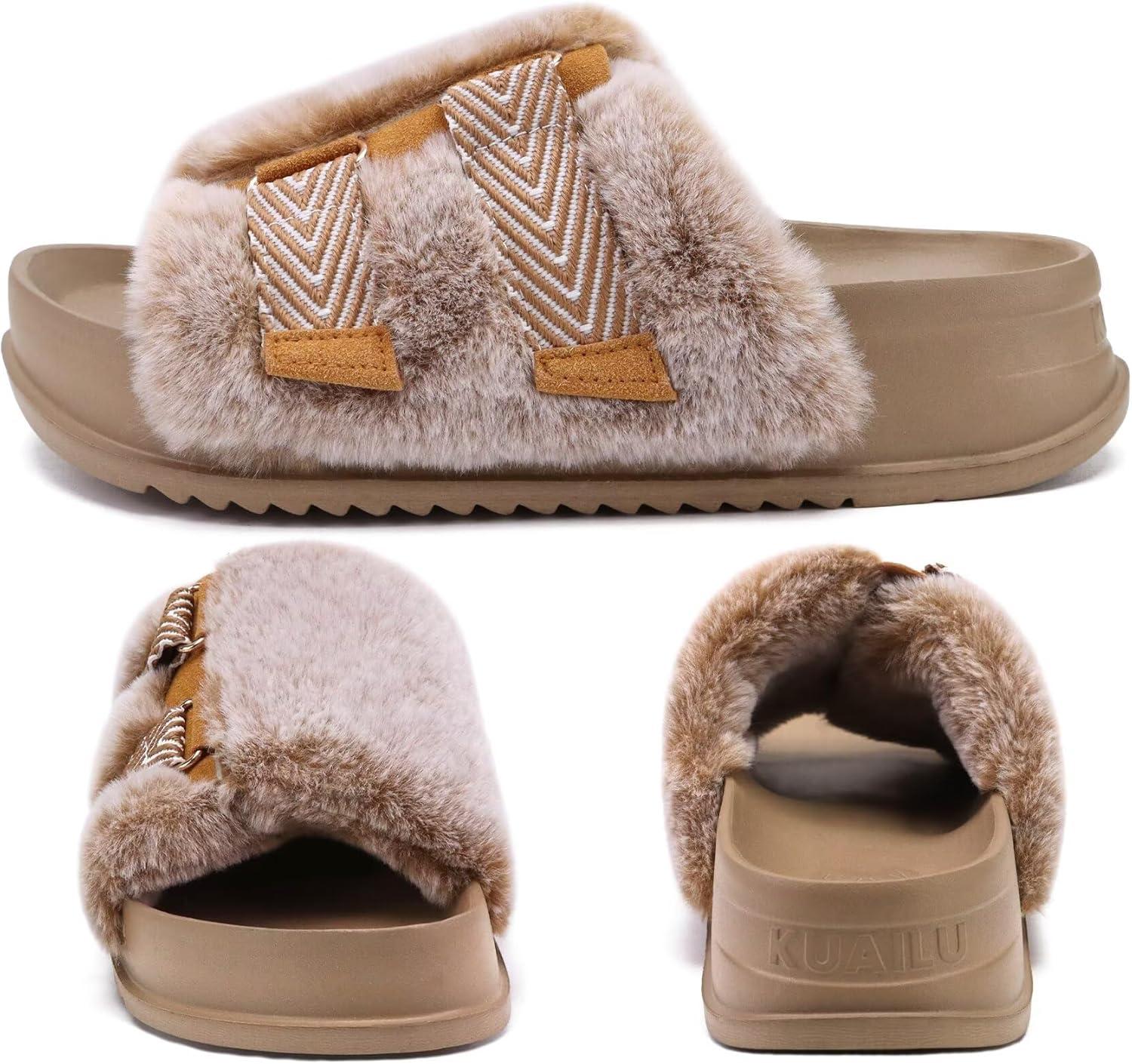imageKuaiLu Womens Fluff Slippers Plantar Fasciitis Arch Support Platform Slippers Ladies Fashion Open Toe Faux Fur Sliders Womens House Slipper Size 612Camel Brown Adjustable