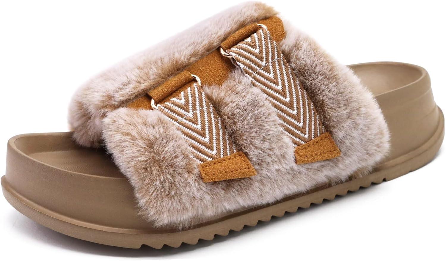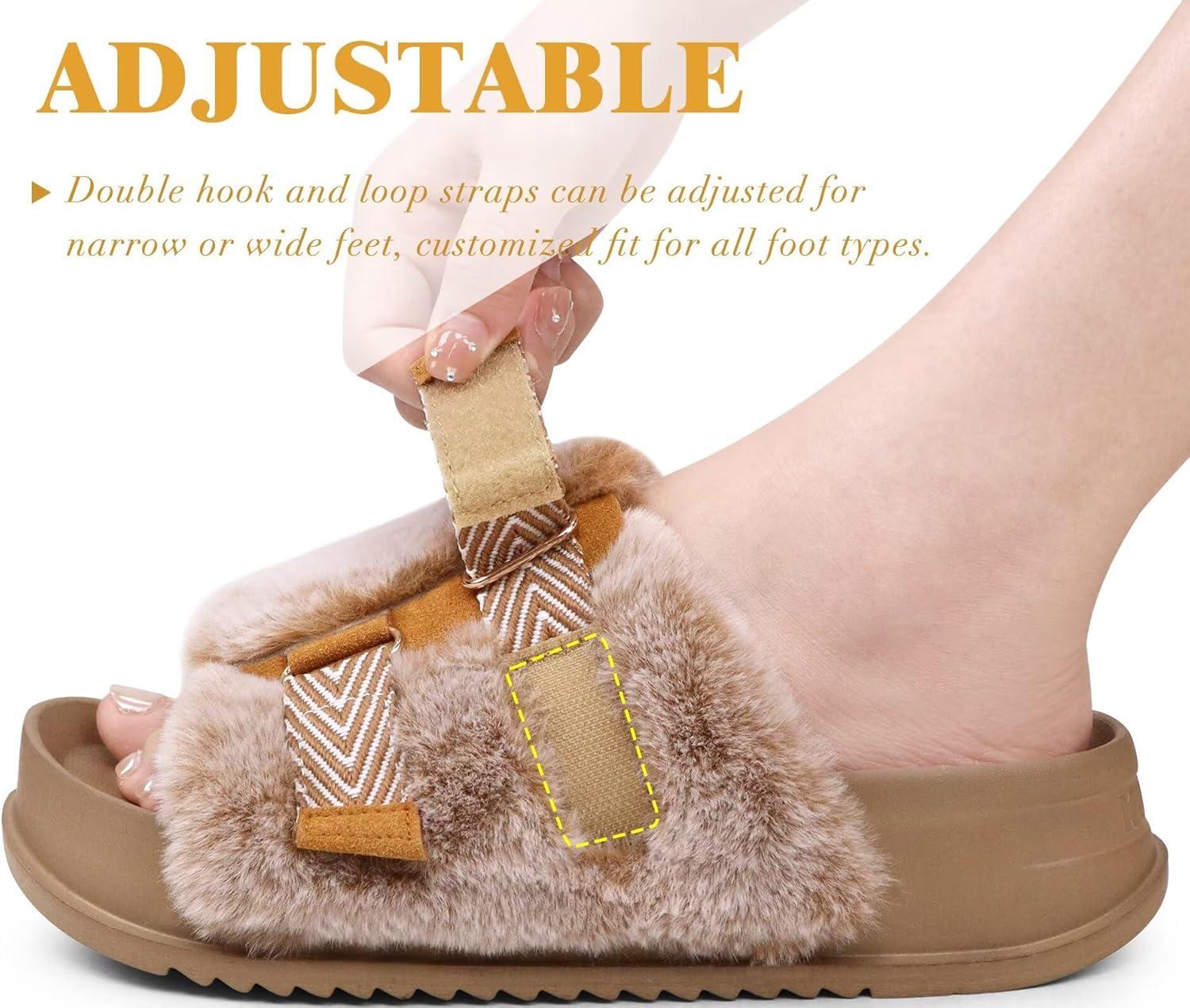 KuaiLu Women's Fluff Slippers Plantar Fasciitis Arch Support Platform Slippers Ladies Fashion Open Toe Faux Fur Sliders Womens House Slipper Size 6-12(Camel Brown (Adjustable))
