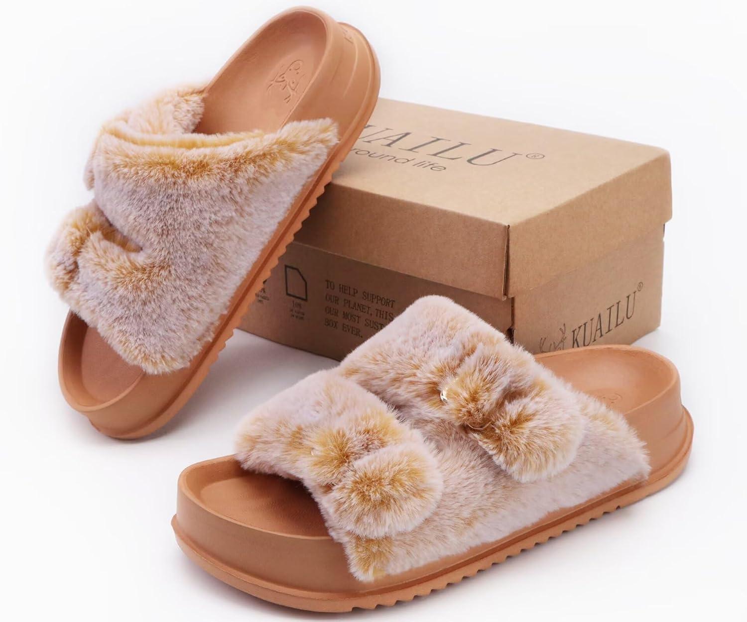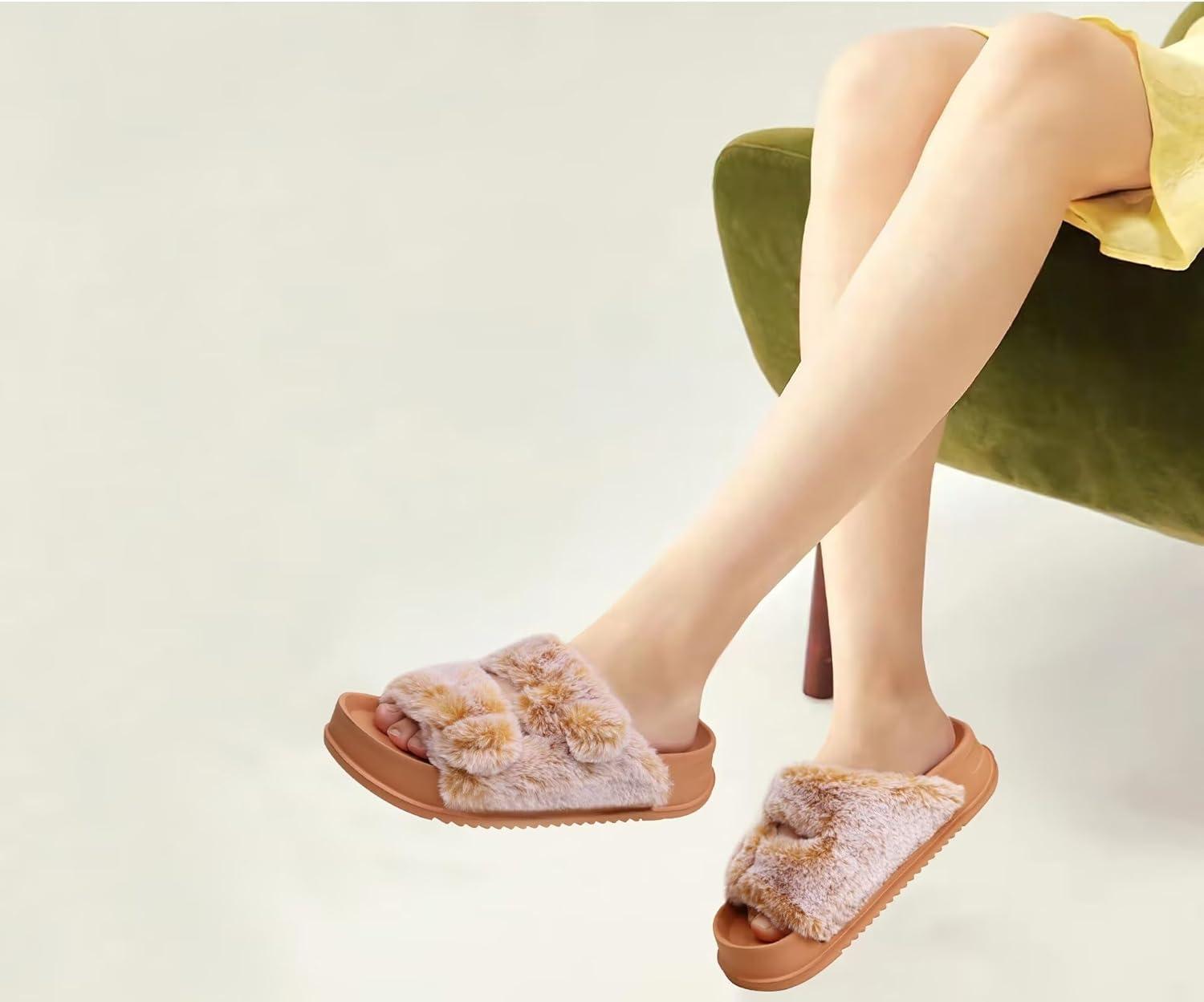 KuaiLu platform slippers for women are made from premium faux fur with soft and supportive EVA foam. Skin-friendly thick Plush upper meets open toe design, women's fur sliders is warm but breathable, gentle touch can care for your feet, suitable for spring, summer, fall and winter. Two stylish elastic band are specially designed for chic and elegant woman, lady or girls, one of them is stretchy but not adjustable. Ergonomic arch support footbed, soft cushioned pad and deep heel cup to build the most comfortable orthopedic slide slippers for women, reduces your feet fatigue, extremely comfy. Lightweight and flexible non-slip pattern outsole, prevents slipping or sliding, suitable for indoor and outdoor wear.