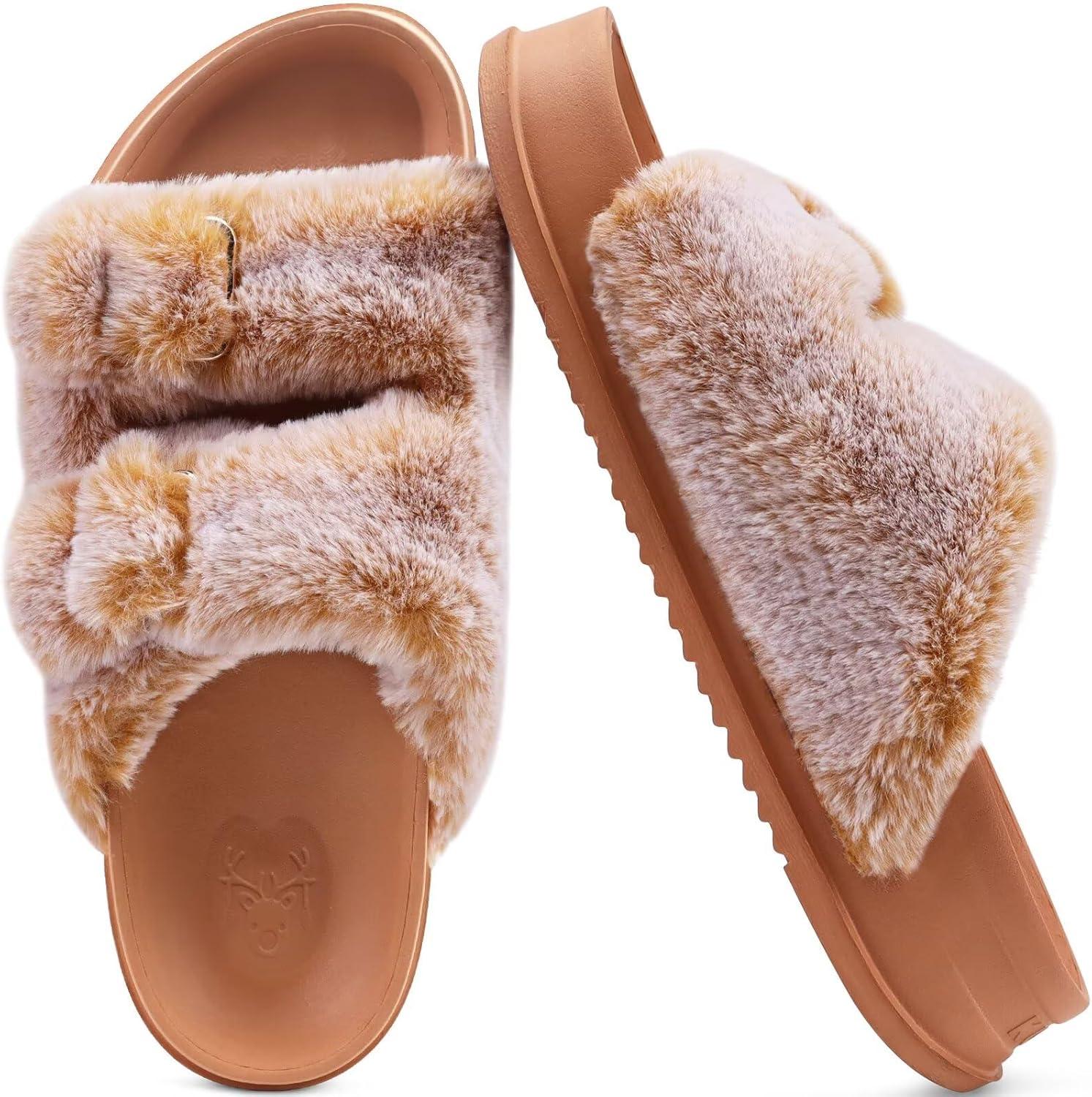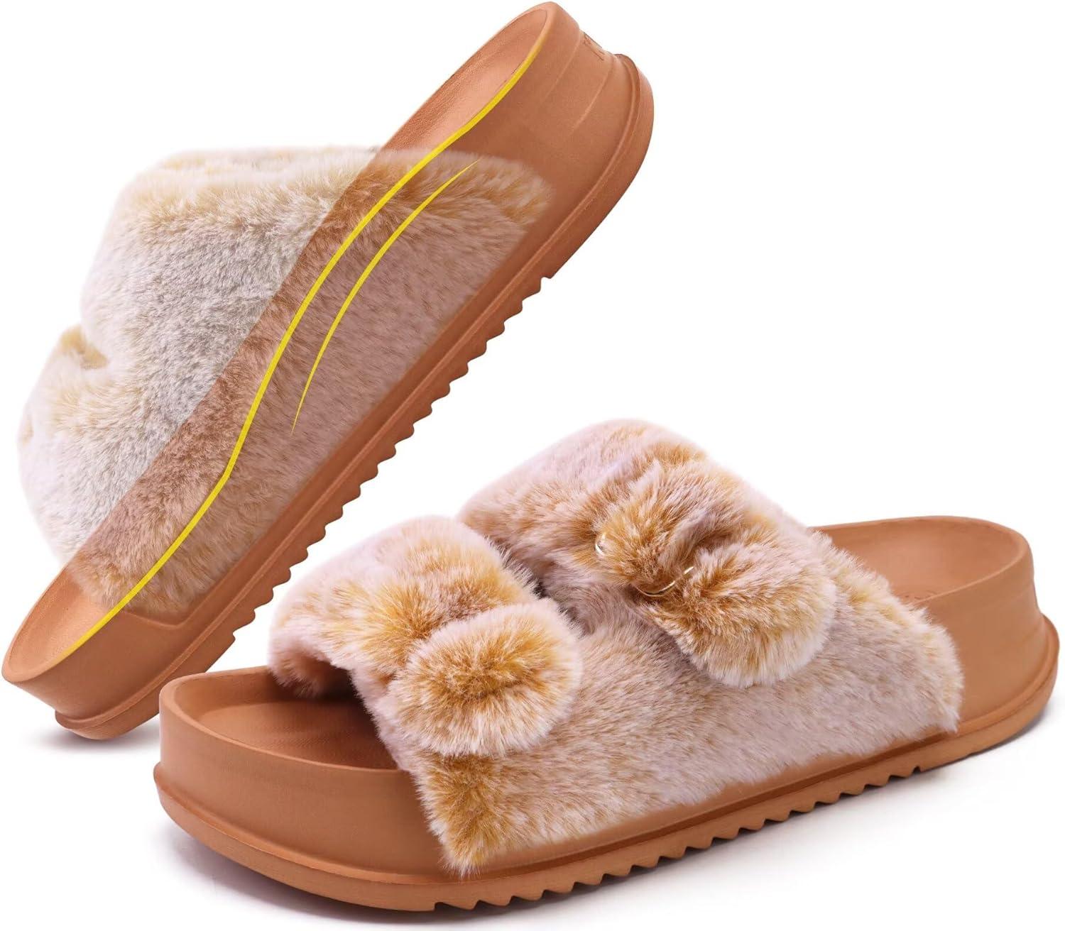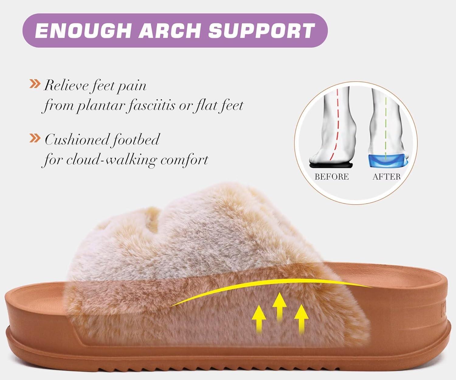 KuaiLu Women's Fluff Slippers Plantar Fasciitis Arch Support Platform Slippers Ladies Fashion Open Toe Faux Fur Sliders Womens House Slipper Size 6-12(Khaki (Tip Dyeing))