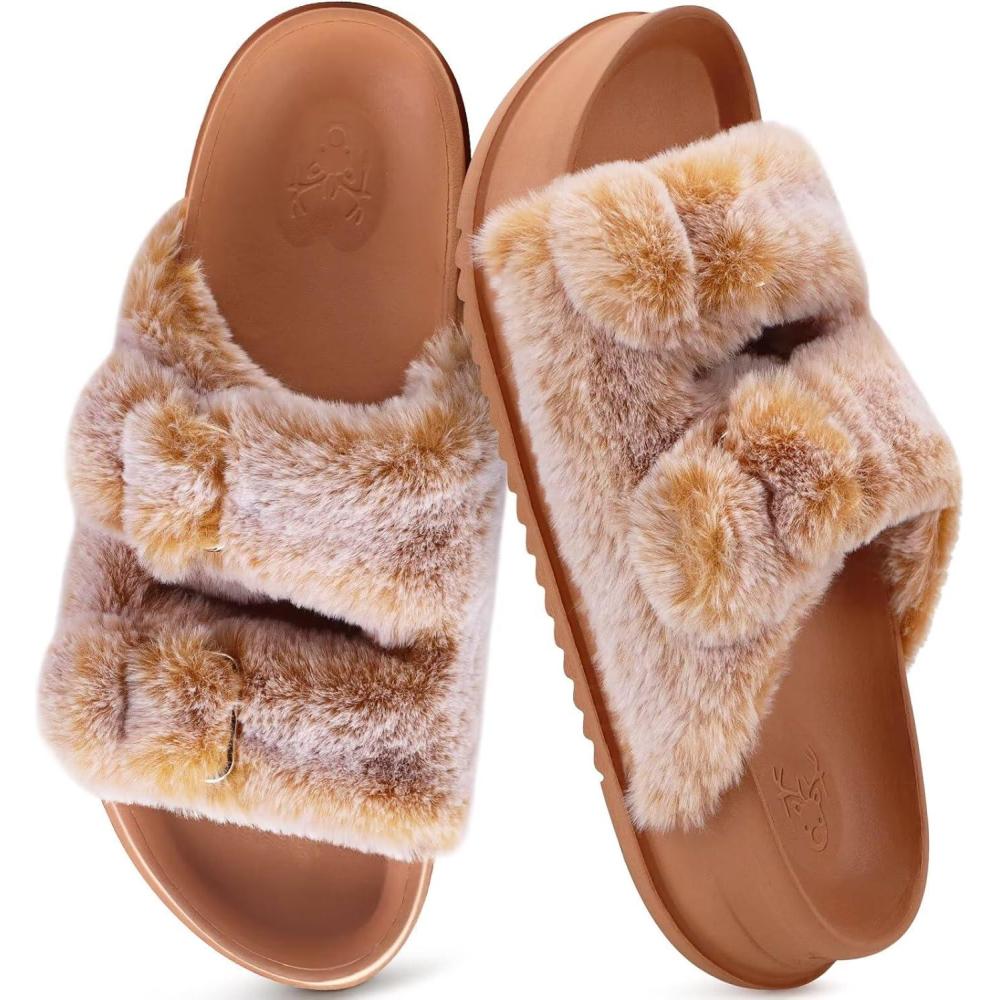 KuaiLu Women’s Fluff Slippers Plantar Fasciitis Arch Support Platform Slippers Ladies Fashion Open Toe Faux Fur Sliders Womens House Slipper Size 6-12(Khaki (Tip Dyeing))