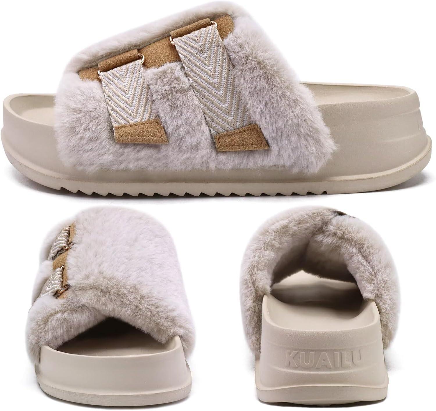 KuaiLu platform slippers for women are made from premium faux fur with soft and supportive EVA foam. Skin-friendly thick Plush upper meets open toe design, women's fur sliders is warm but breathable, gentle touch can care for your feet, suitable for spring, summer, fall and winter. Two stylish elastic band are specially designed for chic and elegant woman, lady or girls, one of them is stretchy but not adjustable. Ergonomic arch support footbed, soft cushioned pad and deep heel cup to build the most comfortable orthopedic slide slippers for women, reduces your feet fatigue, extremely comfy. Lightweight and flexible non-slip pattern outsole, prevents slipping or sliding, suitable for indoor and outdoor wear.
