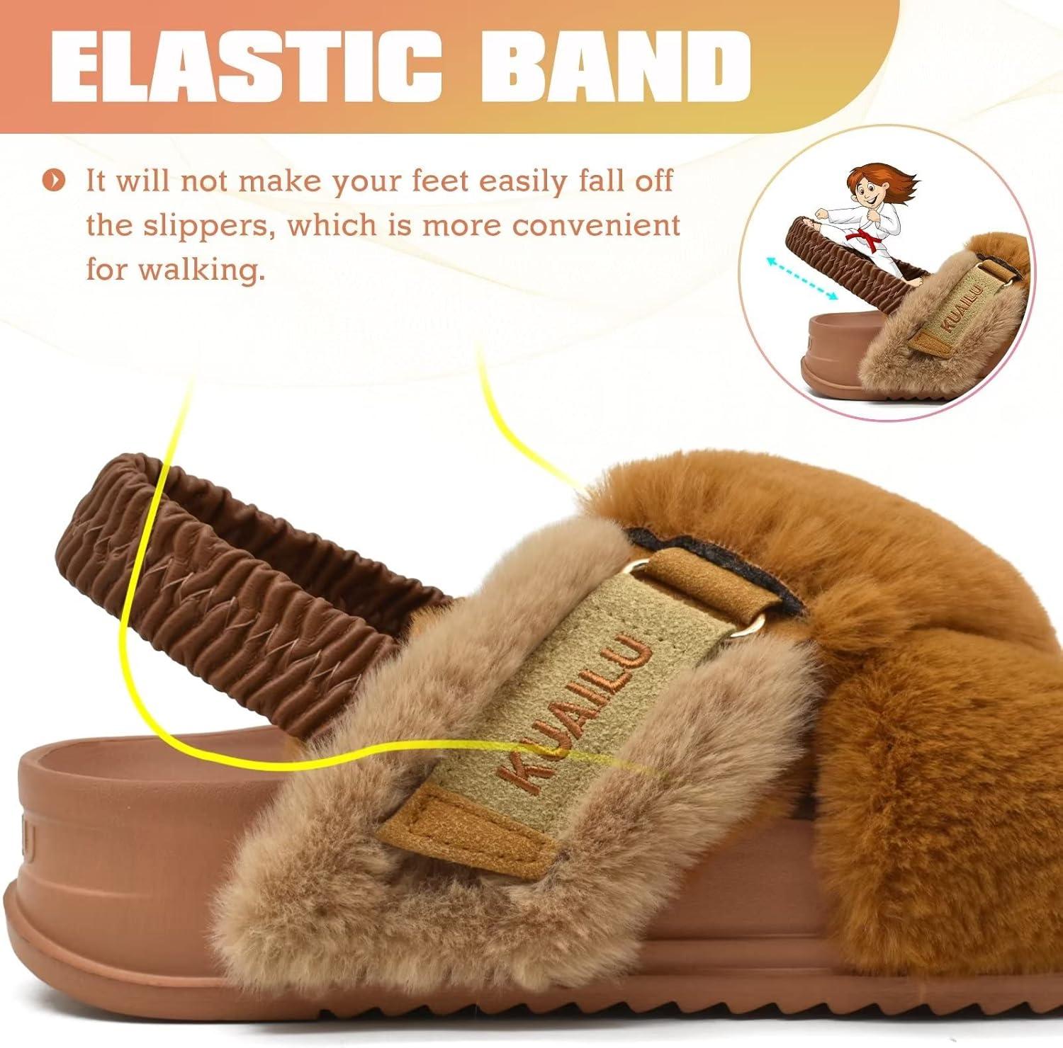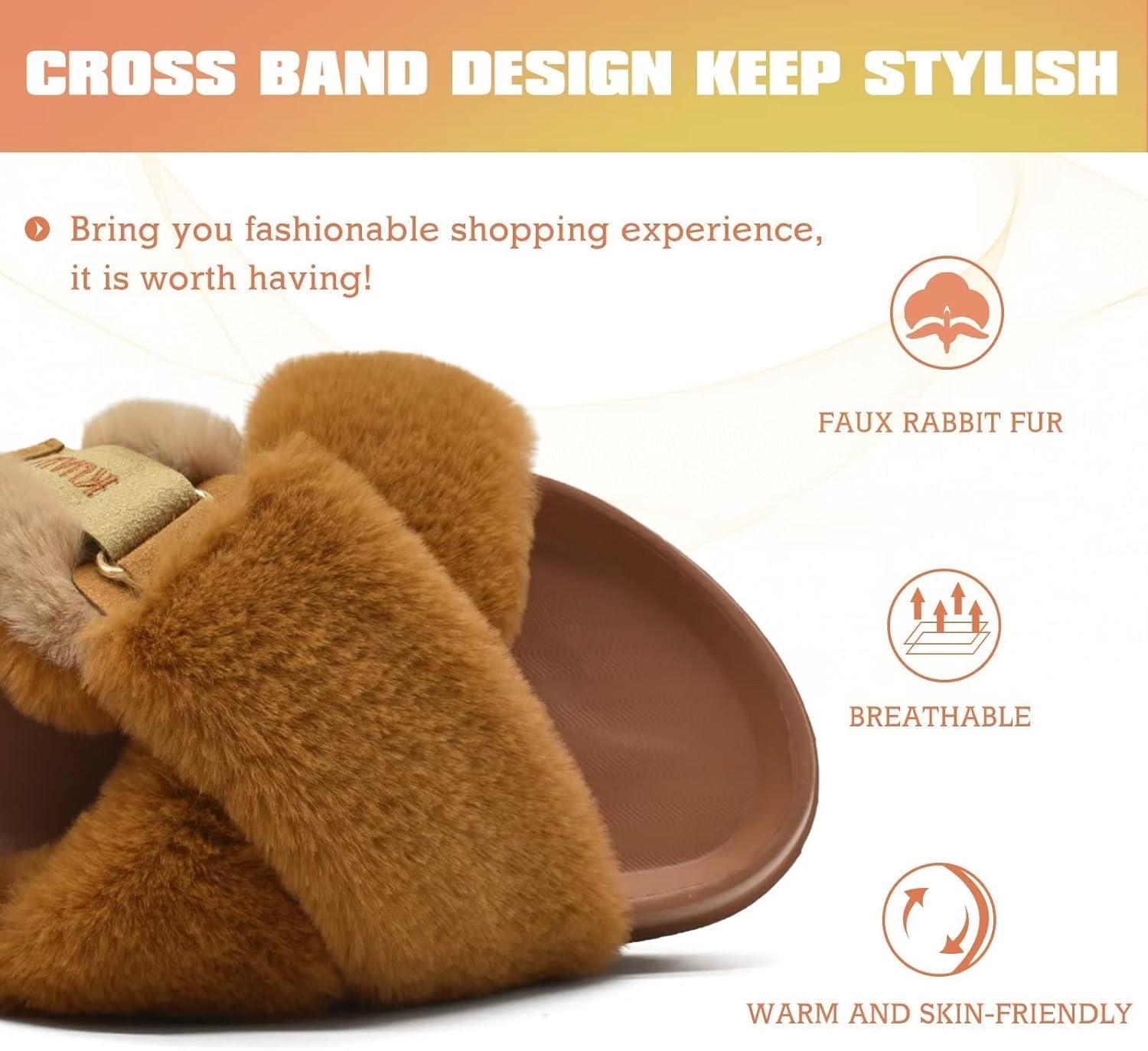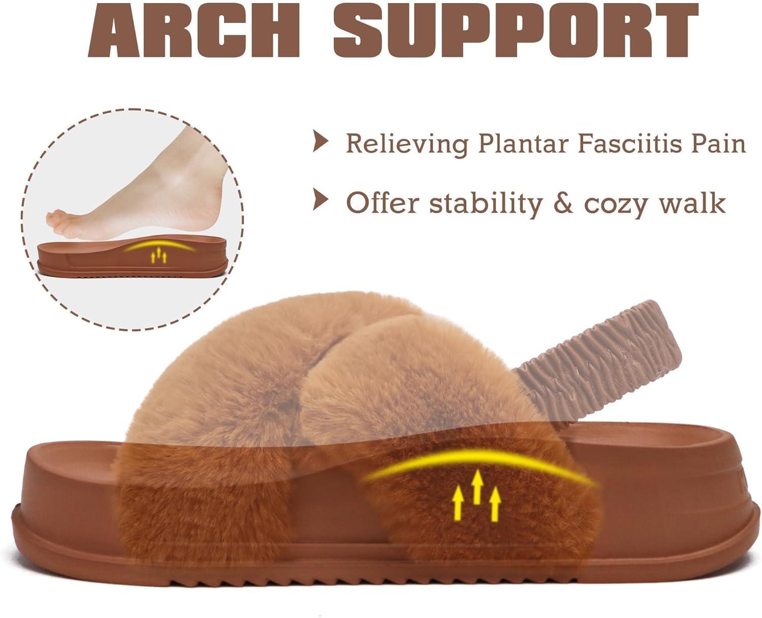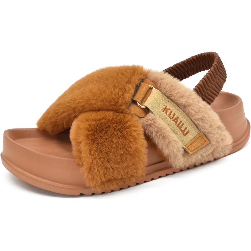 imageKuaiLu Womens Fuzzy Criss Cross Band Platform Slippers Arch Support Furry Faux Fur Ladies Open Toe Cozy Soft Plush Fleece Comfy House Shoes SandalsTan