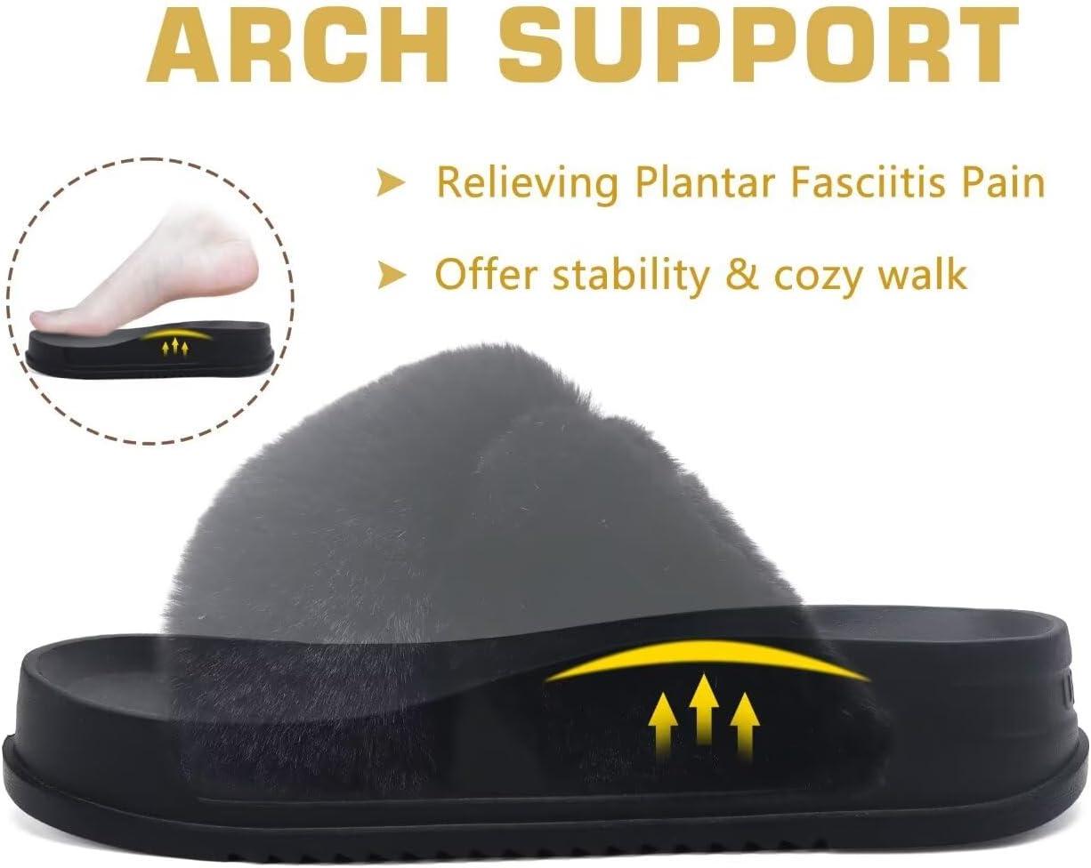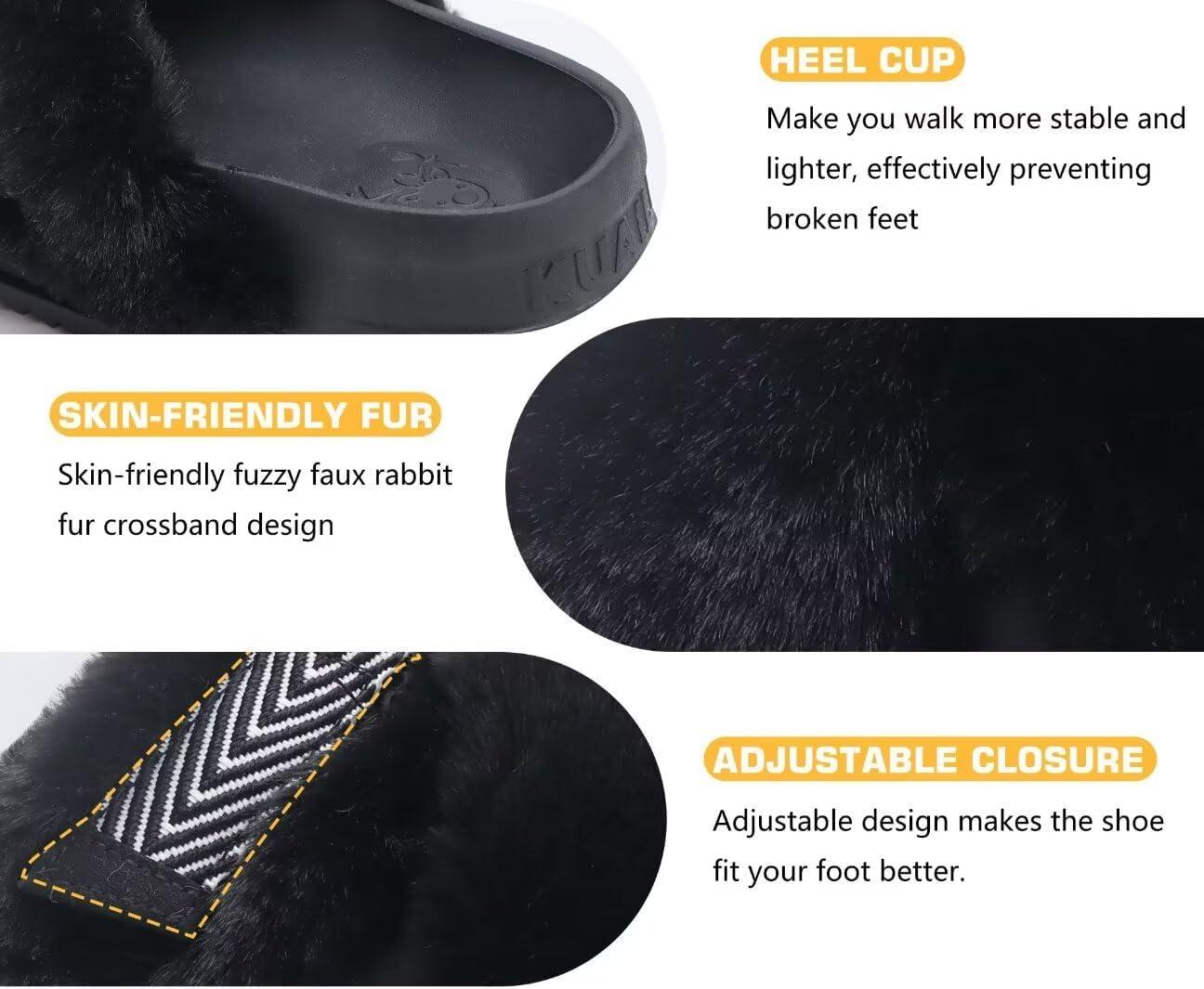 KuaiLu Women’s Fuzzy Cross Band Platform Slippers Comfortable Faux Fur Open Toe Arch Support Slides Slippers for Indoor Outdoor(Black)