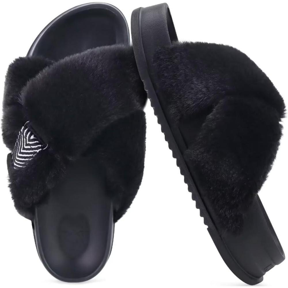 KuaiLu Women’s Fuzzy Cross Band Platform Slippers Furry Faux Fur Comfortable Arch Support Open Toe Slides for Indoor Outdoor(Black)