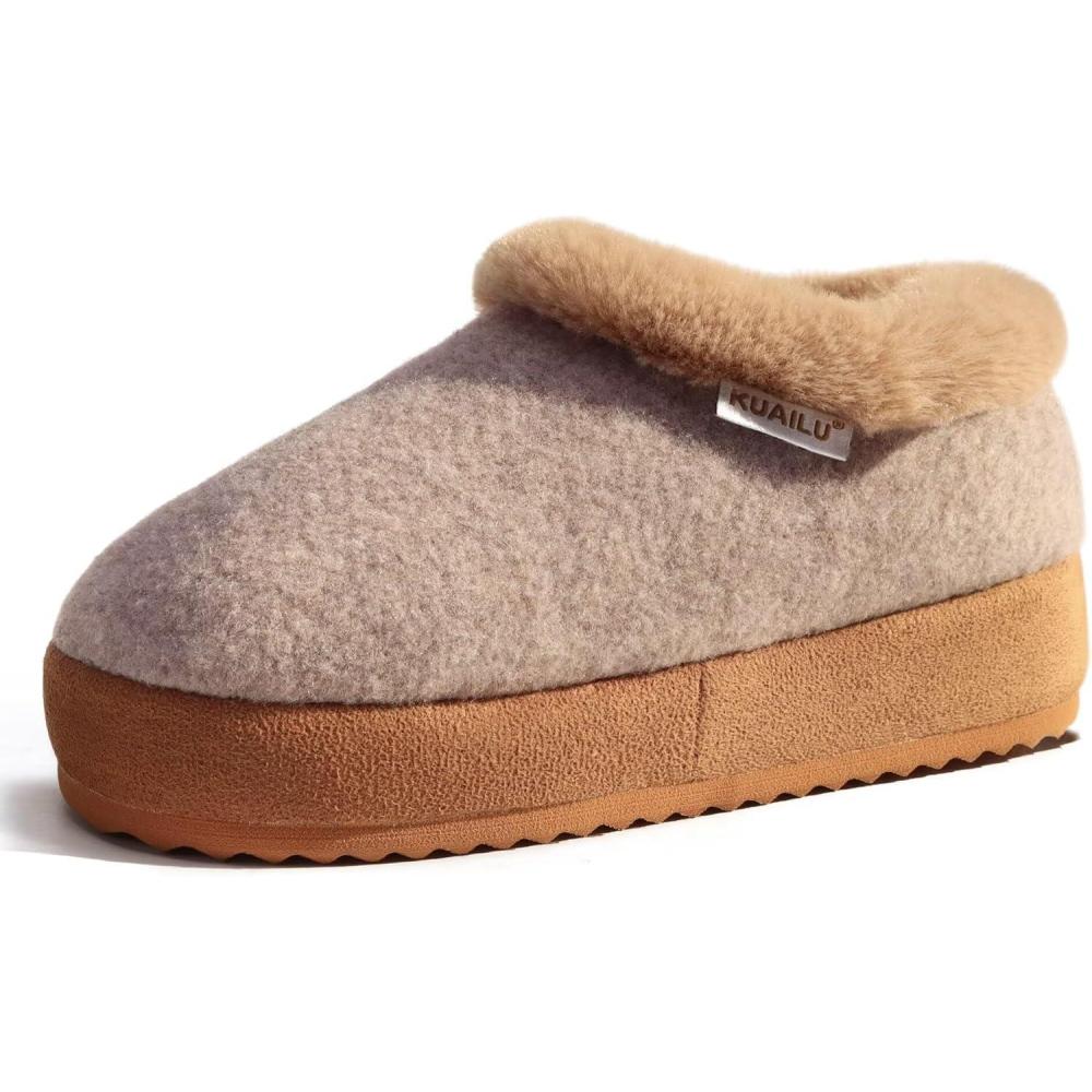 KuaiLu Womens House Platform Slippers Cozy Fuzzy Plush Knit Slipper Ladies Warm Fur Lined Winter Slip On Home Bedroom Thick Cushion Shoes Indoor Outdoor Hard Sole(Khaki)