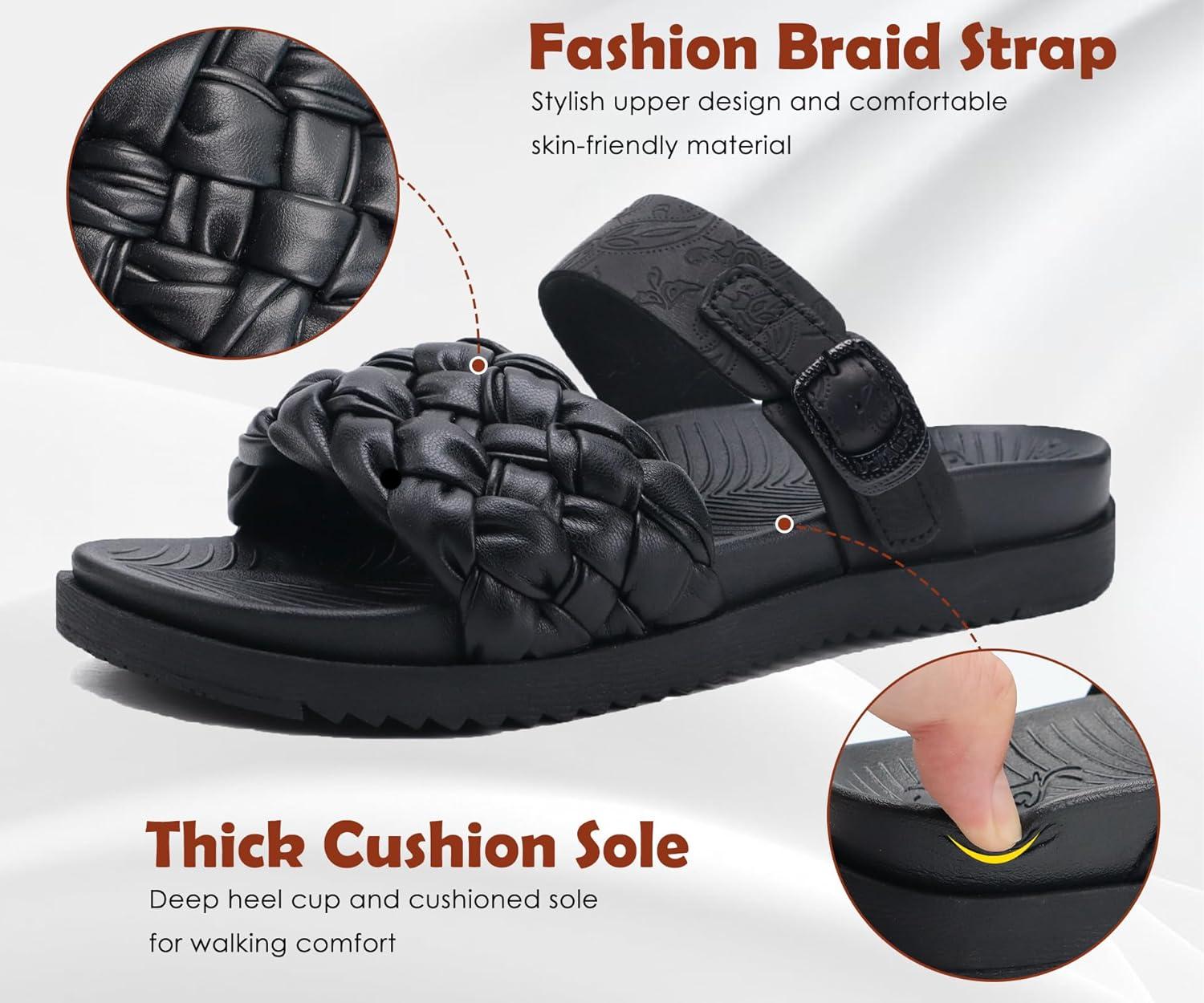 KuaiLu Womens Orthopedic Sandals Comfortable Arch Support Fashion Summer Beach Dressy Sandals With Leather Braided Adjustable Open Toe Cushion Travel Outdoor Plantar Fasciitis Shoes US Size5-11(Black)