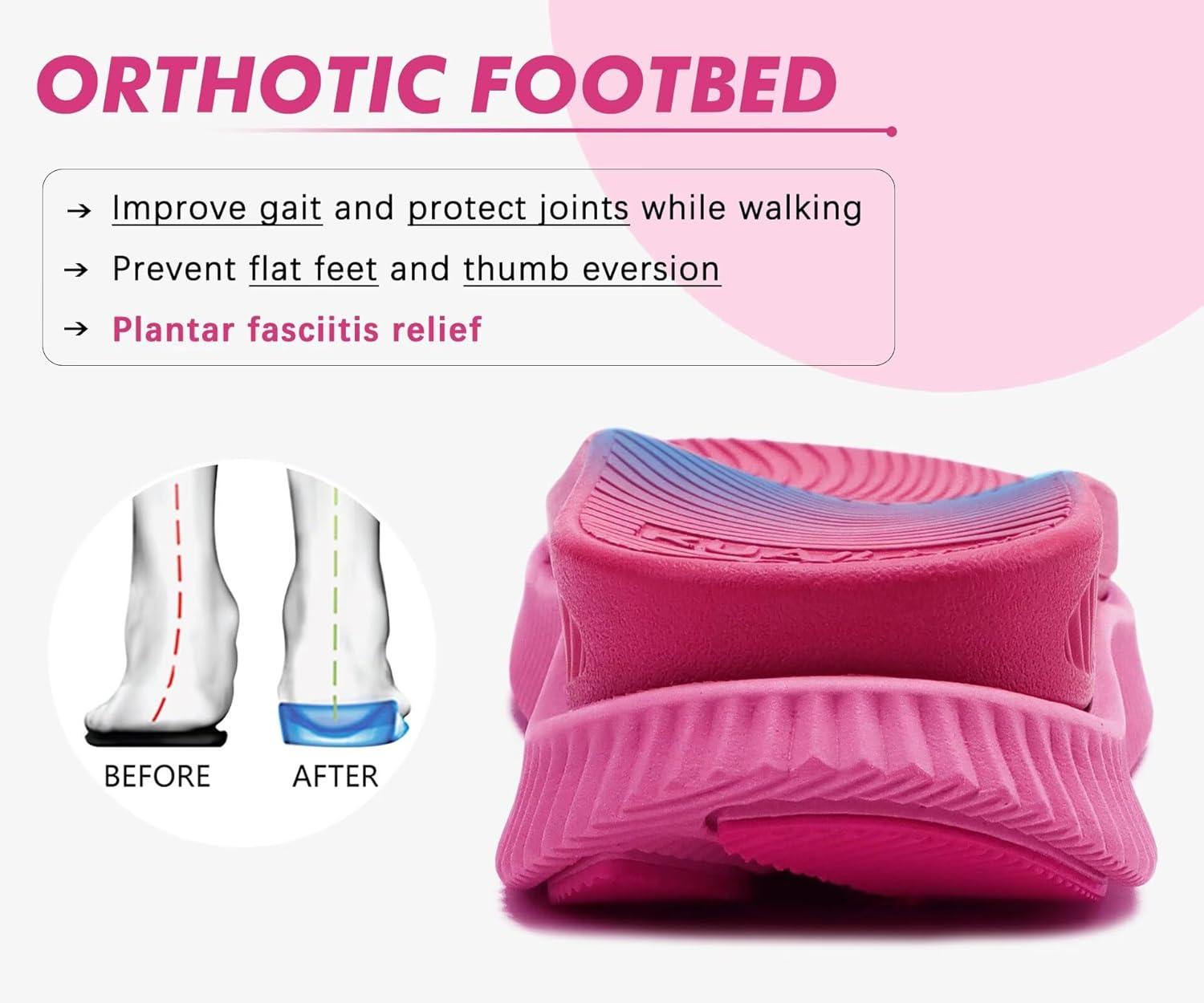 Recovery sandals with arch support can reduce the pressure and fatigue for long distances walking.