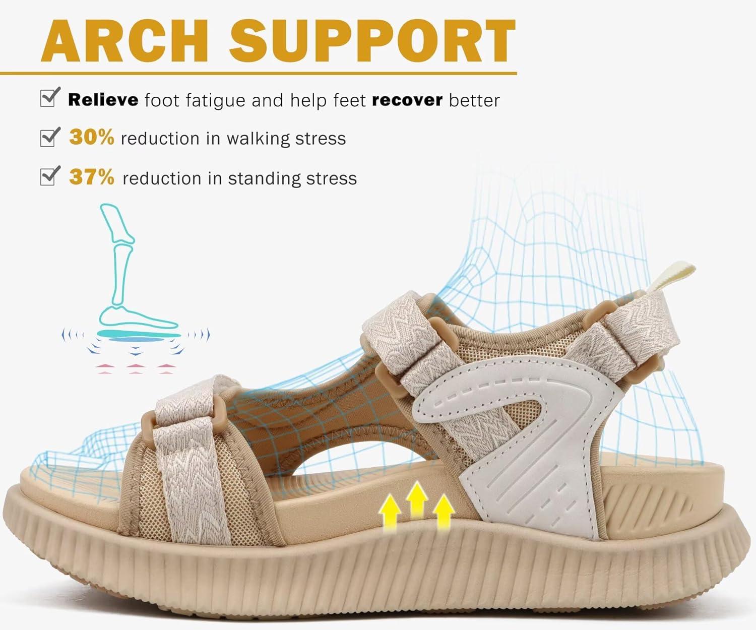KuaiLu Womens Orthopedic Walking Sandals with Comfortable Arch Support Recovery Sport Relief Plantar Fasciitis Summer Outdoor Hiking Adjustable Strap Platform Cushion Shoes(Light Beige)