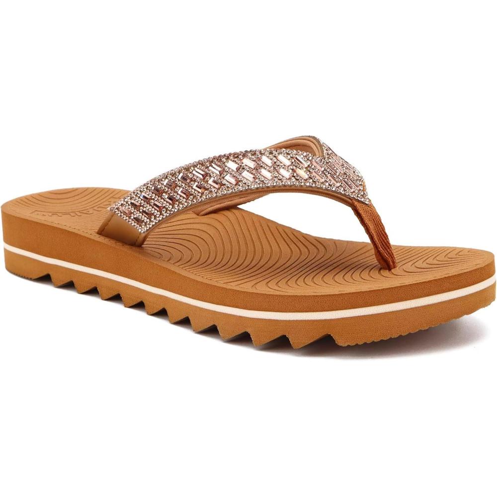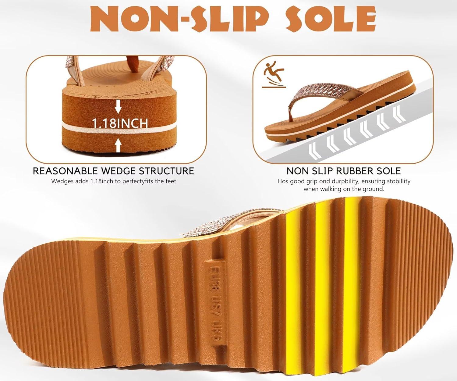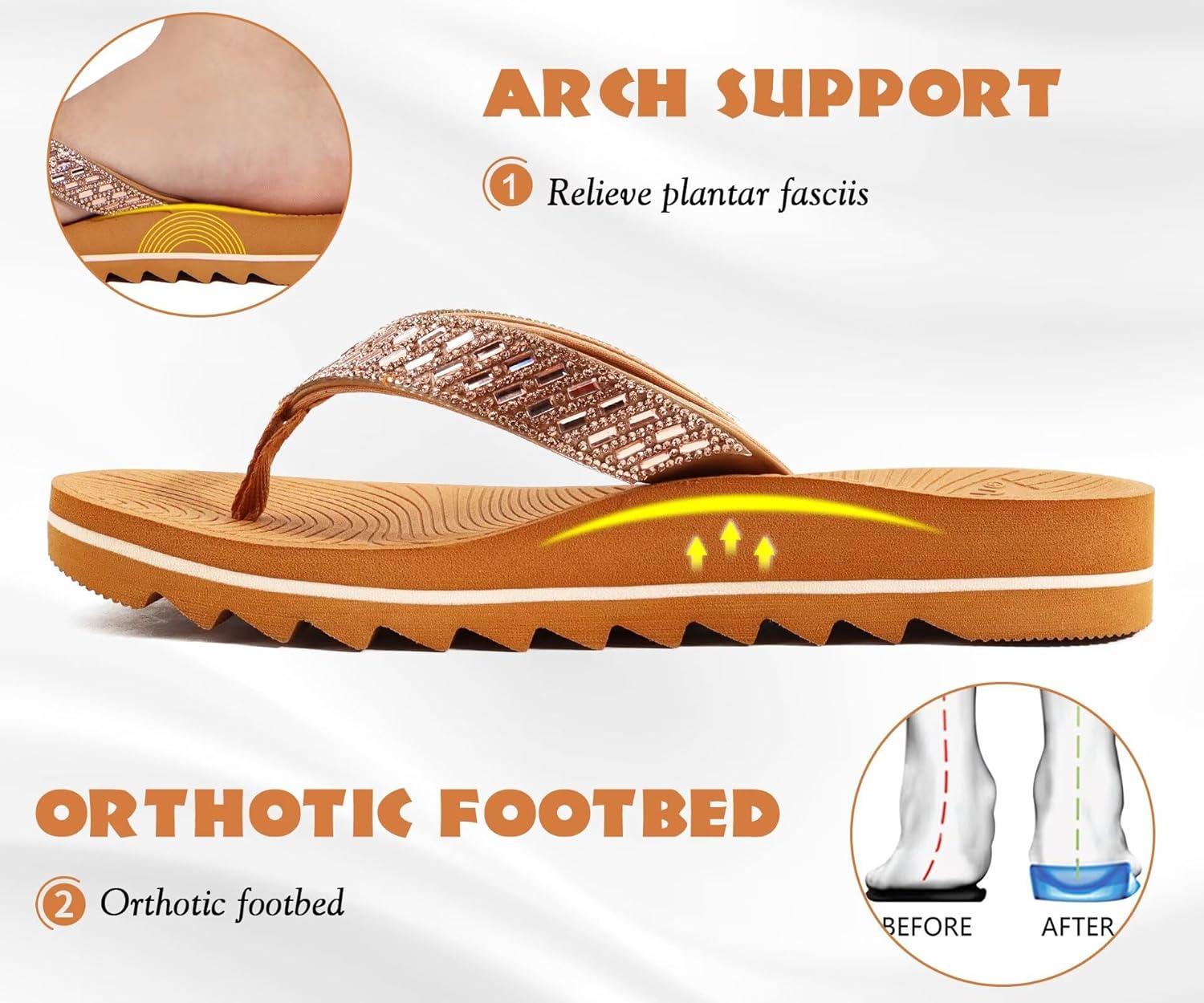 KuaiLu Womens Orthotic Flip Flops with Arch Support Yoga Mat Cushion Fashion Rhinestone Sandals Summer Walking Beach Travel Thong Slides Comfy Plantar Fasciitis Indoor Outdoor Sandles US5-11(Khaki)