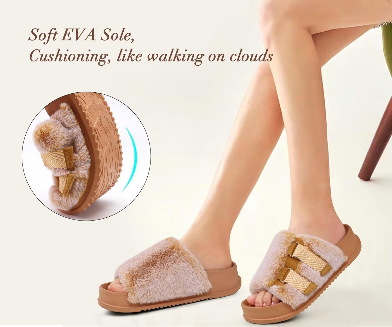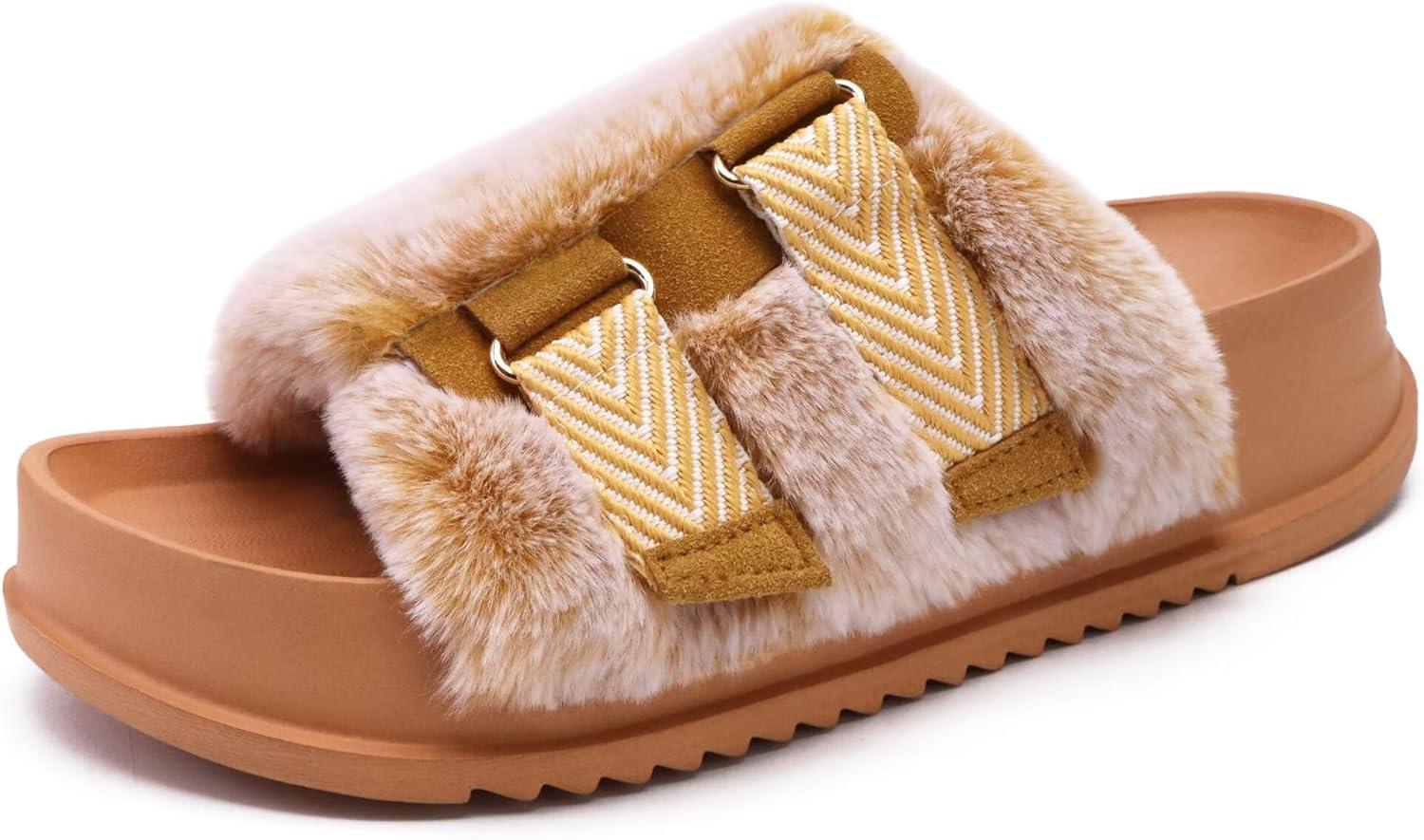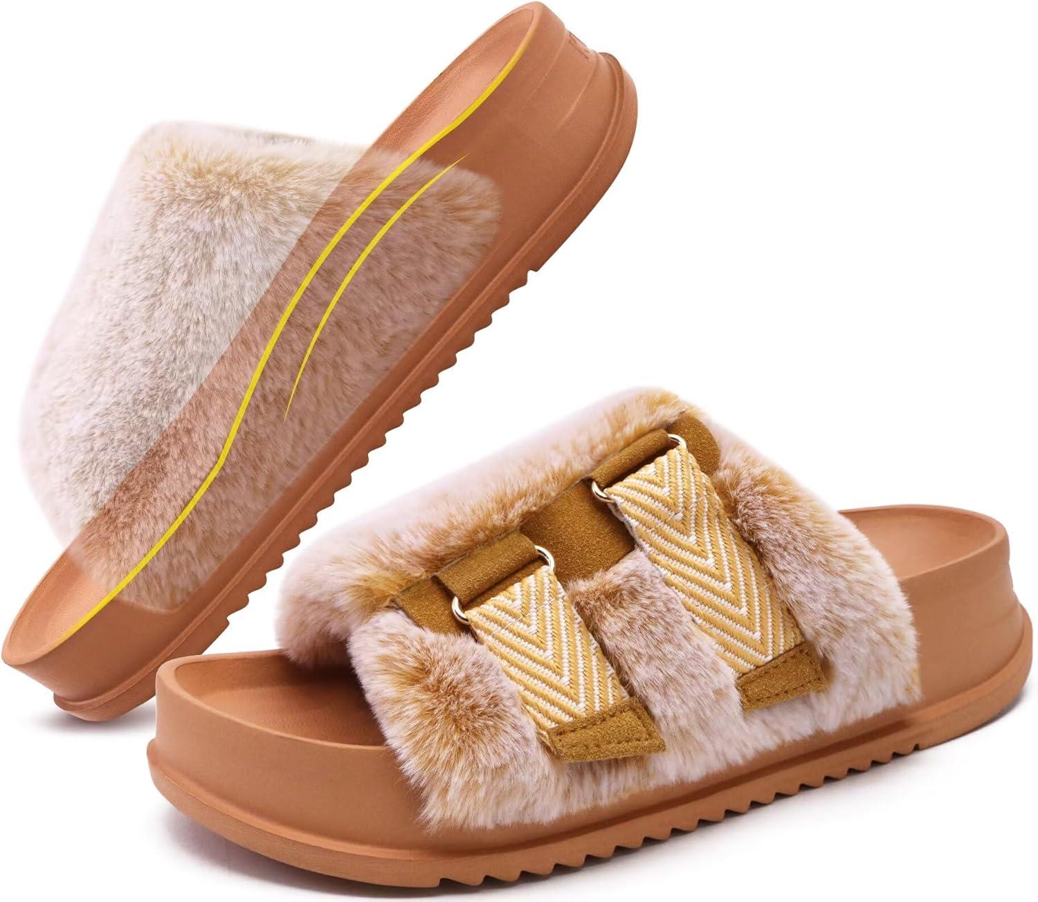KuaiLu Womens Orthotic Sandals Comfortable Arch Support Faux Fur Sandal Slippers Casual Summer Adjustable Cushion Slides Slip On Indoor Outdoor House Shoes