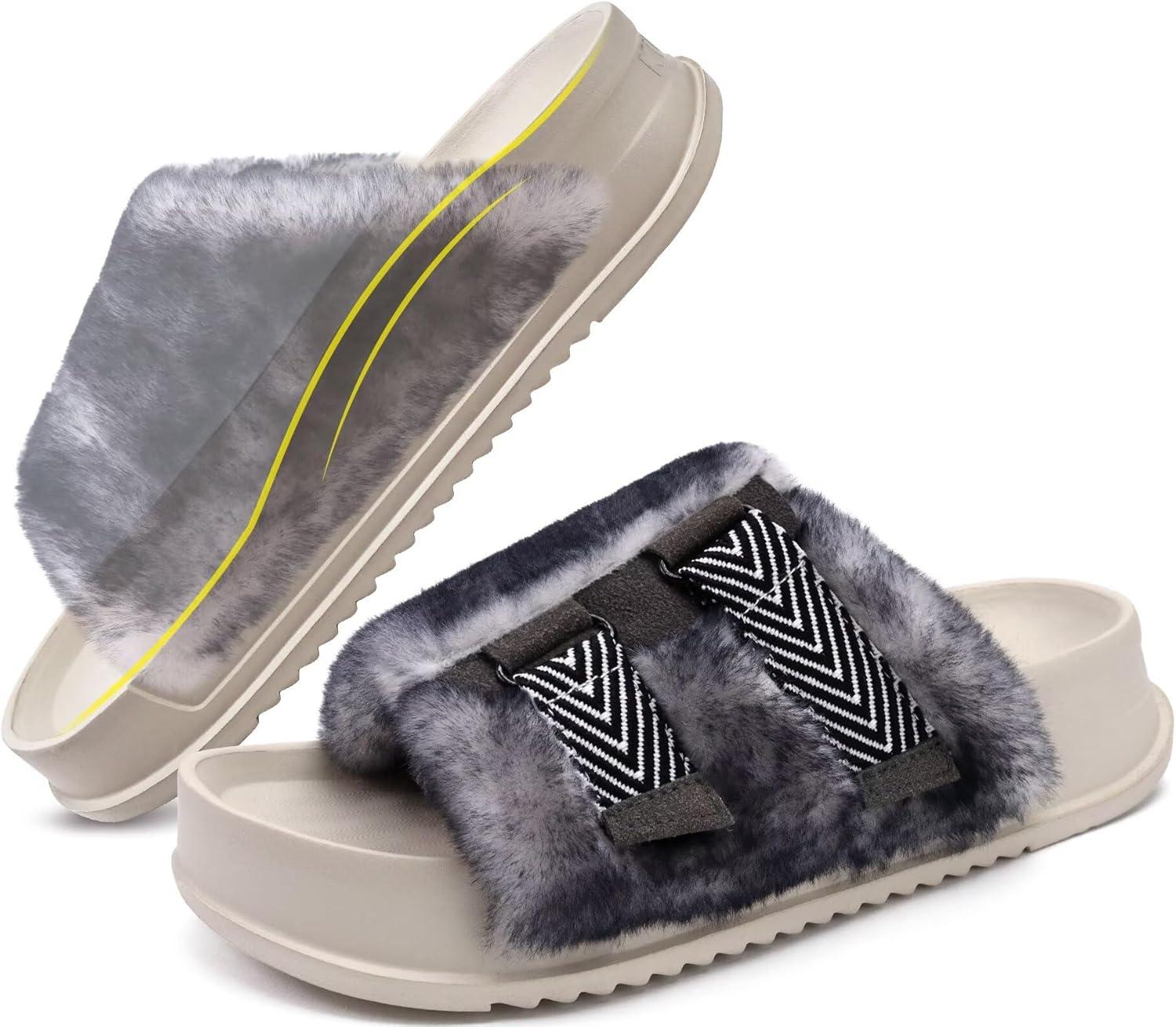 KuaiLu Womens Orthotic Slippers Comfortable Arch Support Faux Fur Slipper Sandals Casual Summer Adjustable Cushion Slides Slip On Indoor Outdoor House Shoes - Ultra-soft Comfort Fit Footbed(White Black (Tip Dyeing))