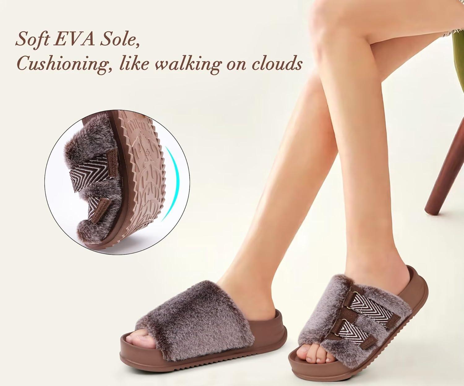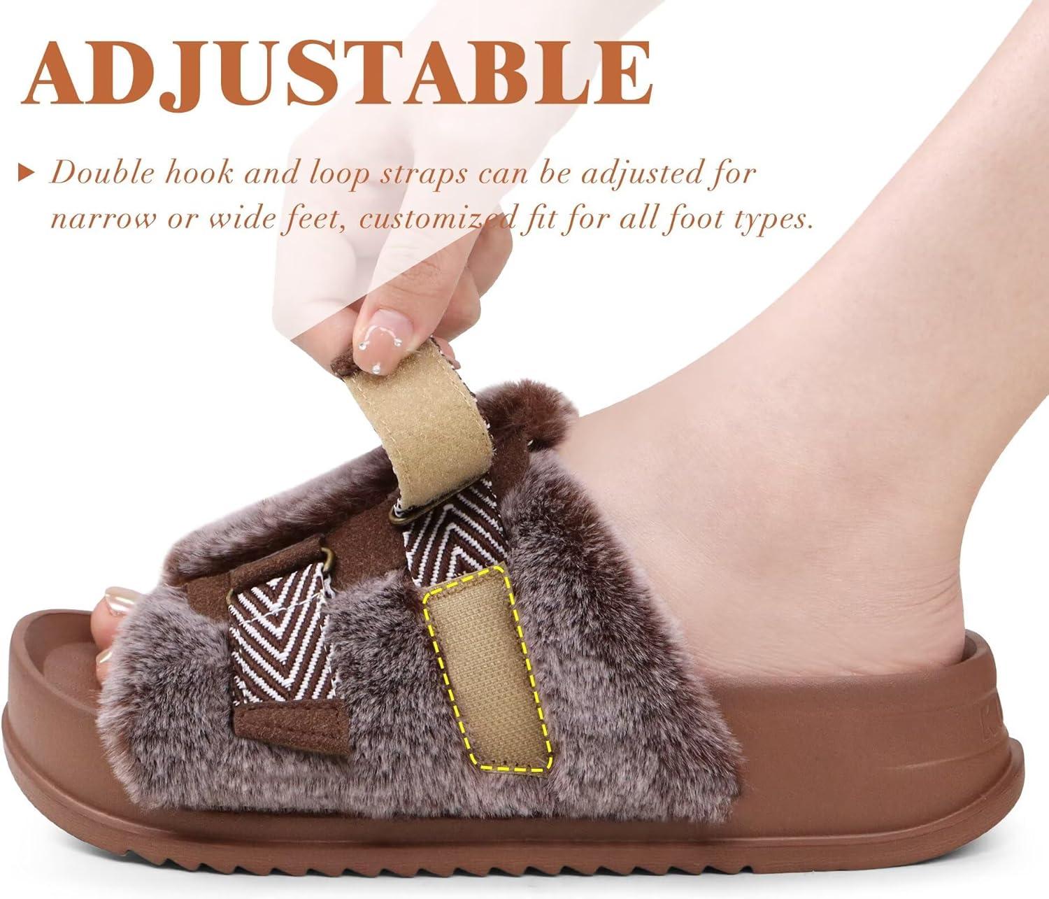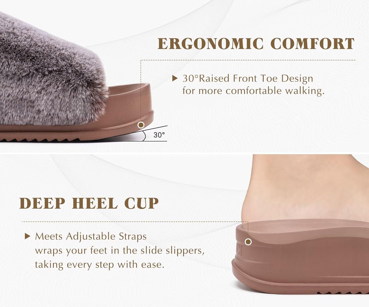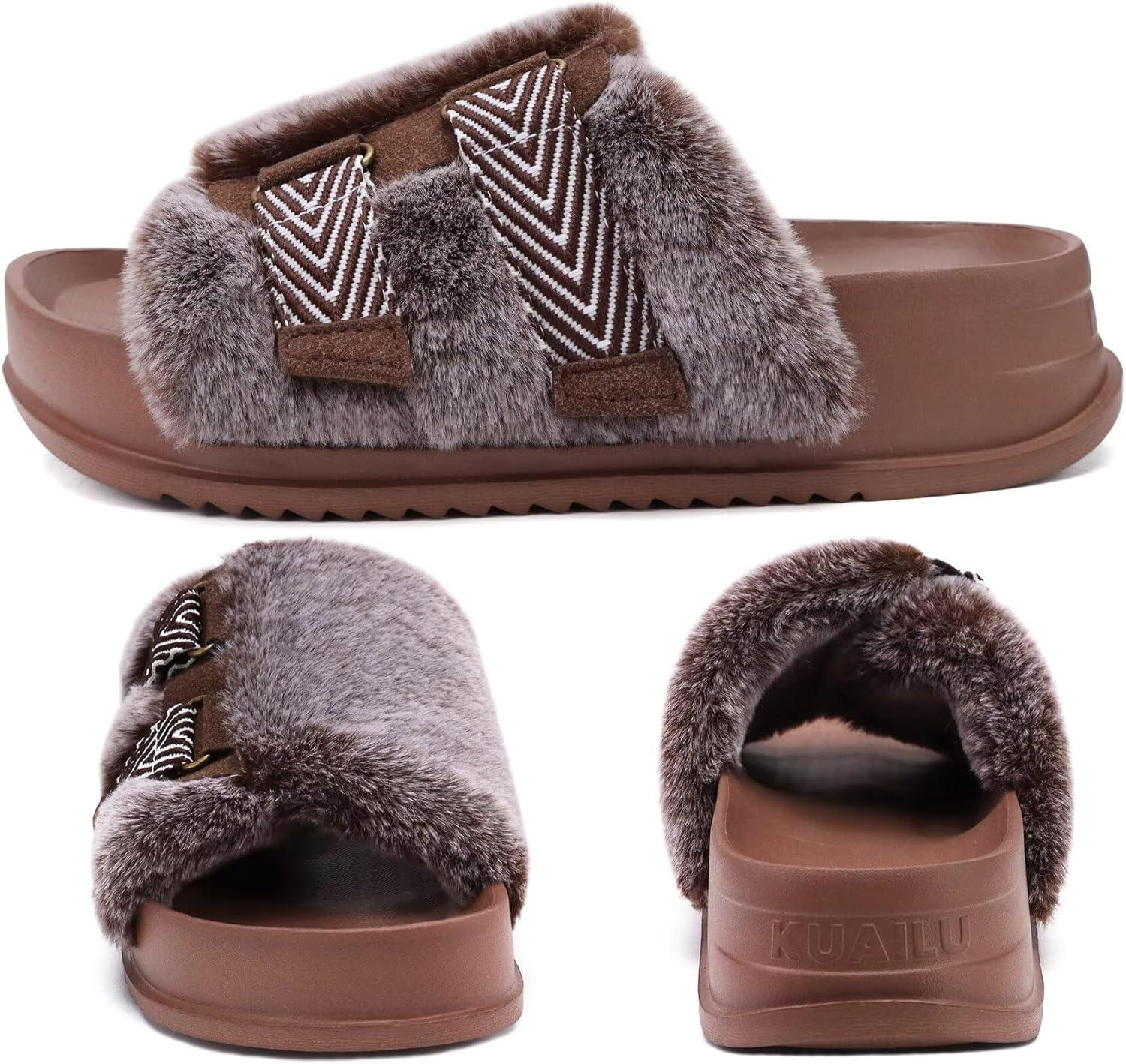 KuaiLu all-day comfort platform slippers are made from premium faux fur with soft and supportive EVA foam. Luxurious thick plush touch upper care for your feet. Women's open toe slippers allow toes to breathe freely, keep them dry and give feet a comfortable environment. Adjustable design, also suitable for people with wide feet and high instep. Ergonomic footbed and non-skid indoor/outdoor rubber bottom are perfect no matter at home or go out for a walk. Fashionable color matching design is loved by ladies of all ages and perfect as a thoughtful gifts for your loved ones on Birthdays, upcoming Thanksgiving Day, Christmas, New Year, Valentine's Day and Anniversaries.