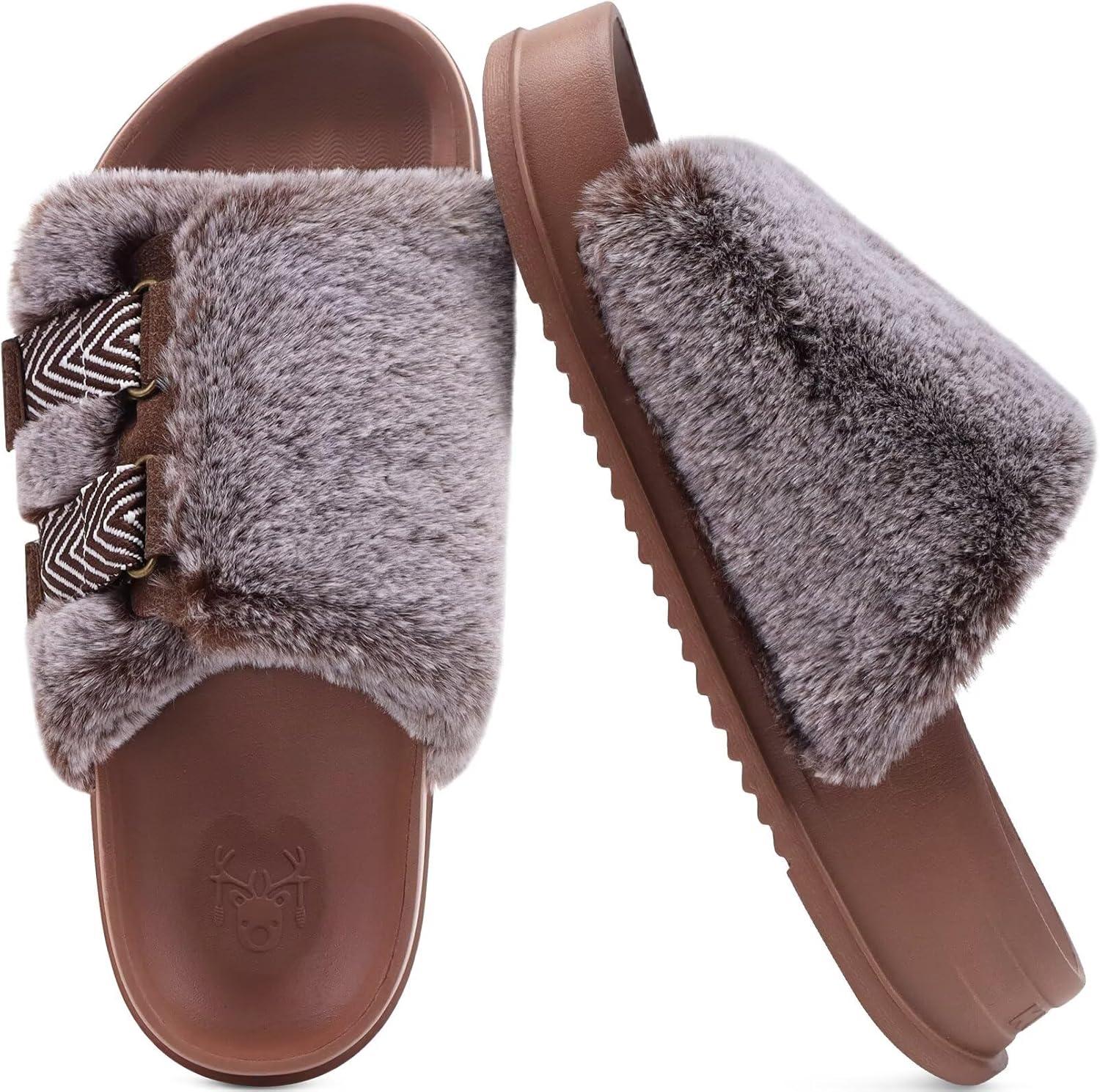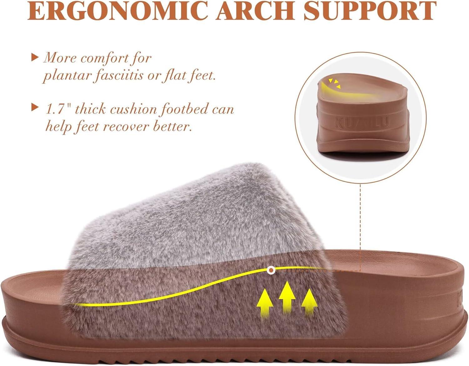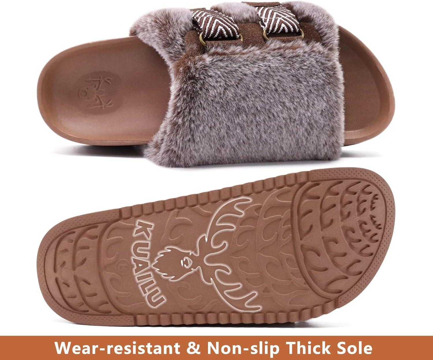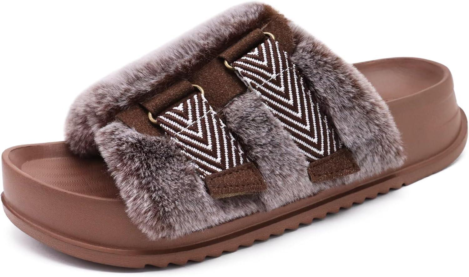KuaiLu all-day comfort platform slippers are made from premium faux fur with soft and supportive EVA foam. Luxurious thick plush touch upper care for your feet. Women's open toe slippers allow toes to breathe freely, keep them dry and give feet a comfortable environment. Adjustable design, also suitable for people with wide feet and high instep. Ergonomic footbed and non-skid indoor/outdoor rubber bottom are perfect no matter at home or go out for a walk. Fashionable color matching design is loved by ladies of all ages and perfect as a thoughtful gifts for your loved ones on Birthdays, upcoming Thanksgiving Day, Christmas, New Year, Valentine's Day and Anniversaries.