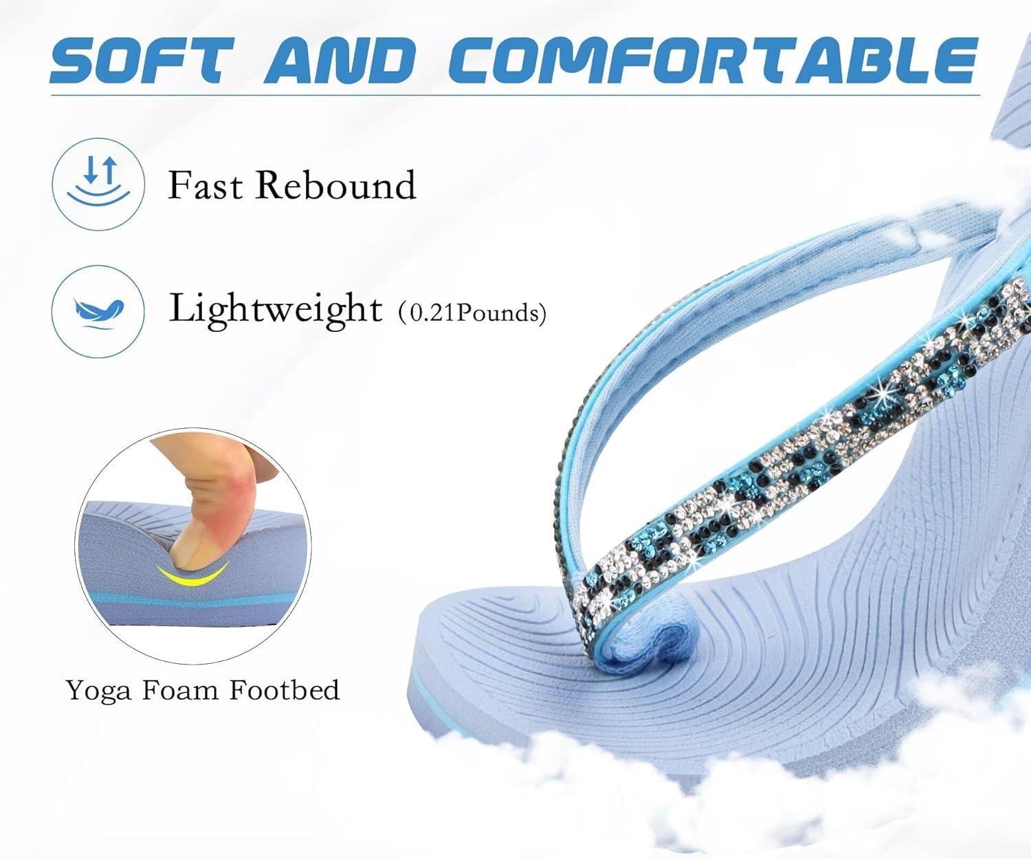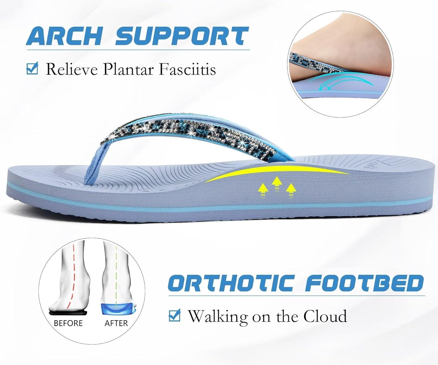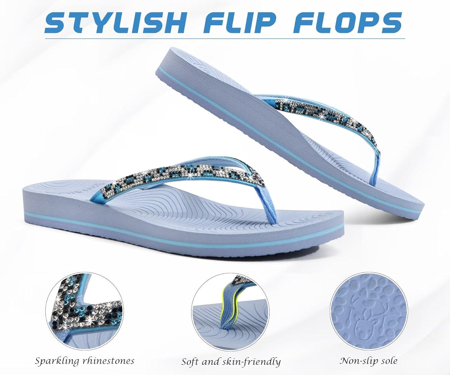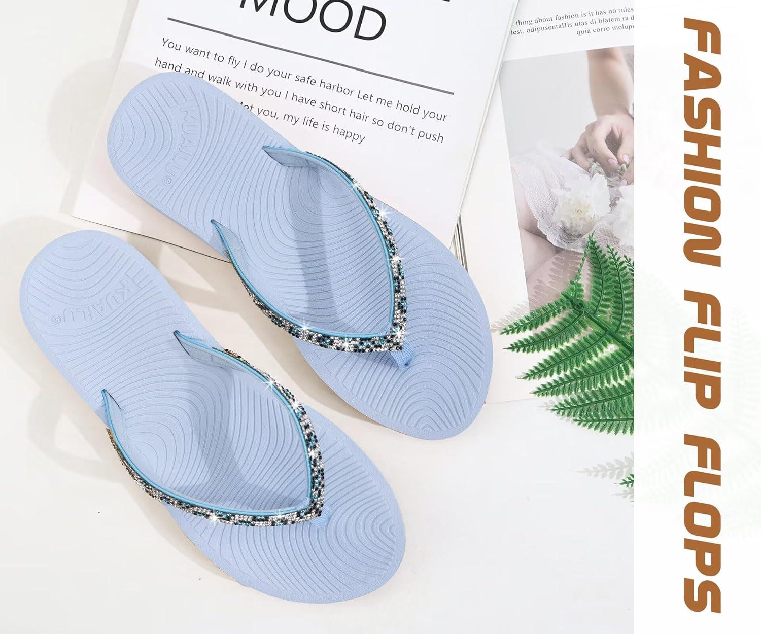 KuaiLu Women's Rhinestone Flip Flops with Comfort Arch Support Yoga Mat Cushion Sandals Fashion Summer Beach Travel Orthotic Walking Thong Sandles Slip on Plantar Fasciitis Indoor Outdoor Shoes(Light Blue)